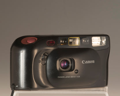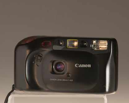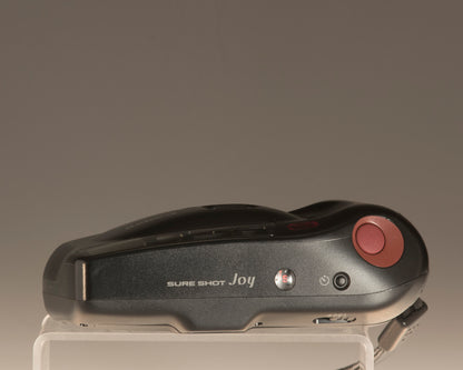 The Canon Sure Shot Joy is an easy-to-use auto focus 35mm camera from the late 1980s. It features a sharp 35mm f4.5 lens (3 elements in 3 groups). It also features a very novel 'burst mode' option where you can select 2,3, or 4 shots to fire in sequence with a single press of the shutter--very handy for capturing action.
