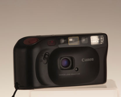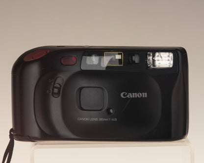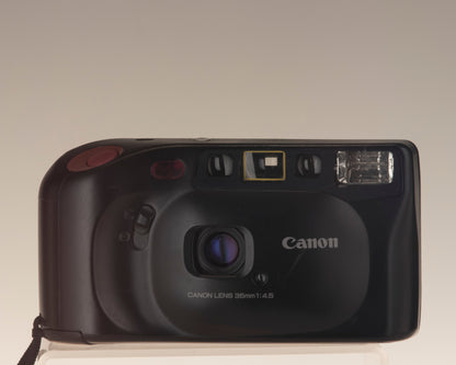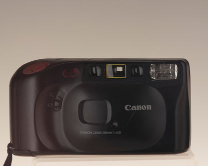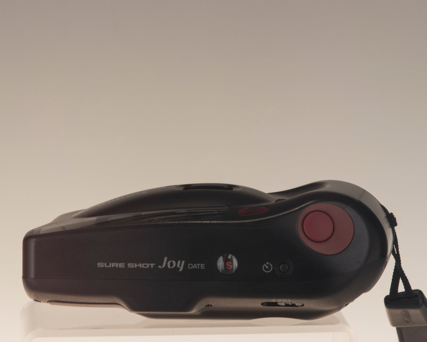 The Canon Sure Shot Joy is an easy-to-use auto focus 35mm camera from the late 1980s. It features a sharp 35mm f4.5 lens (3 elements in 3 groups). It also features a very novel 'burst mode' option where you can select 2,3, or 4 shots to fire in sequence with a single press of the shutter--very handy for capturing action.