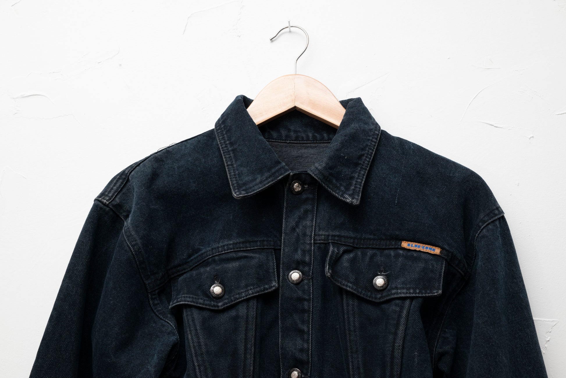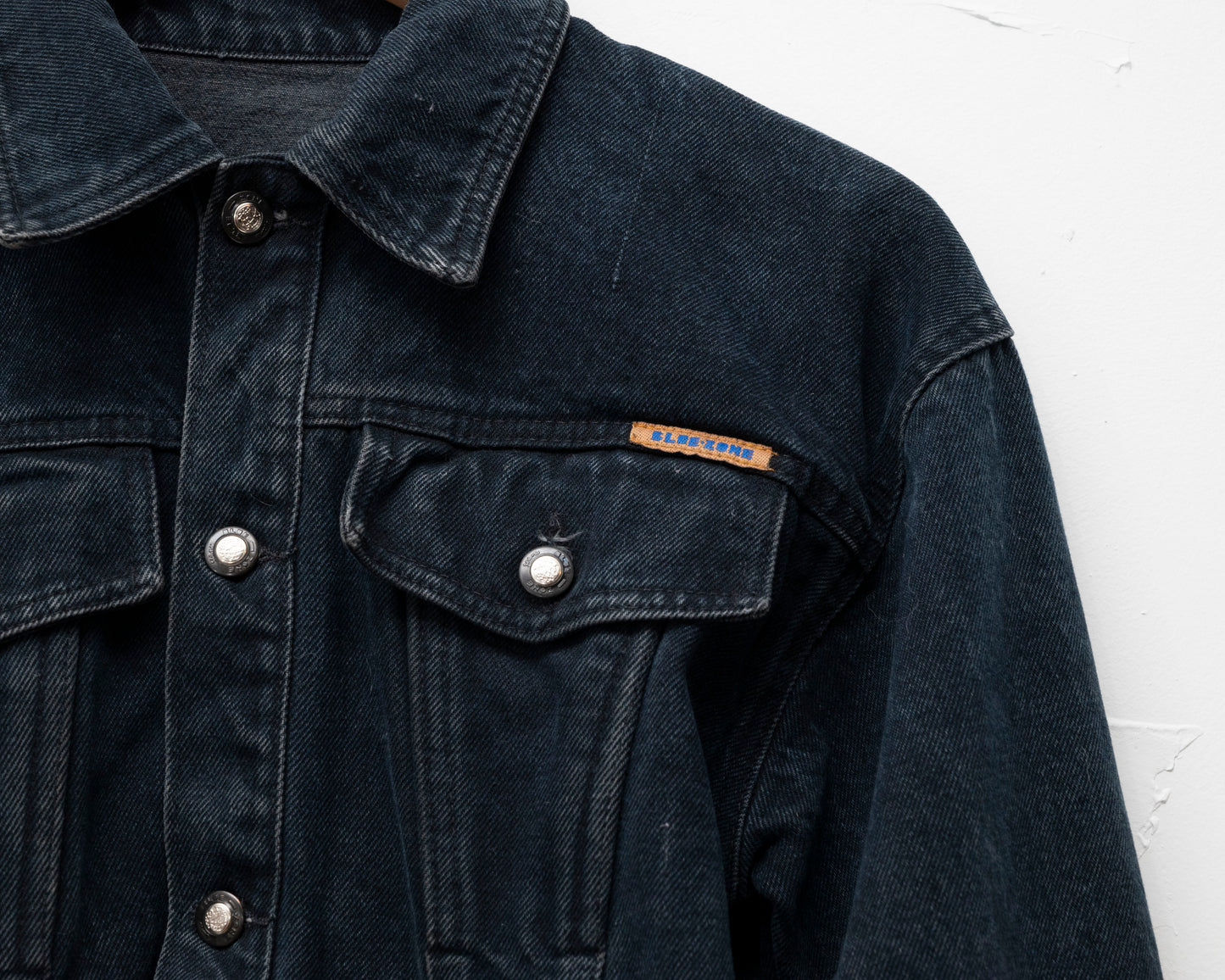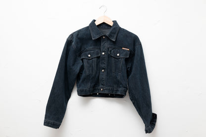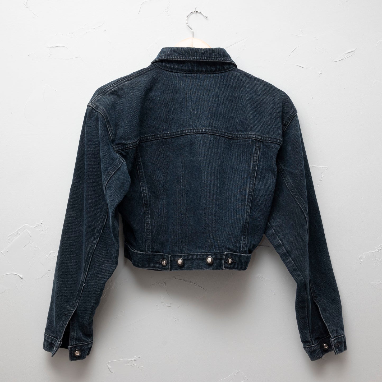 Cropped denim Blue Zone jacket. Thick, soft denim in deep navy, almost black depending on the light. The buttons have tiny globes.