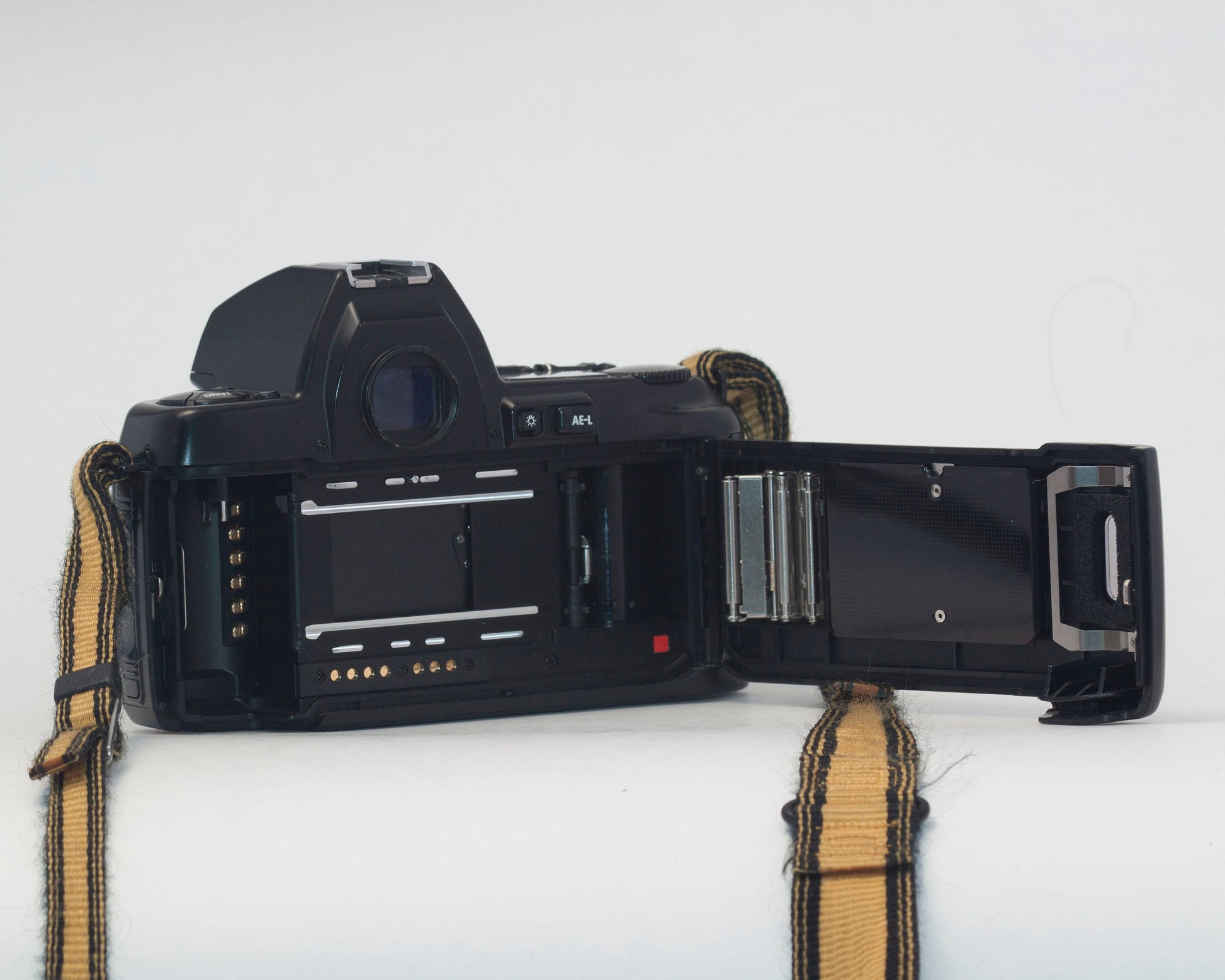 The Nikon S-801S is an advanced 35mm film SLR from the early '90s with manual or autofocus; a choice of manual, aperture priority, shutter priority or three different program exposure modes. The included AF Nikkor 50mm f1.8 is a very sharp lens with lovely bokeh. This is a superb camera and lens combination for demanding art photography, offering many advanced features (like double exposure, multiple program modes, depth of field preview, etc.) and a very accurate light meter.
