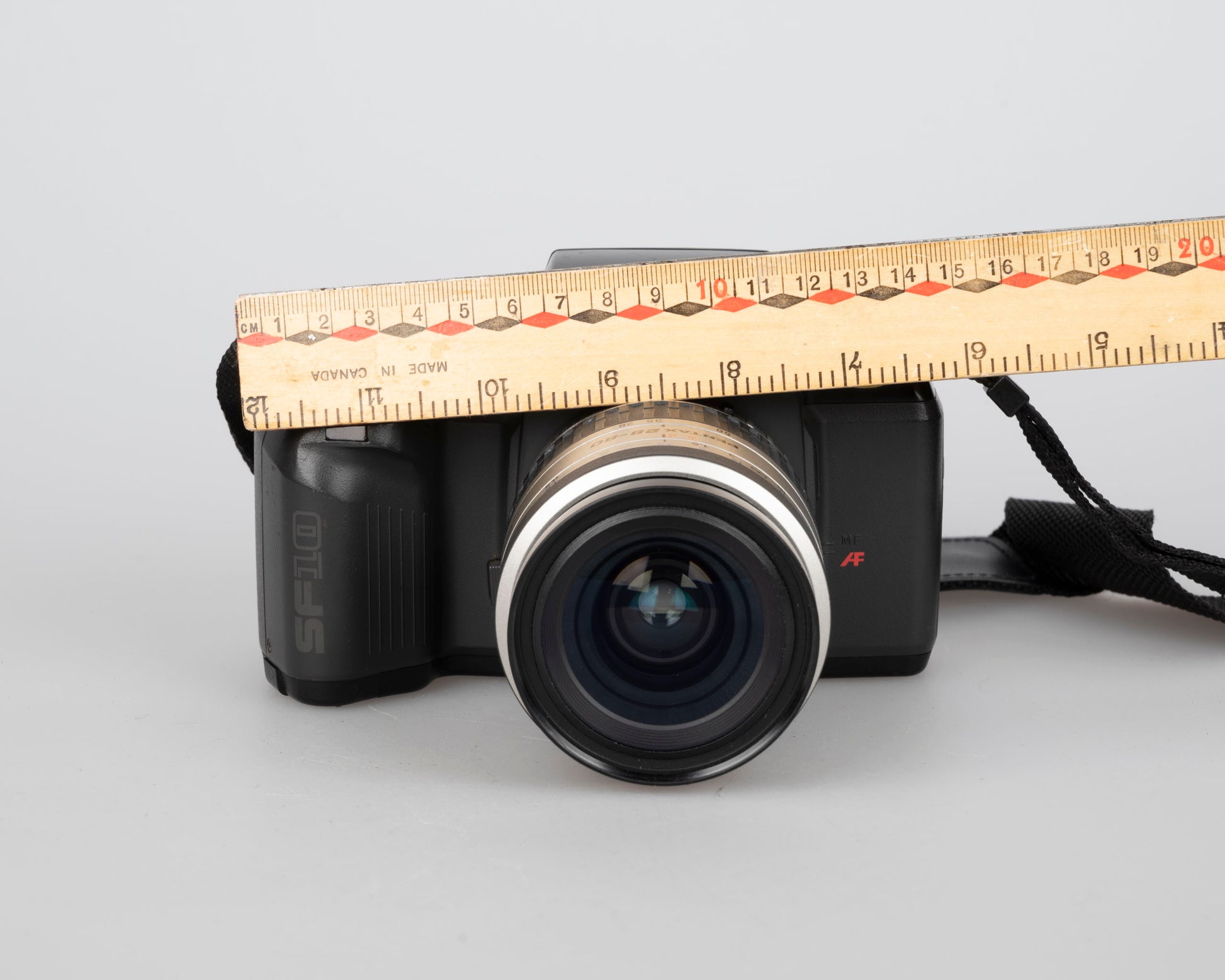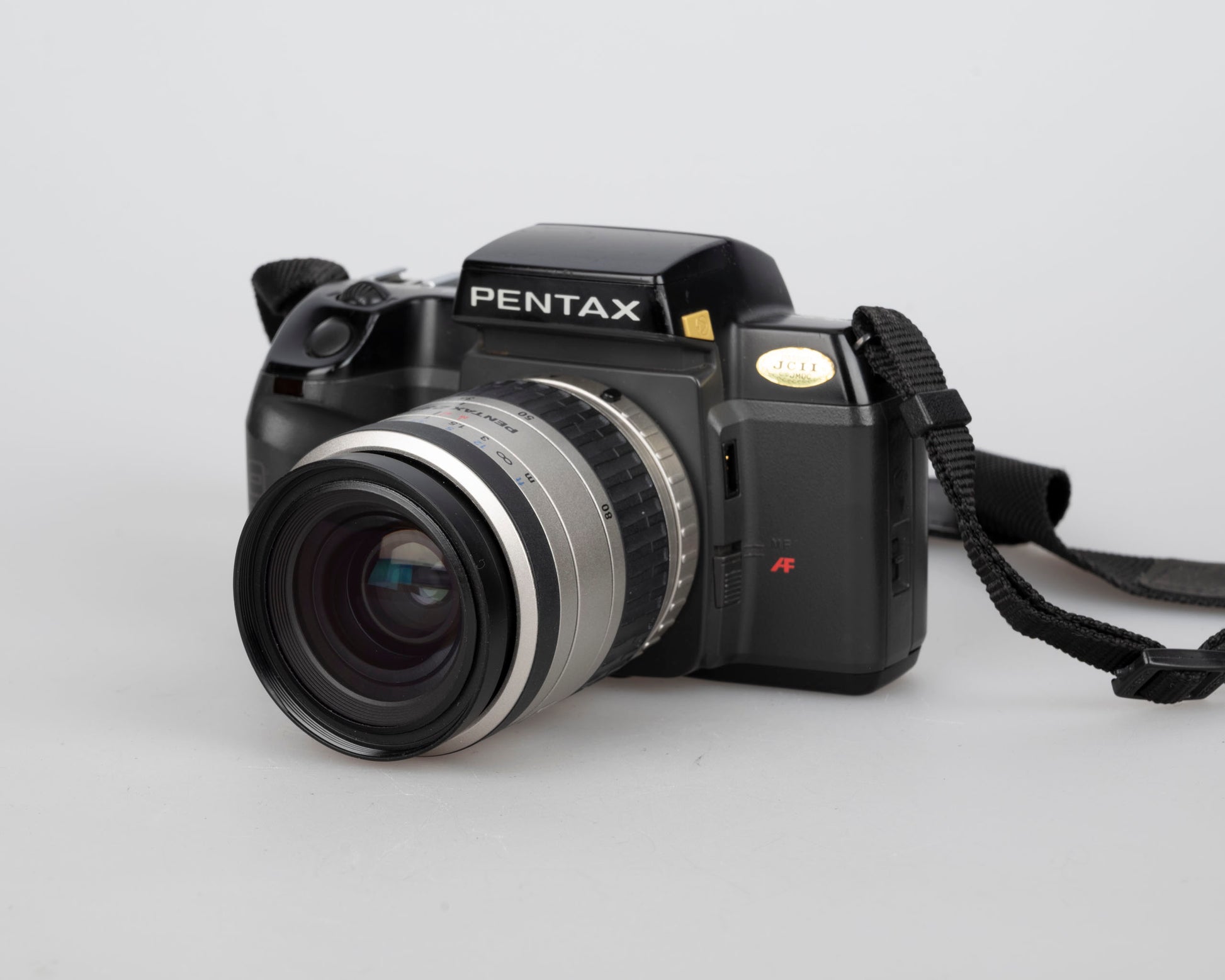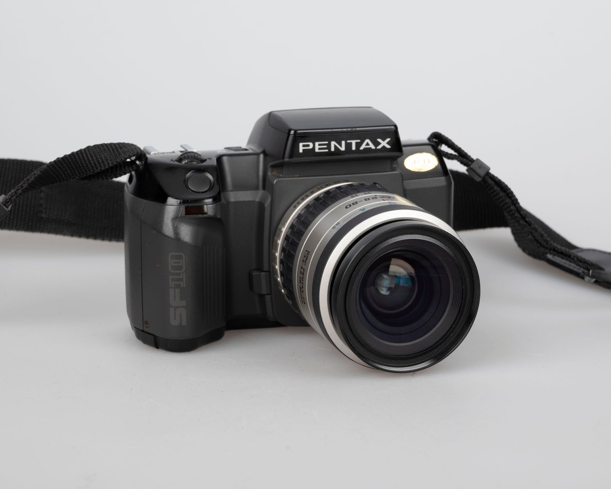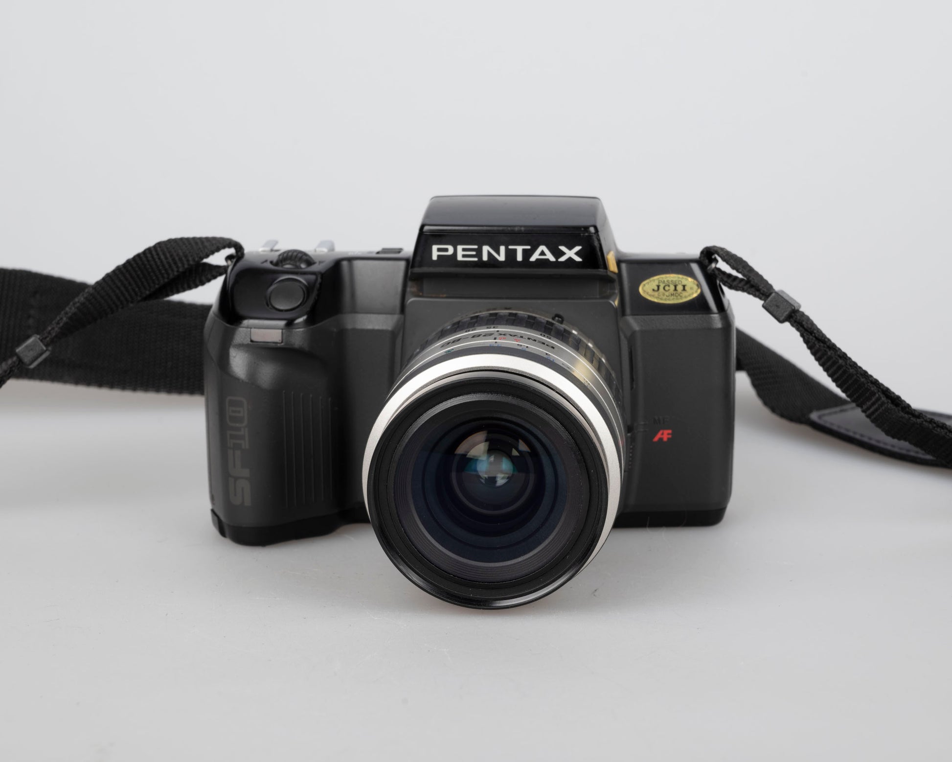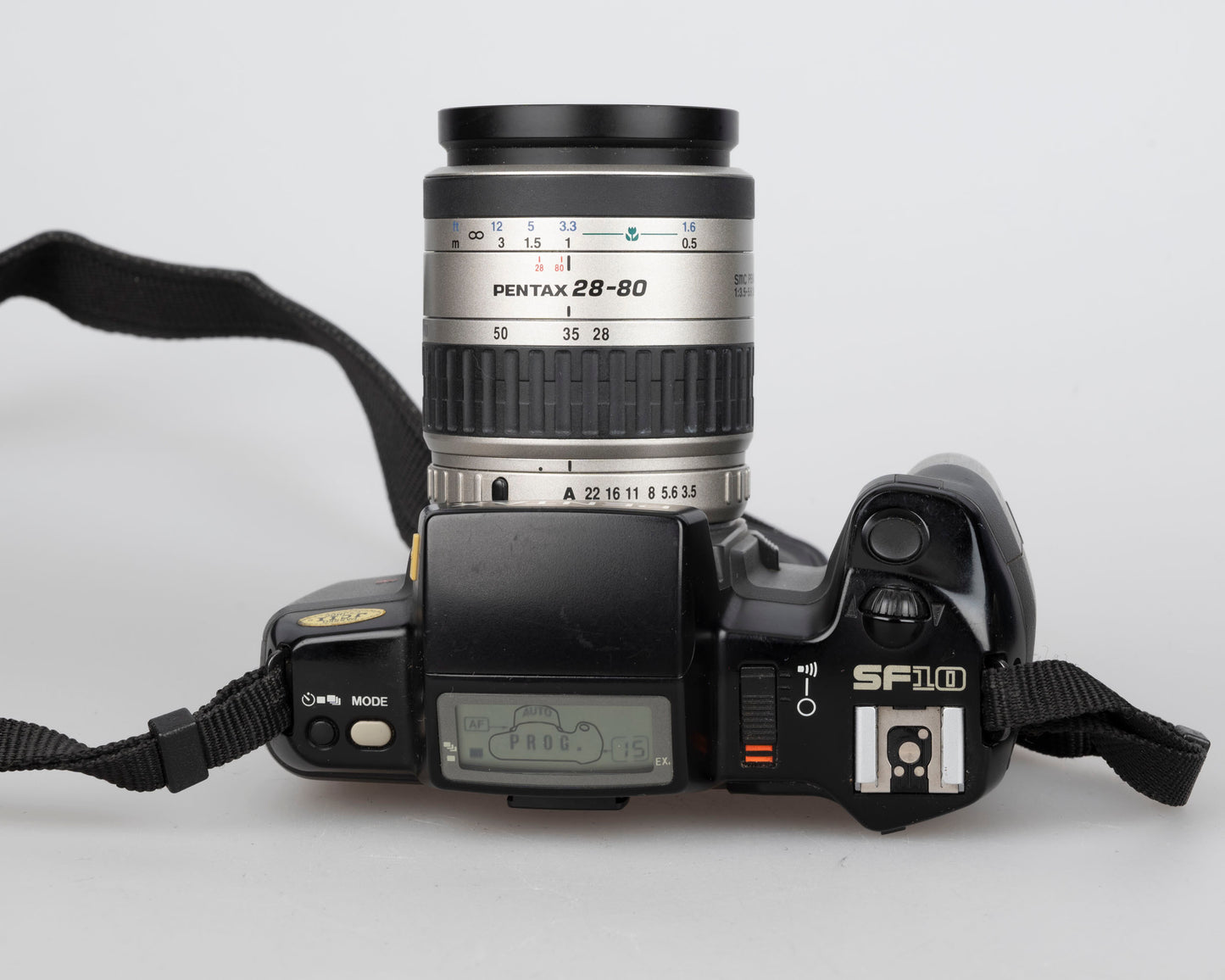 The Pentax SF10 is an advanced autofocus 35mm film SLR from the late 1980s. The included lens is a very flexible SMC Pentax-FA 28-80mm zoom. The camera has both a pop-up flash and a hot-shoe for connecting an external flash.