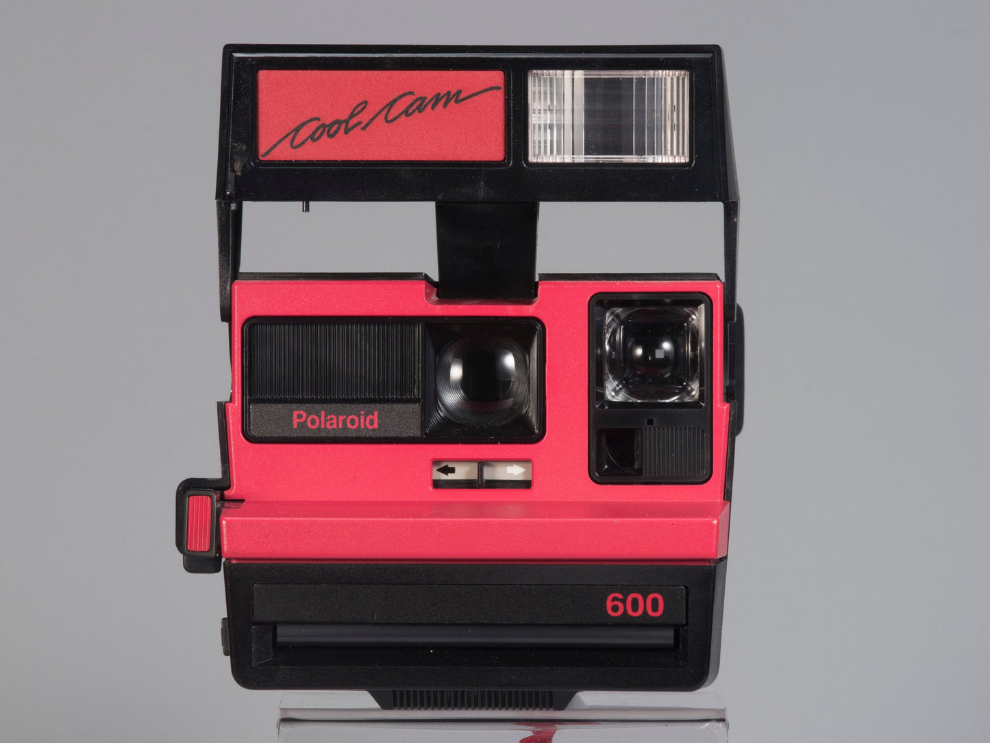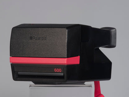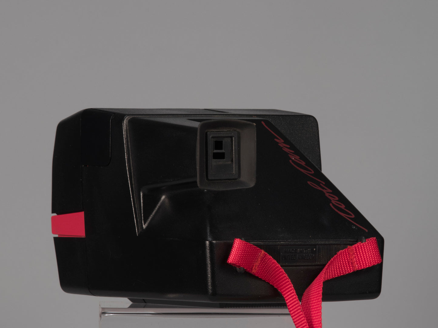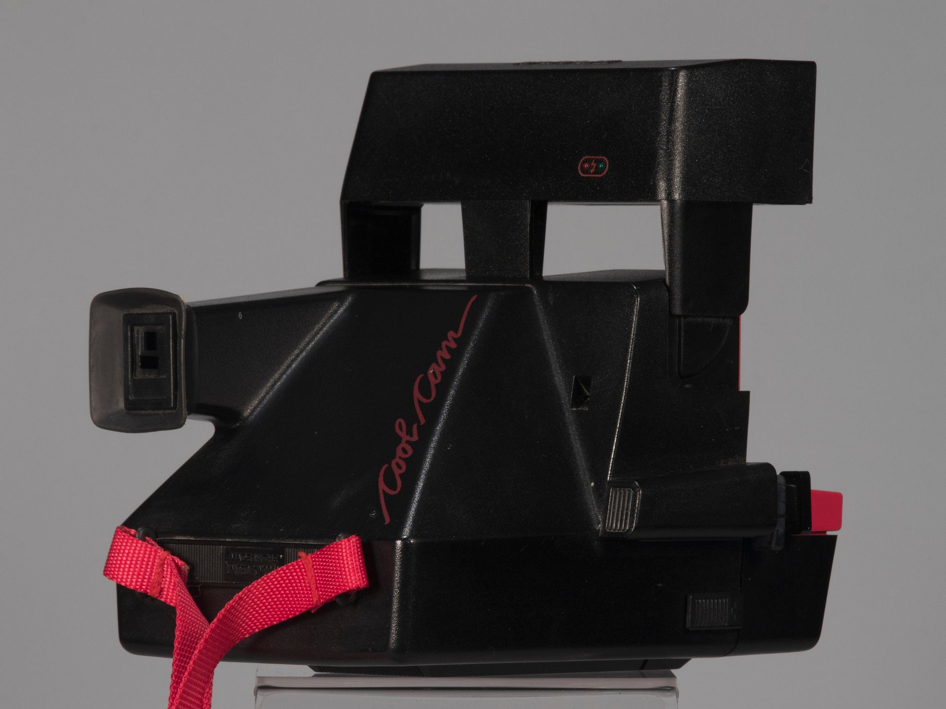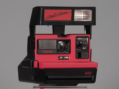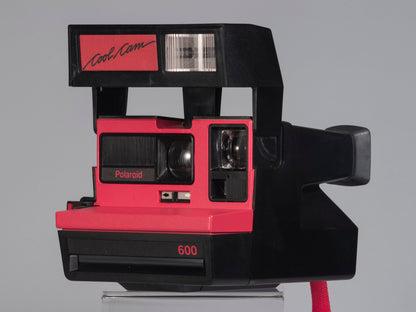 This is the striking UK-made red and black edition of the Polaroid Cool Cam, a Polaroid 600 compatible instant camera from the 90s. The Polaroid Cool Cam uses the most common type of Polaroid film: Polaroid Originals type-600 color or black and white film packs. This film is still being made and is available online and from most camera shops!