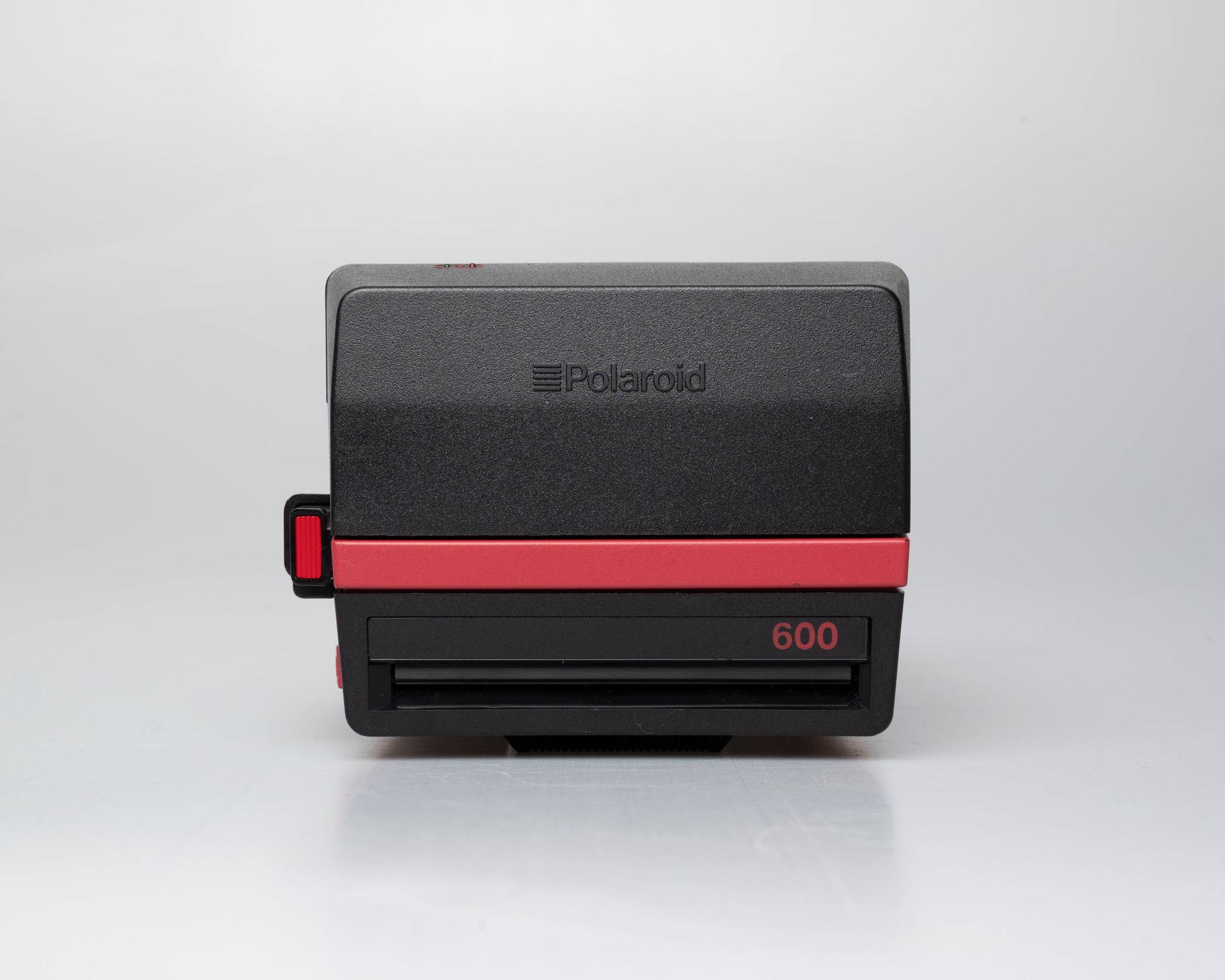 This is the striking UK-made red and black edition of the Polaroid Cool Cam, a Polaroid 600 compatible instant camera from the 90s. It uses the most common type of Polaroid film: Polaroid Originals type-600 color or black and white film packs. This film is still being made and is available online and from most camera shops.