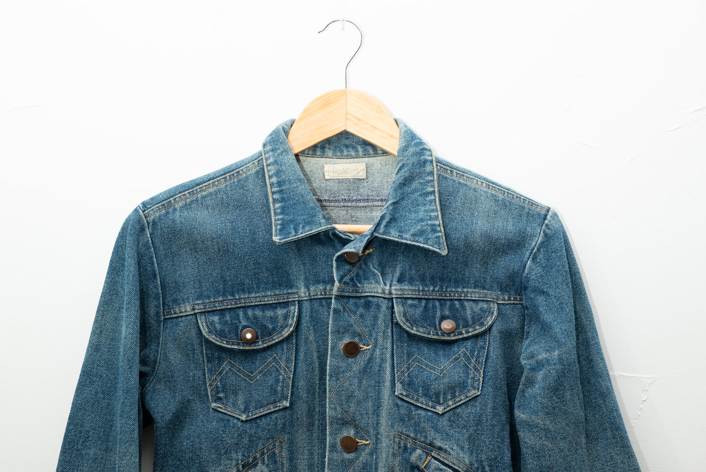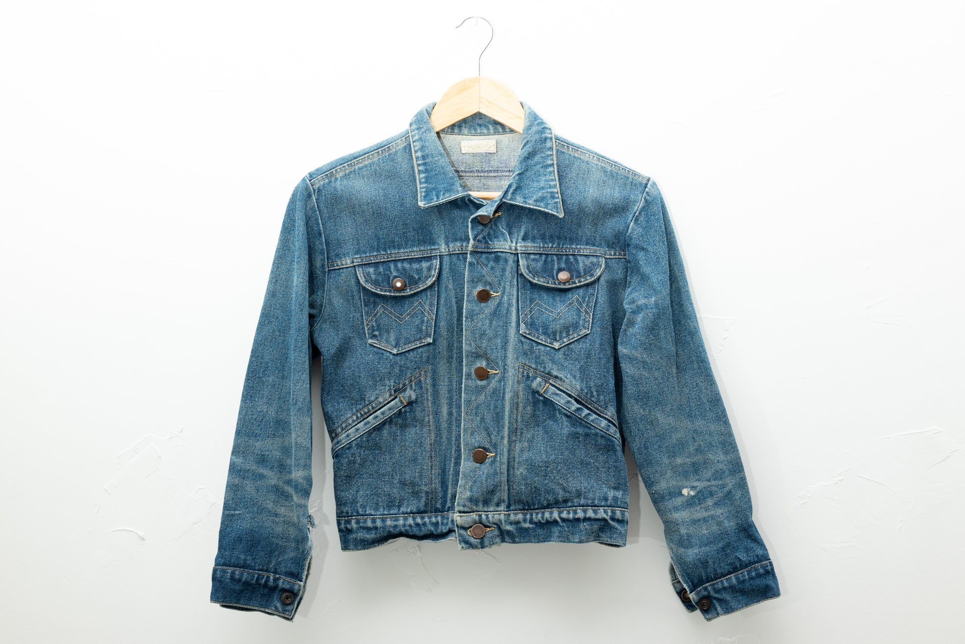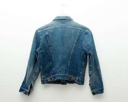 Denim jacket by "Paspalum." Marked size 12, which is most likely kids. The jacket is nicely faded throughout, with some lovely contrast with the original deep indigo. There is a 1/2" bleach stain on one arm. The zig-zag topstitching on the pockets and button flap is a cute detail. Would best fit a women's small - looks great worn open.