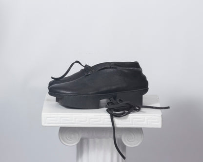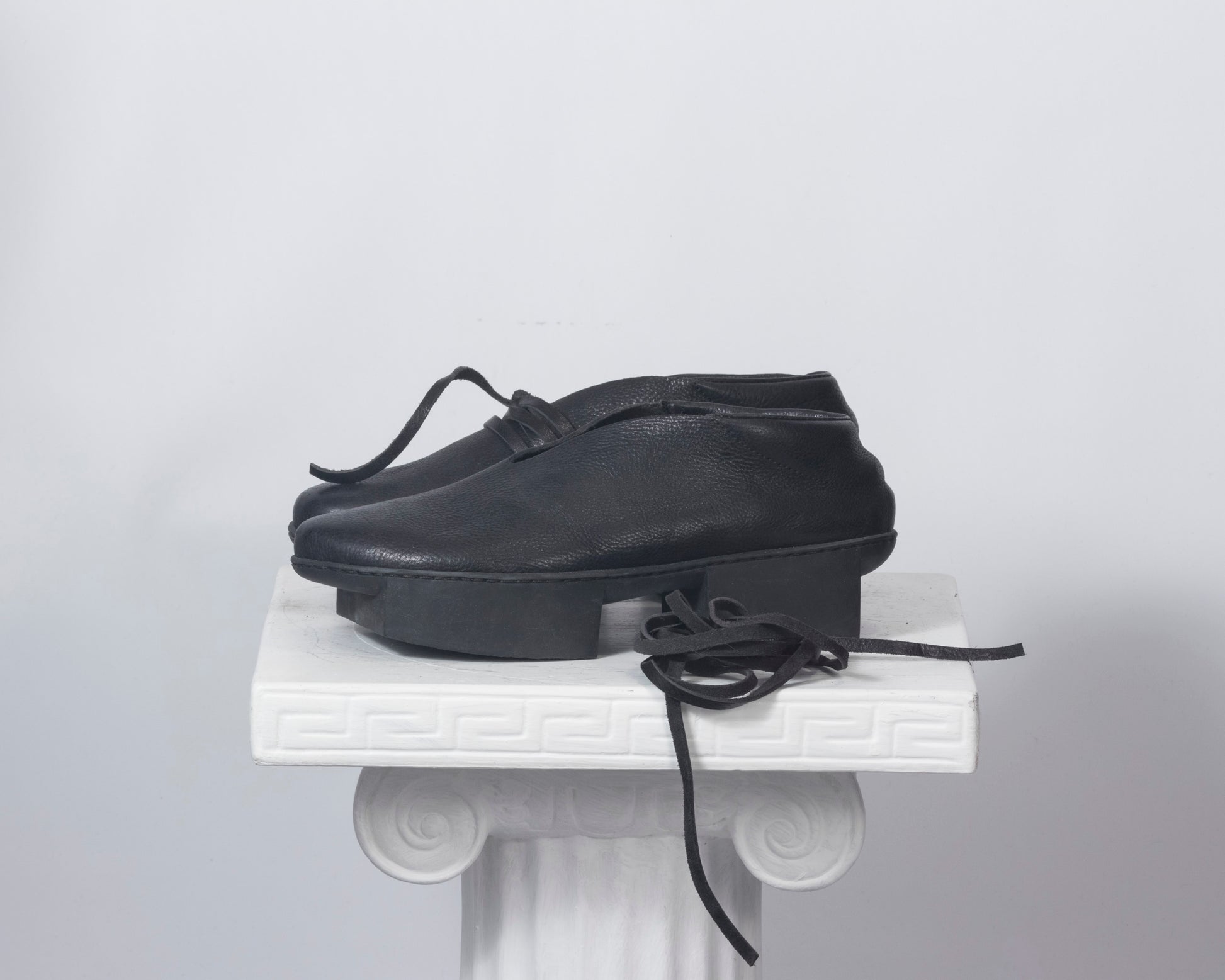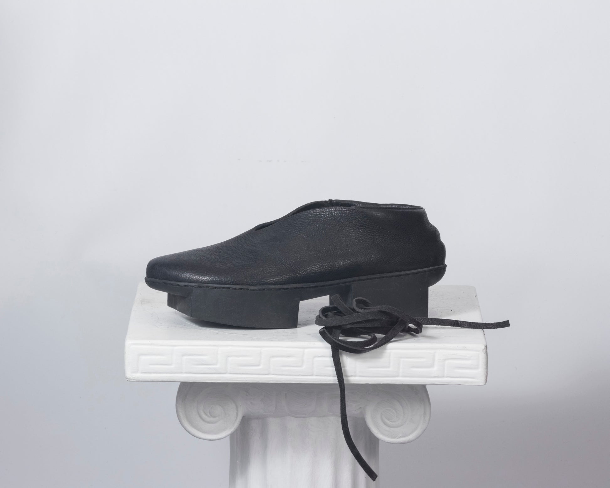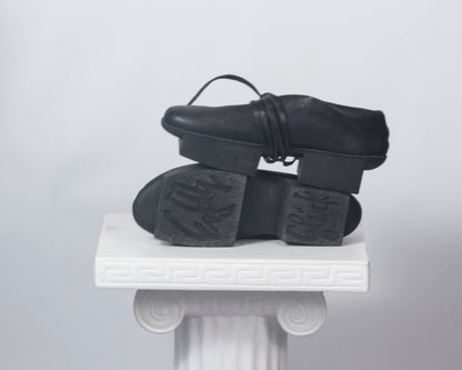 Long leather tie wraps around midsole over foot and is not attached -- very minimalist design!