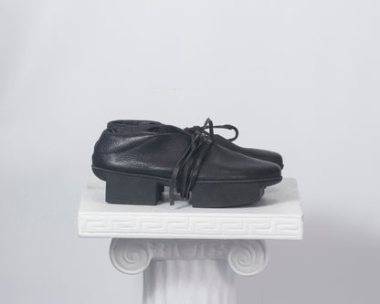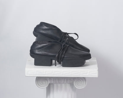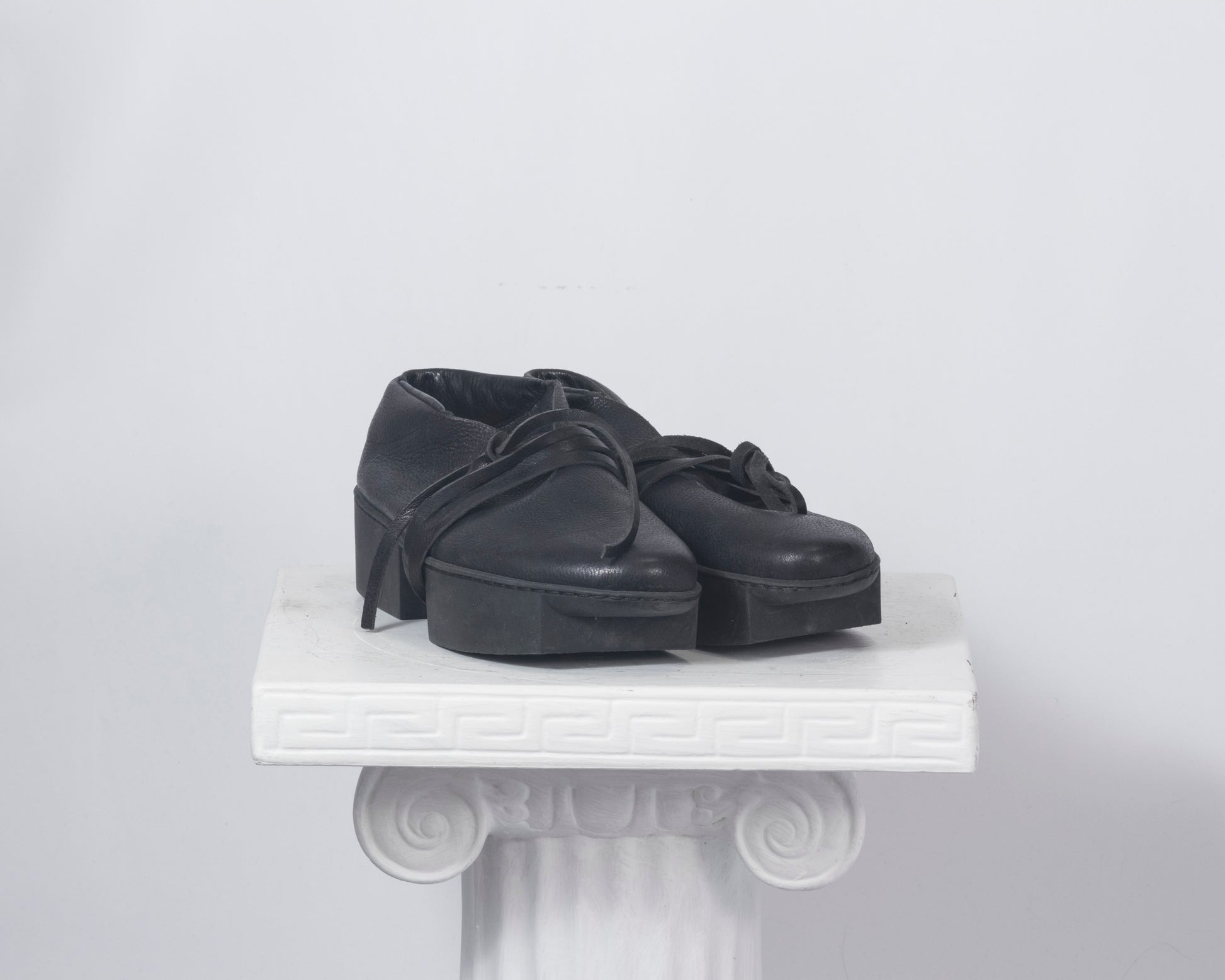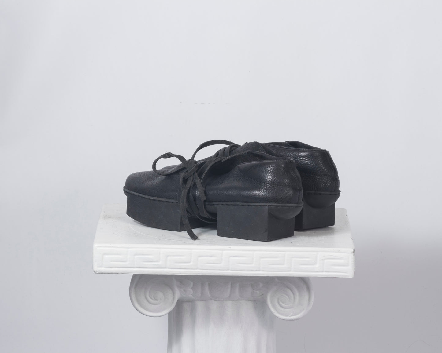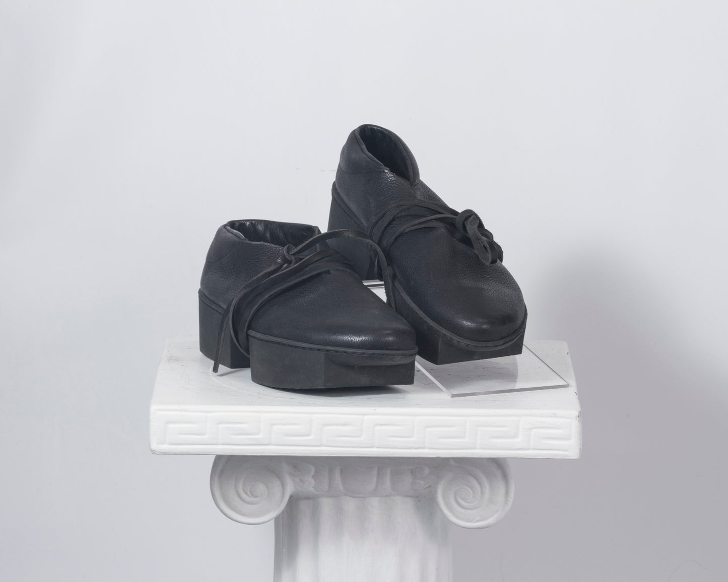 Long leather tie wraps around midsole over foot and is not attached -- very minimalist design!