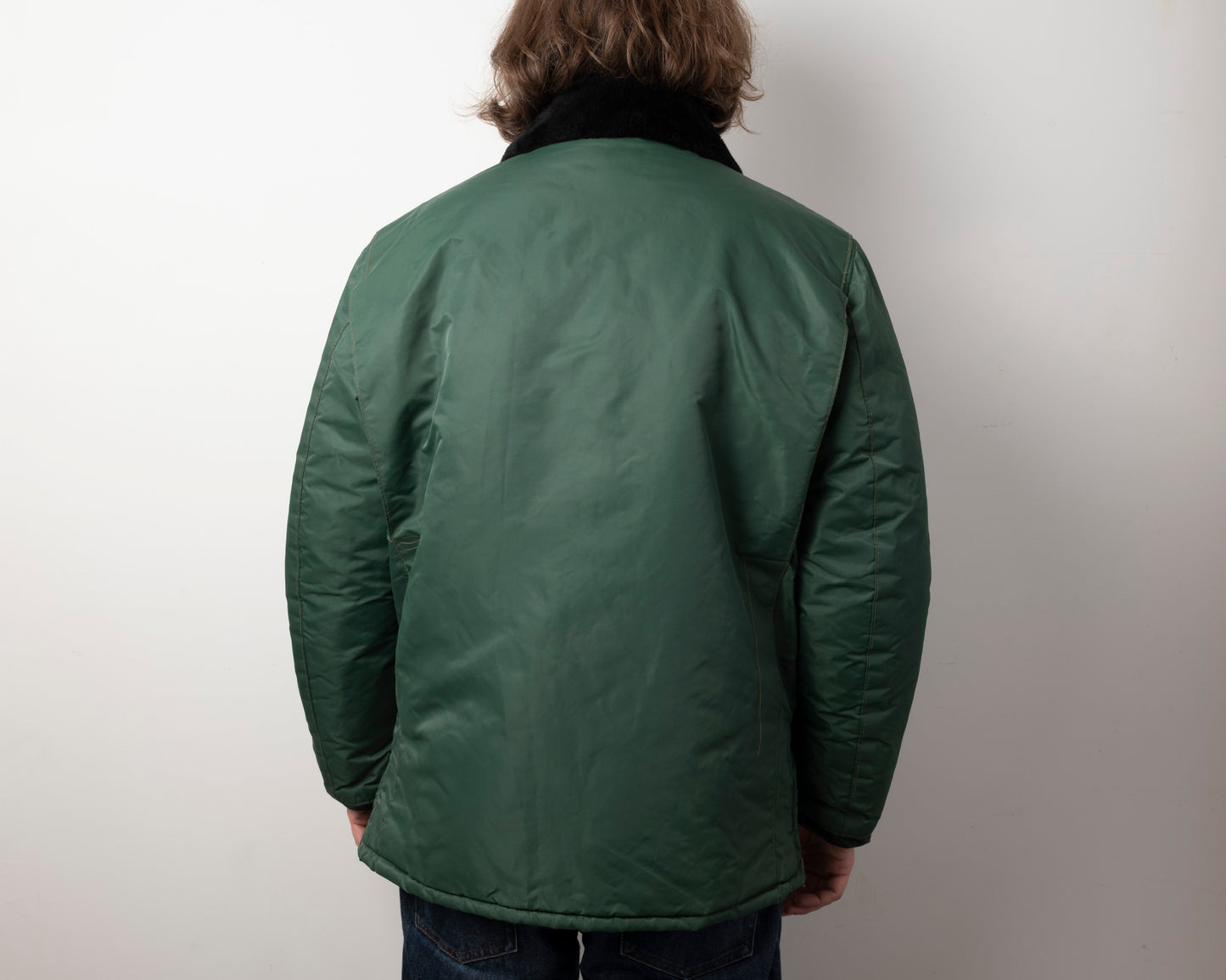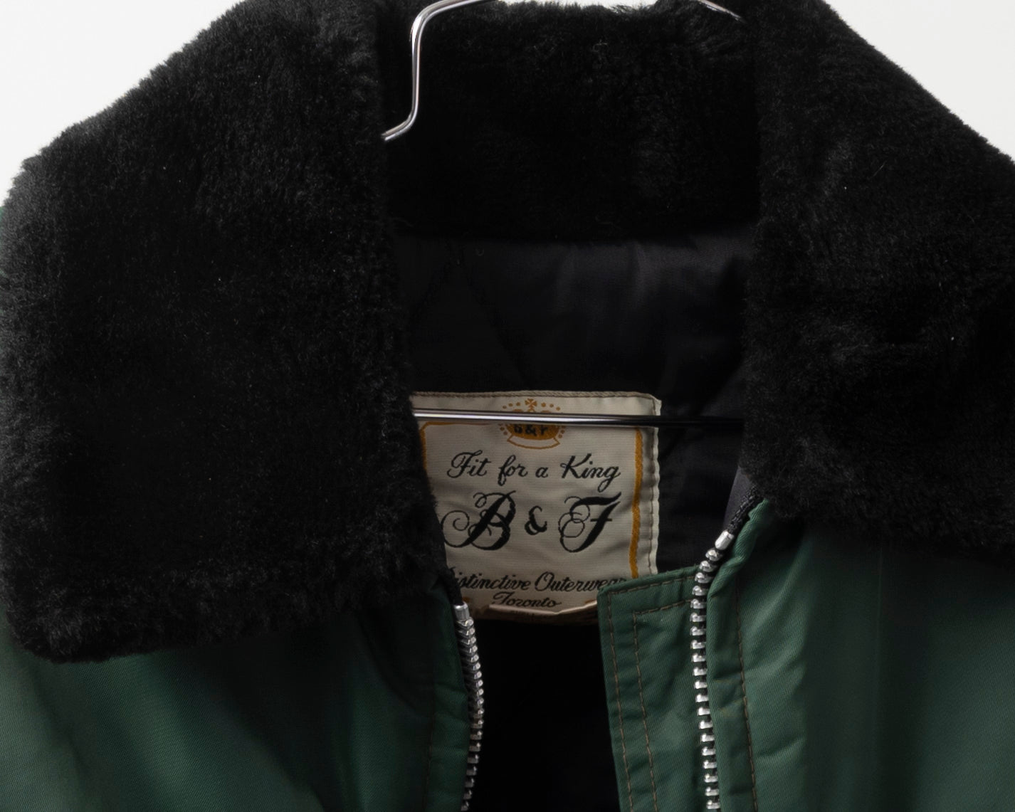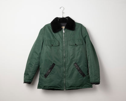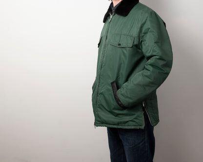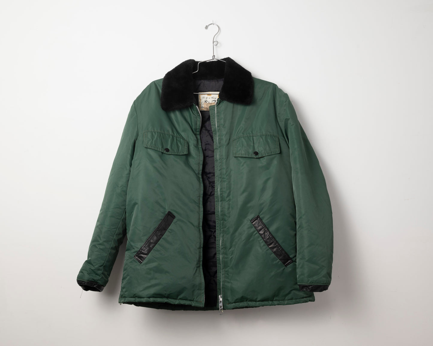 A thermal work jacket "Fit for a King" (as per the tag). Fuzzy black collar, black leather accents, very heavy duty 2-way YKK silver zipper. Made in Canada. Marked a size 42.