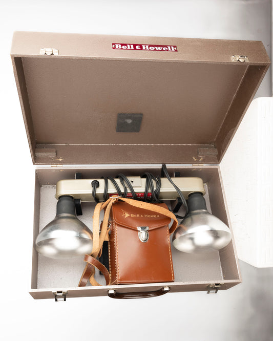 Tenue de film Bell et Howell 8 mm avec appareil photo modèle 323 8 mm + étui en cuir + lumières de cinéma + étui en bois d'origine