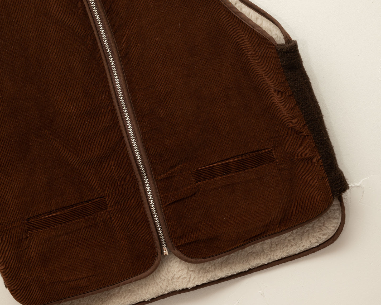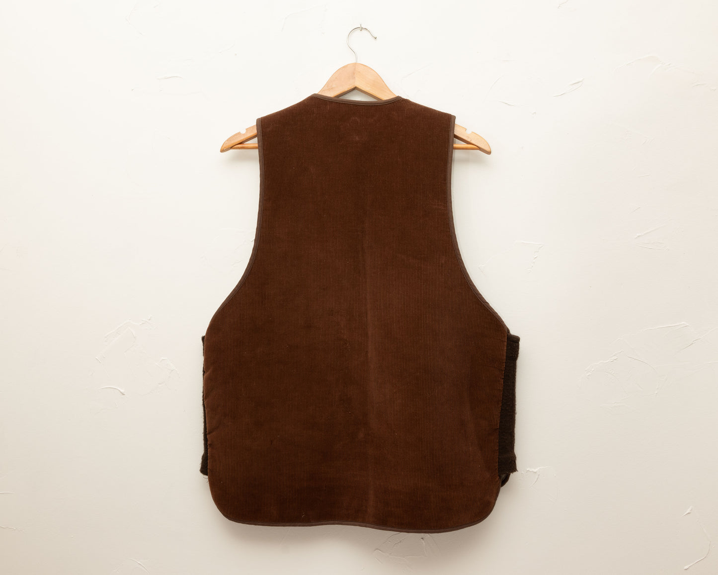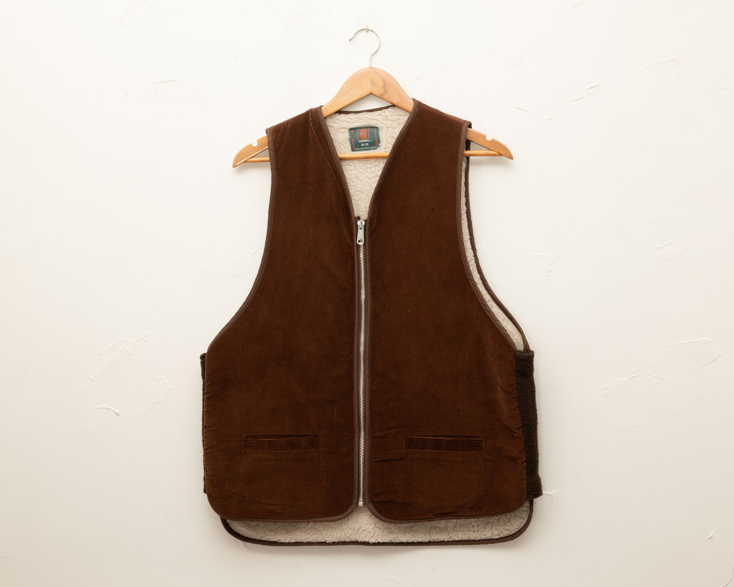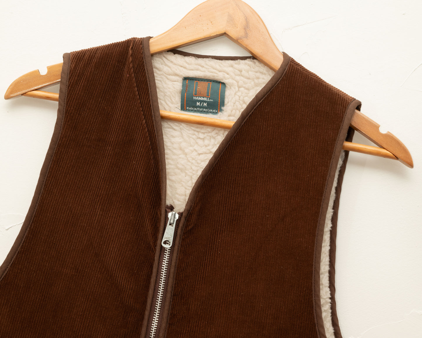 Gilet en velours côtelé doublé en sherpa. Fabriqué au Canada par Hammill. Fermeture éclair YKK robuste. Panneaux latéraux extensibles en tricot noir. L'étiquette dit moyen.
