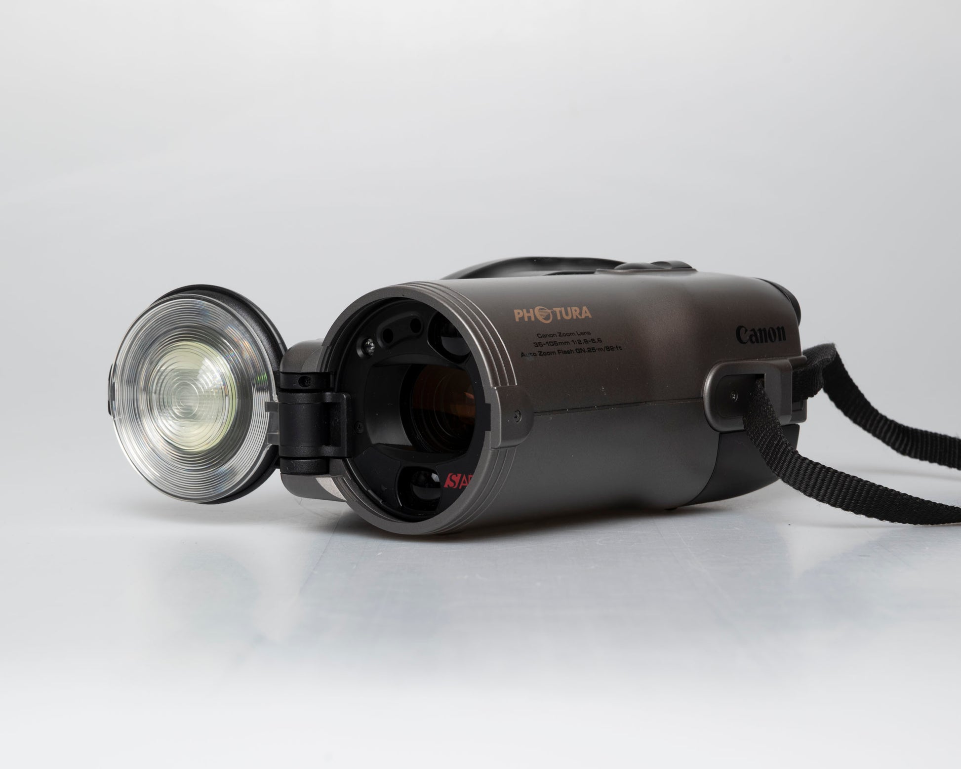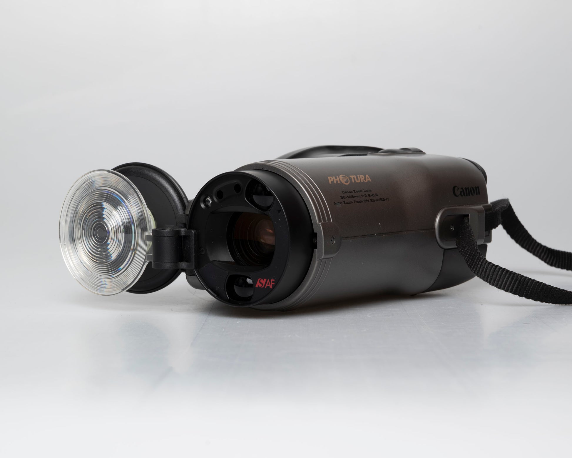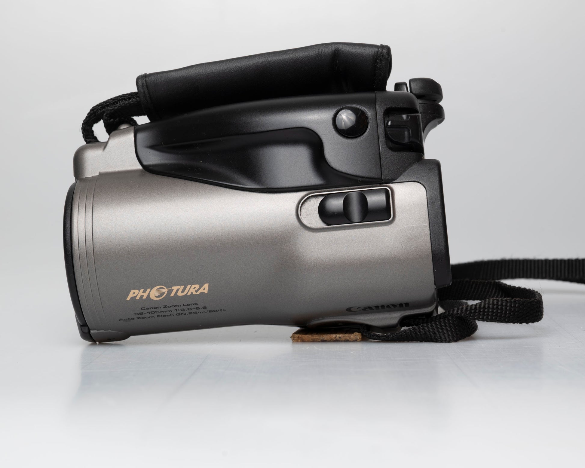 Le Canon Photura est un appareil photo compact 35 mm à mise au point automatique au design très inhabituel mais de qualité excellente, datant du début des années 1990. Dans le récapitulatif de 1990 des appareils photo compacts avancés de Popular Mechanics', le critique a décrit le Photura comme 'avant-garde' et lui a attribué les meilleures notes de la sélection. Il ressemble plus à un caméscope analogique qu'à un appareil photo compact 35 mm, mais sa forme suit vraiment la fonction : l'appareil photo est construit autour de son objectif 35-105 mm f/2.8-6.6 (10 éléments dans 9 groupes), qui est exceptionnellement grand et de haute qualité pour un zoom à mise au point automatique (et assez rapide à l'extrémité grand angle).