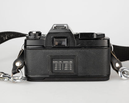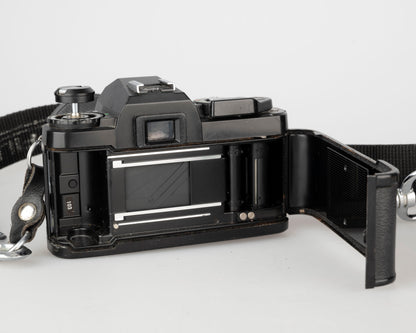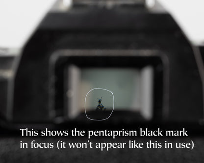 L'appareil photo a été testé avec une batterie et un film installés (le film n'a cependant pas été développé) et toutes les fonctions fonctionnent correctement. Nous avons vérifié que les vitesses d'obturation et l'exposition automatique de l'appareil photo fonctionnent avec une très bonne précision. L'appareil photo est en bon état cosmétique à l'exception de la tache sombre dans le viseur mentionnée précédemment. L'objectif inclus est en bon état.