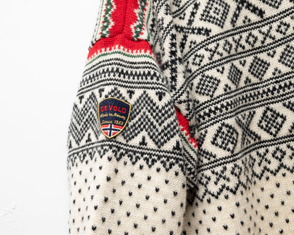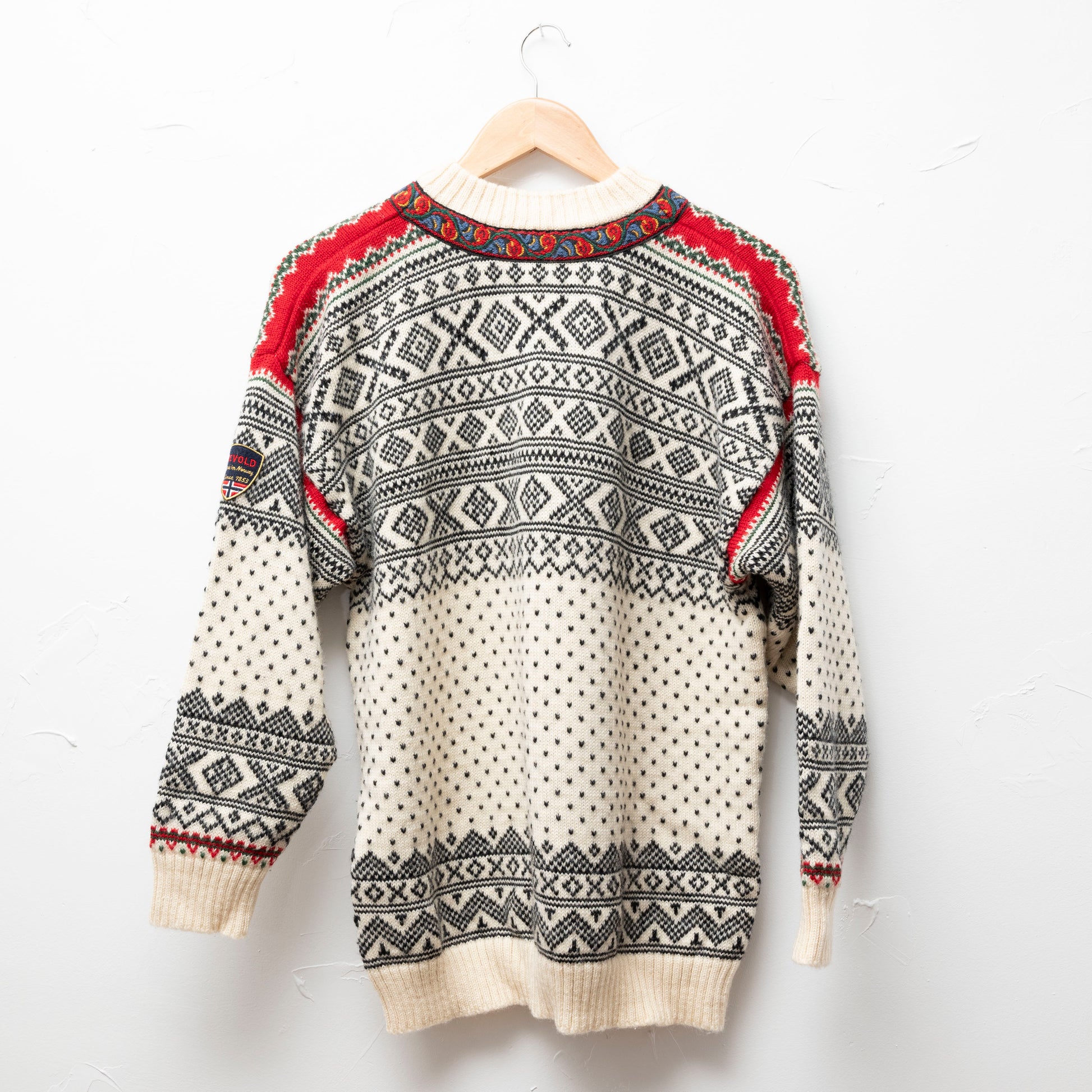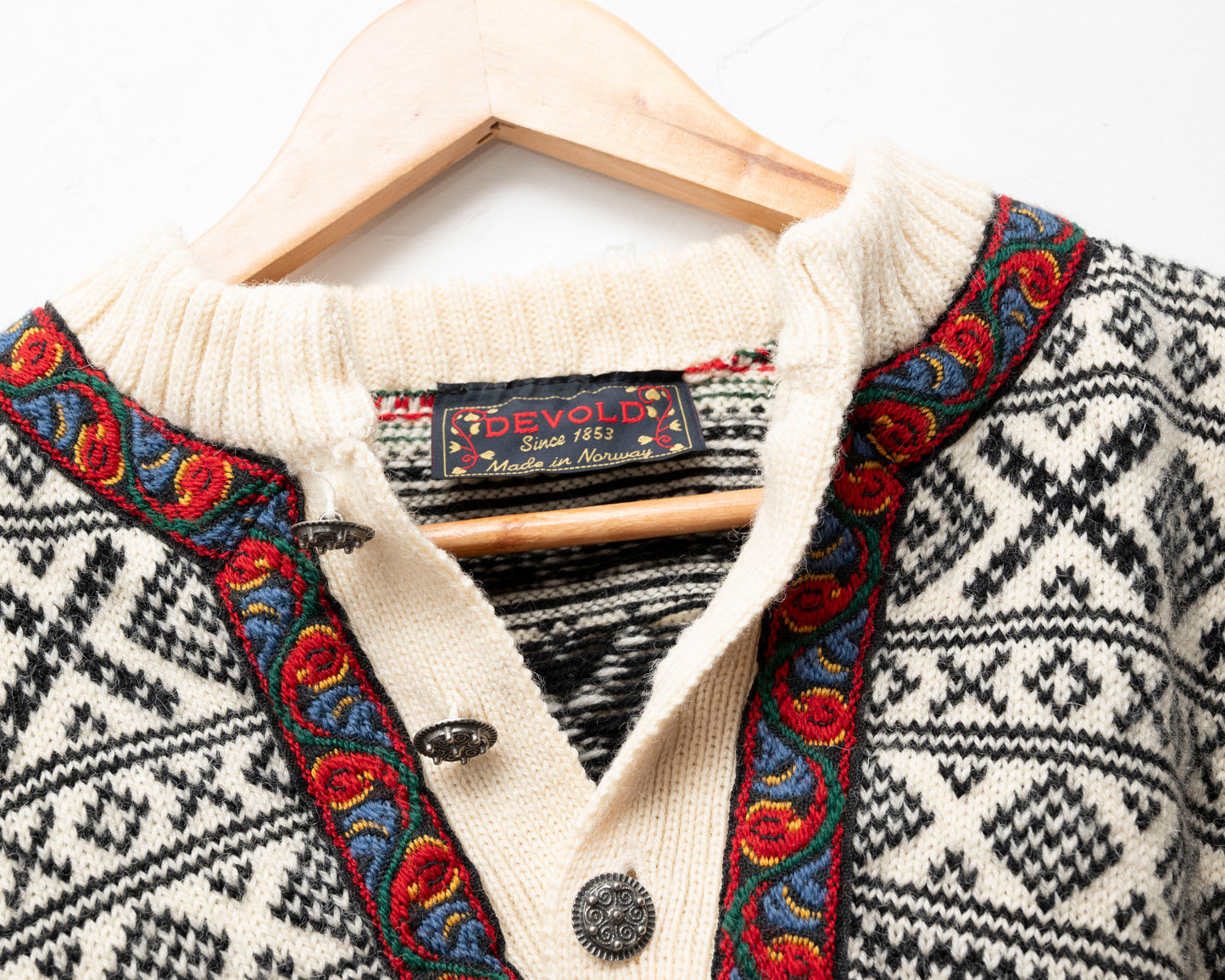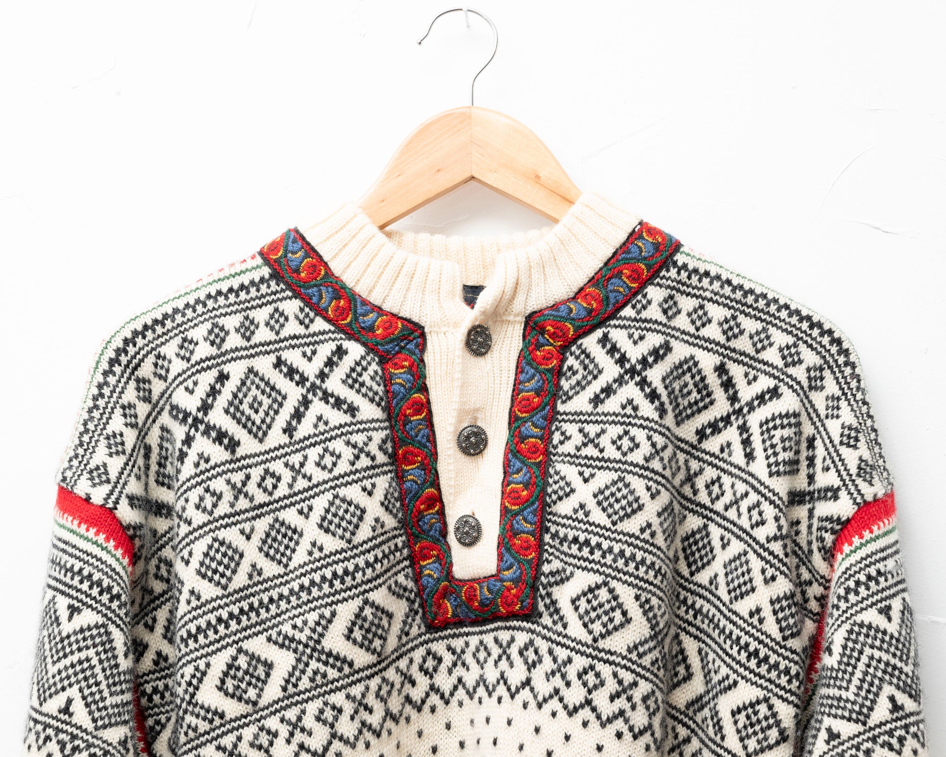 Pull Devold vintage (fondé en 1853) avec motif nordique et fermoirs en étain. Le pull "setesdalsgenser" est un style traditionnel de pull norvégien fabriqué à l'origine dans la vallée de Setedal avec de la laine Plovel, qui provient de moutons norvégiens des montagnes. Le pull est chaud, assez lourd et respirant.