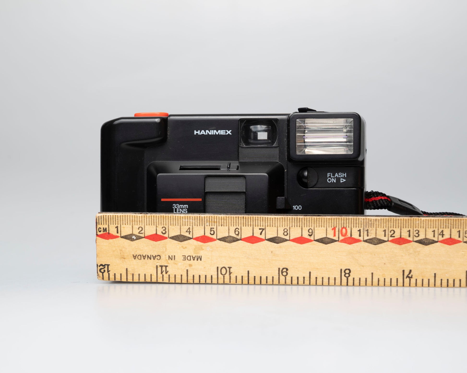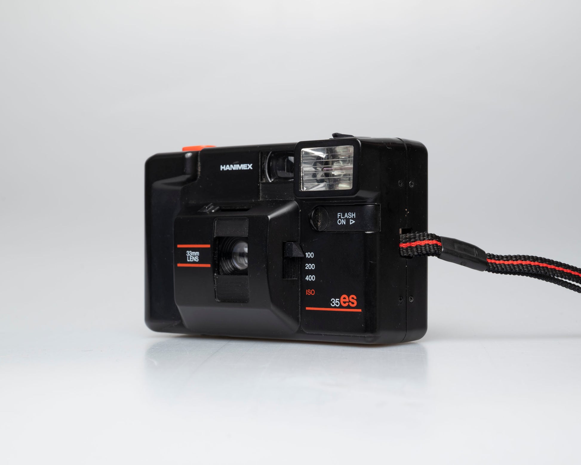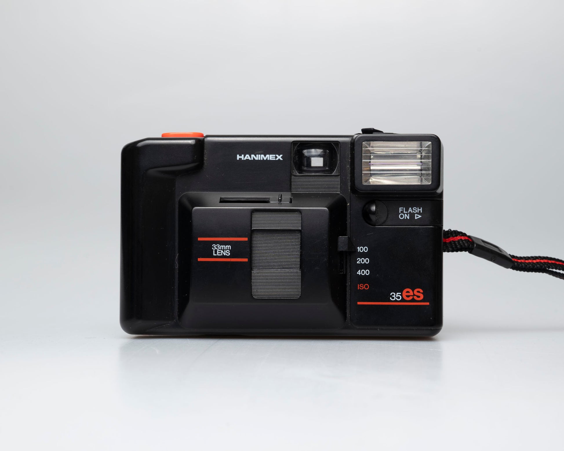 Le Hanimex 35ES est un appareil photo mécanique 35mm très facile à utiliser des débuts des années 1980. Il dispose d'un objectif de 33 mm, d'un avance de film manuelle à molette, de trois vitesses de film sélectionnables et d'un flash intégré qui peut être allumé ou éteint. C'est un design à mise au point fixe où les sujets d'environ 1,2 mètres à l'infini devraient être nets.