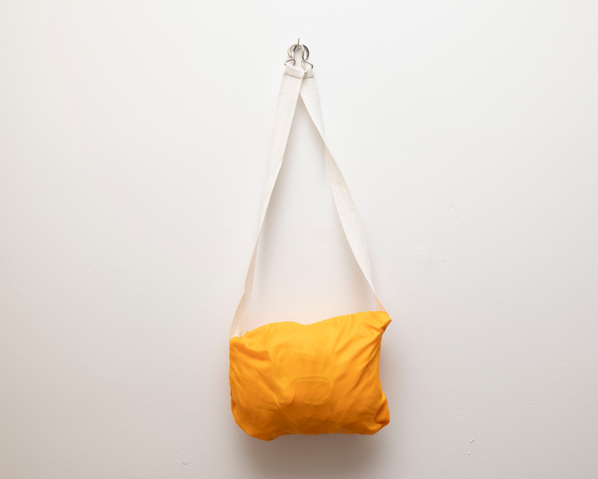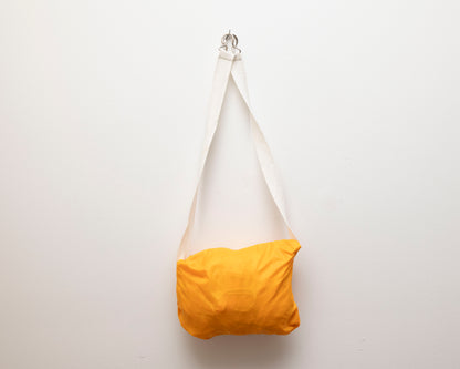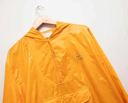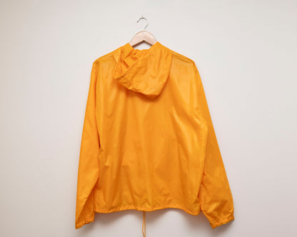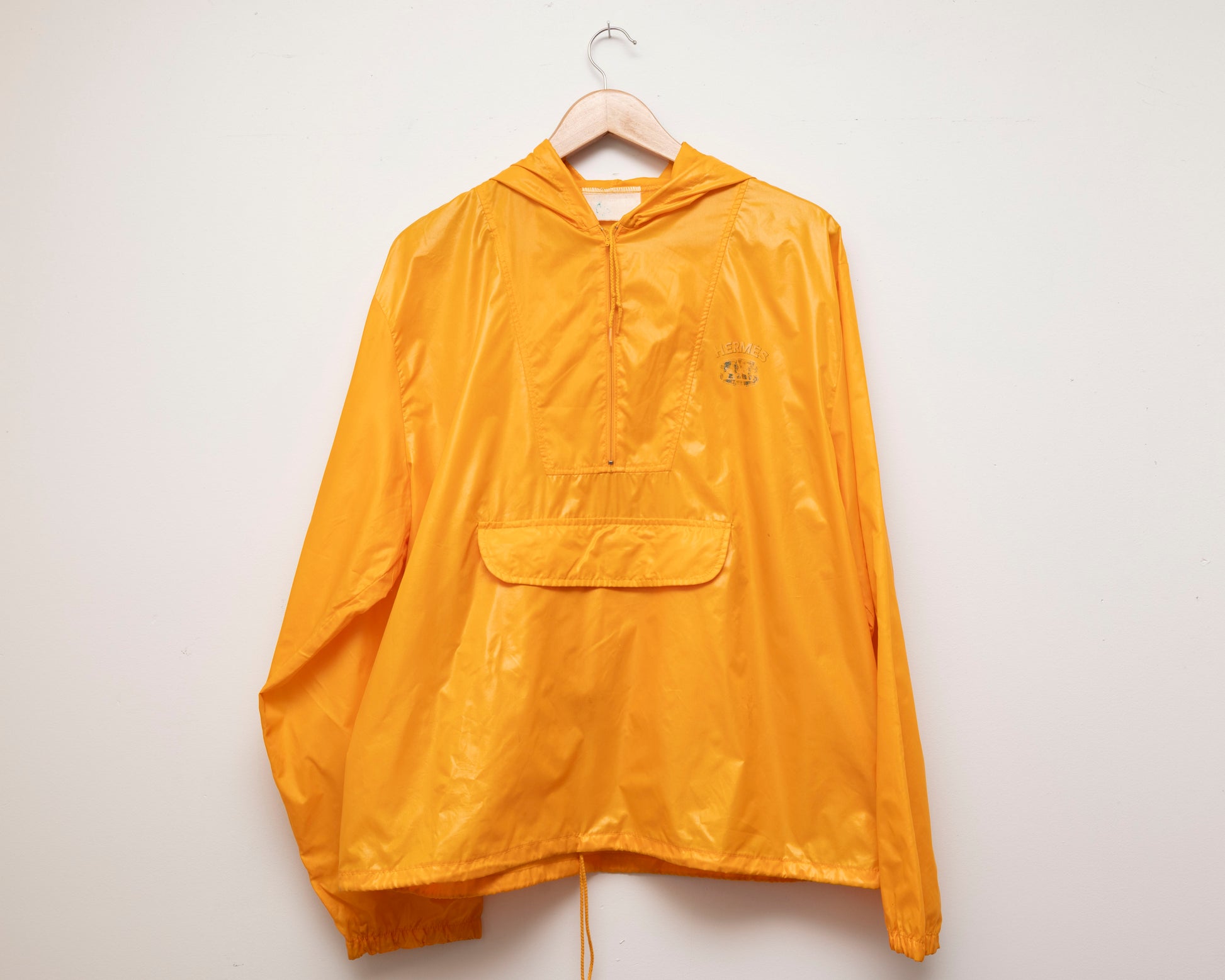 Coupe-vent jaune doré avec logo Hermès légèrement usé. Se plie dans une pochette. On dirait un produit promotionnel qui aurait été fourni avec de l'eau de Cologne, mais je ne peux pas en être certain. Très probablement des années 90.