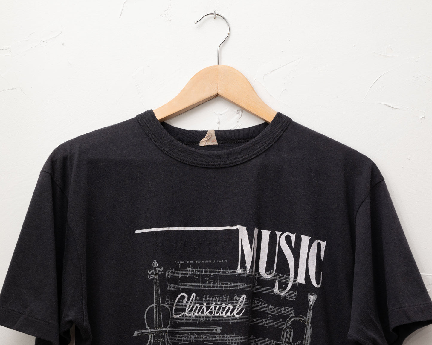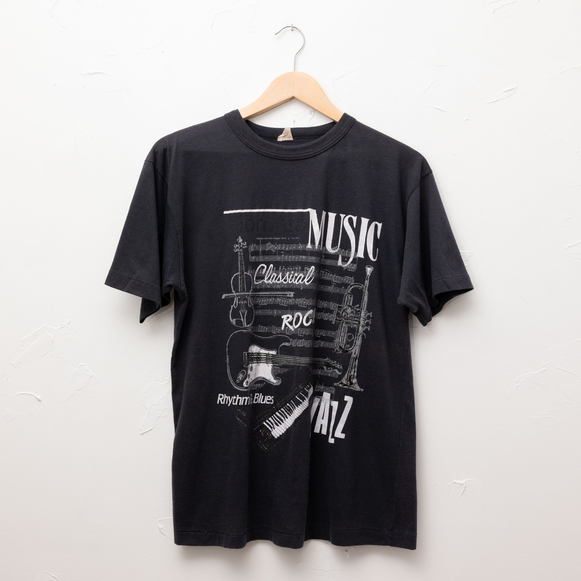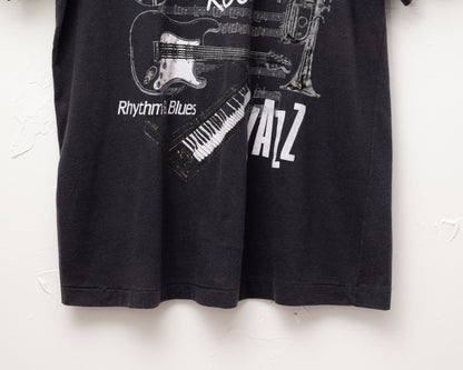 Un t-shirt pour les fans de toutes les musiques. Si vous n'aimez pas la musique, ce n'est pas pour vous ! Jersey 50/50 usé doux, légèrement bouloché. Collier sonnerie. Ourlets à point unique. Il y a des lettres pâles dans le coin supérieur gauche qui disent « Toronto », que quelqu'un a probablement enlevées pour rendre la chemise plus fraîche (pas de nuance sur le 6). Vous ne pouvez le voir que si vous regardez attentivement.