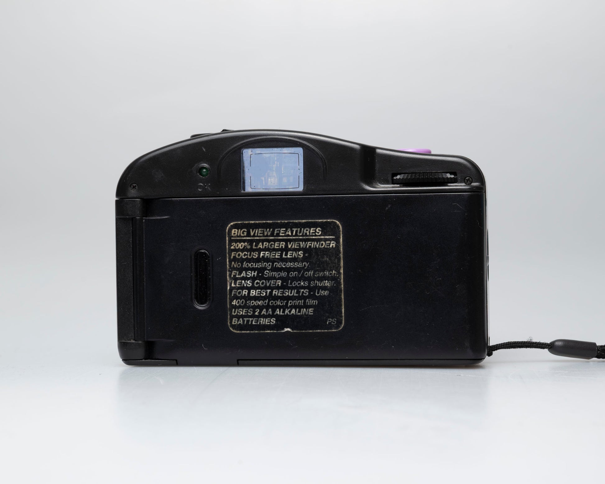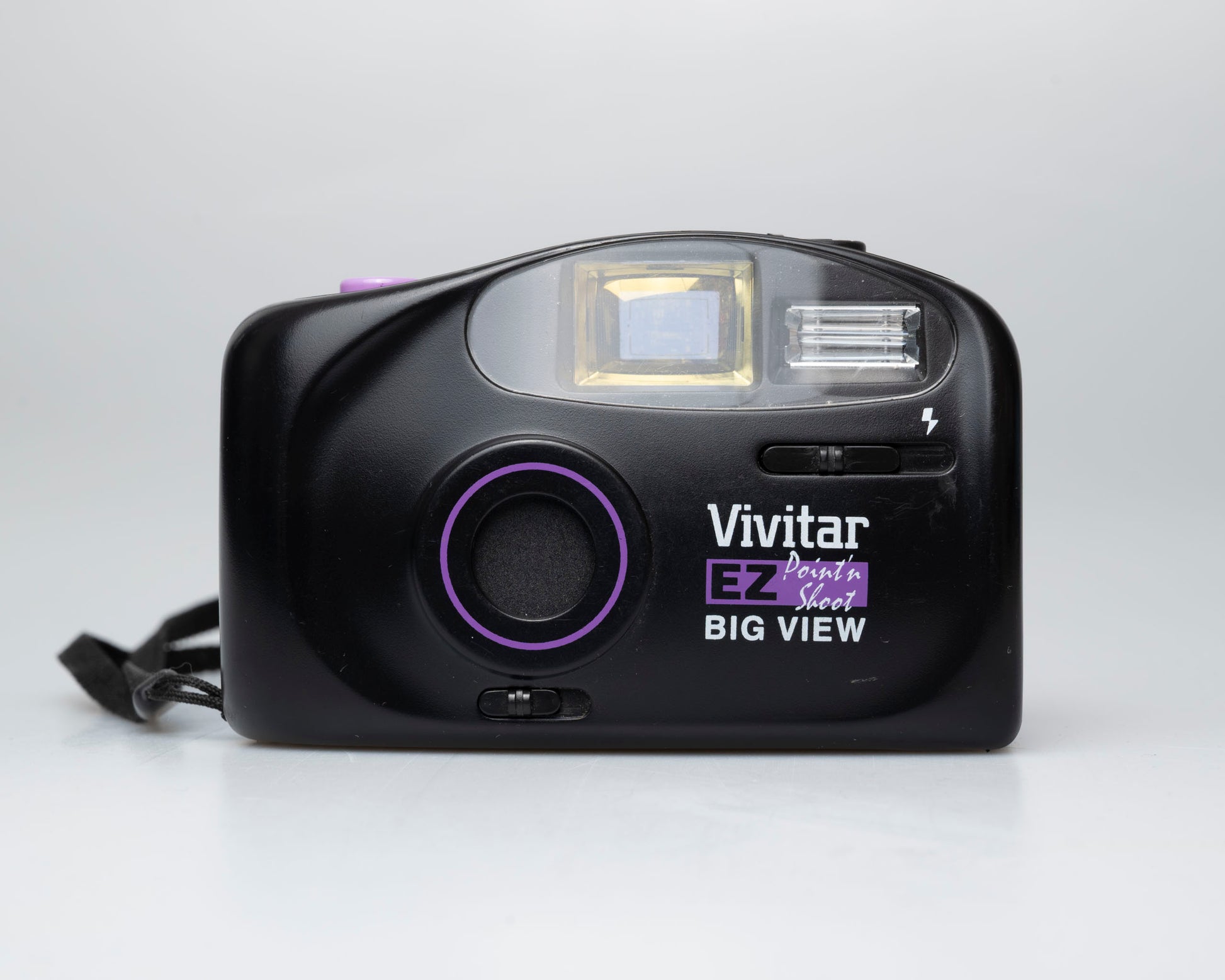 Le Vivitar EZ Point 'n' Shoot Big View est un appareil photo reflex 35 mm sans mise au point des années 1990, avec son très grand viseur et son design violet sur noir étant des caractéristiques distinctives.