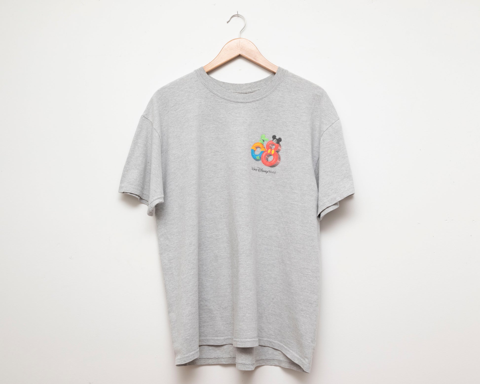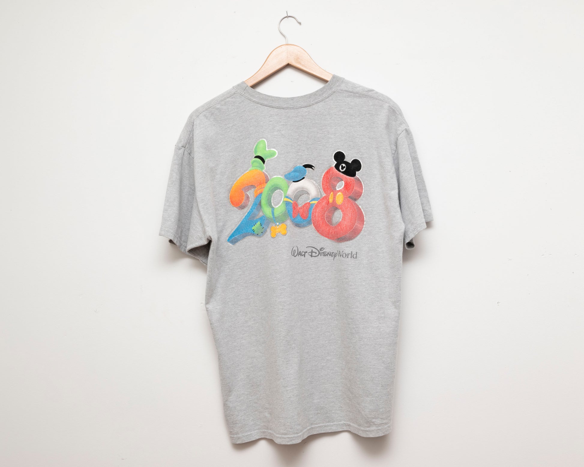 Heather grey 2008 Disney World t-shirt, marked size large. The Mickey hat on the back has a velvet texture for added nostalgia.
