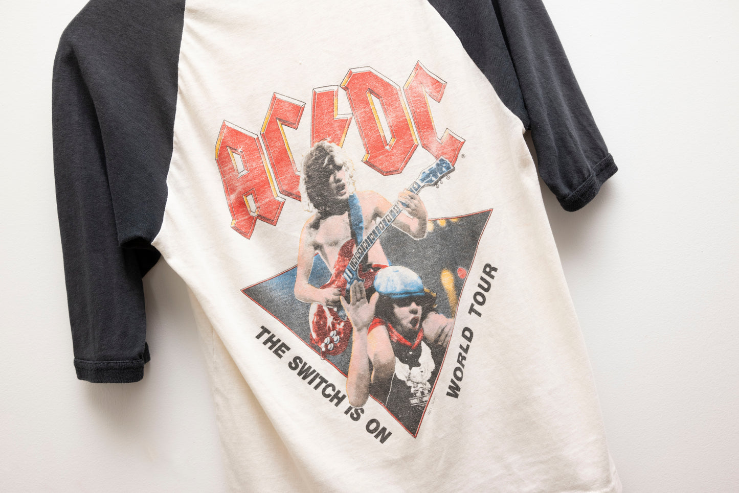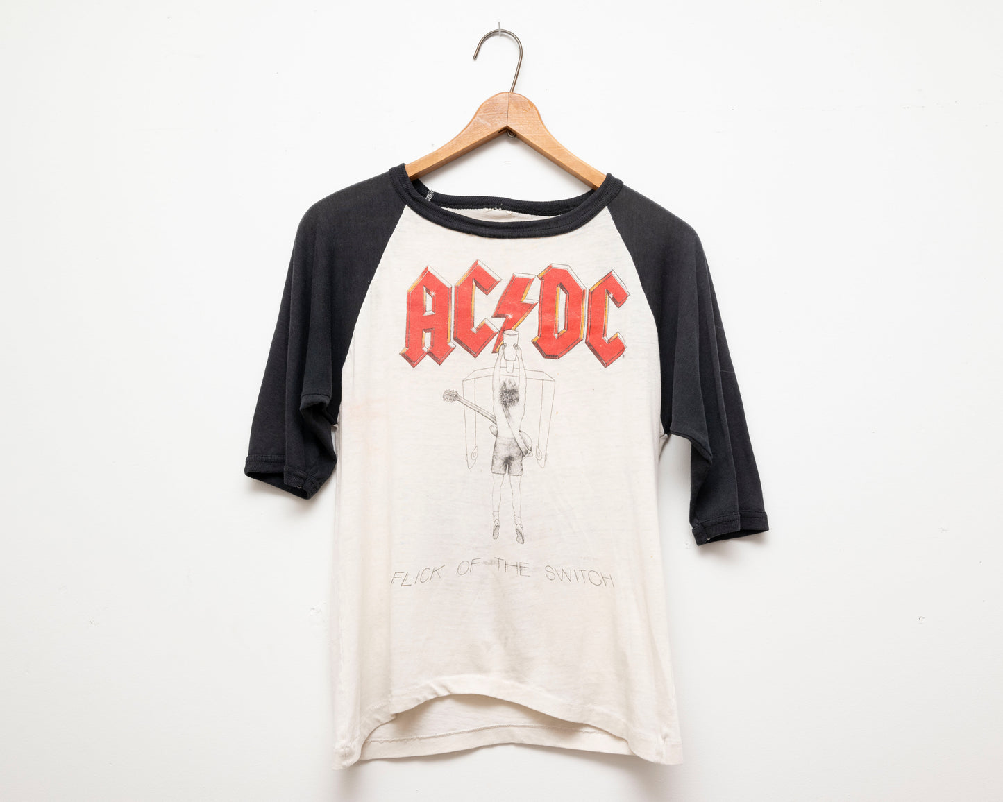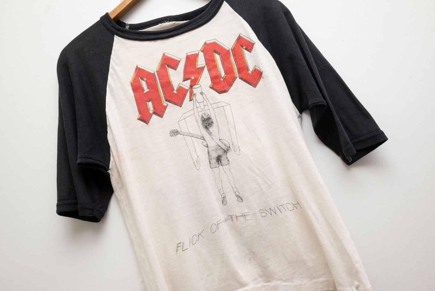 AC/DC vintage 1980s raglan-sleeve "The Switch is On" World Tour t-shirt for the Flick of the Switch (1983) record. The front of the t-shirt features the same hand drawing as the record.