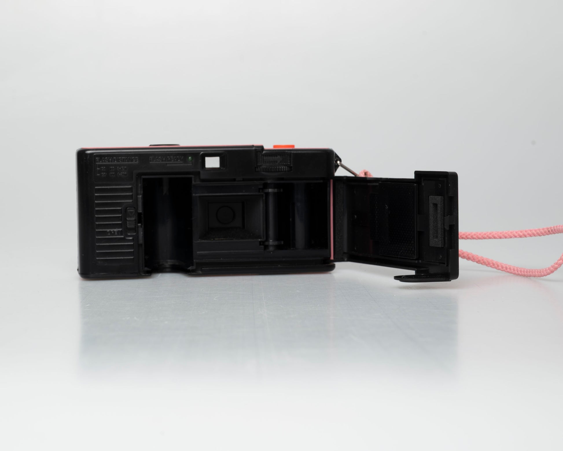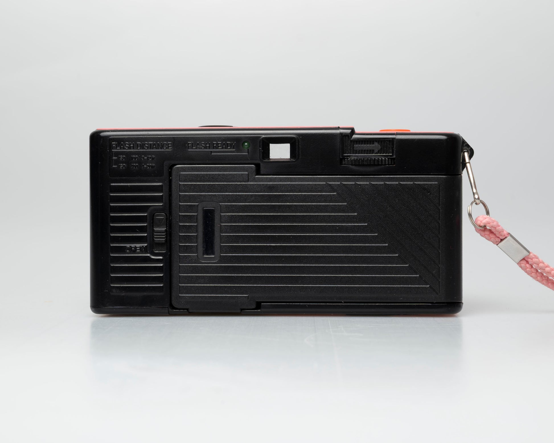 This camera is intended to be used with colour negative film (such as Kodak Gold, Porta, ColorMax, or UltraMax 400). A flash distance guide is embossed on the back of the camera: the flash covers from 3 to 12 feet for ISO 100 film or 4 to 20 feet for ISO 400 film.