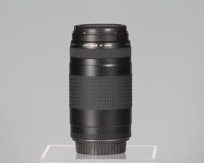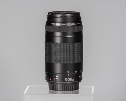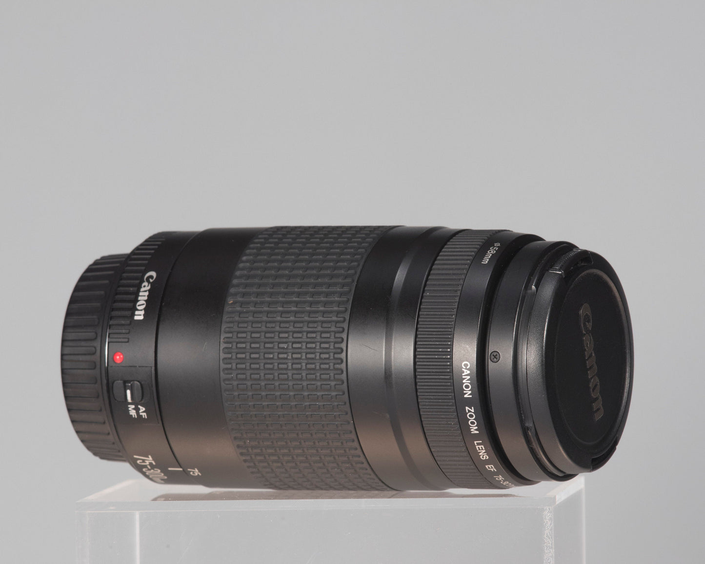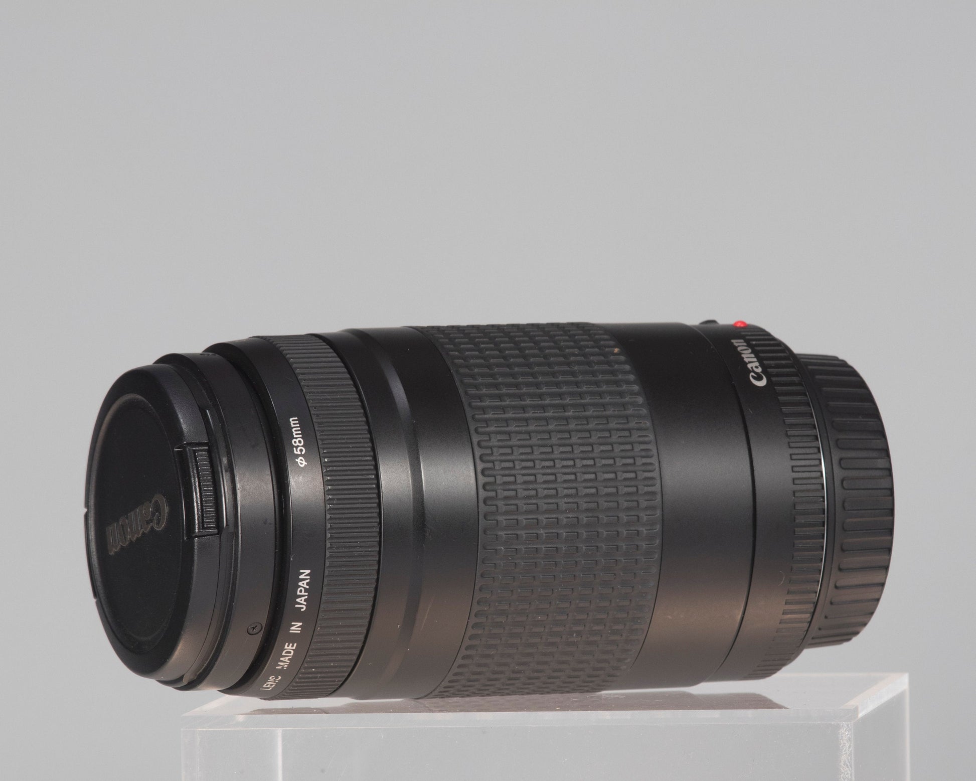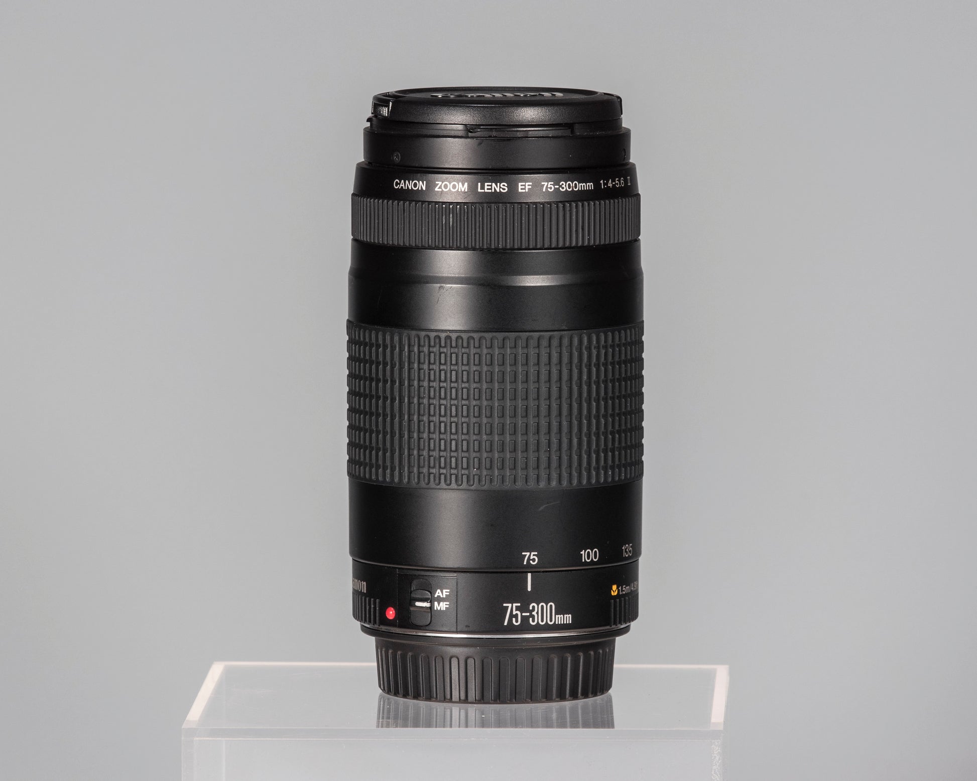 The Canon EF 75-300mm F4-5.6 II is a very flexible zoom telephoto lens for Canon EF mount film and digital cameras. The lens includes both the front and back caps and is in excellent optical and aesthetic condition.