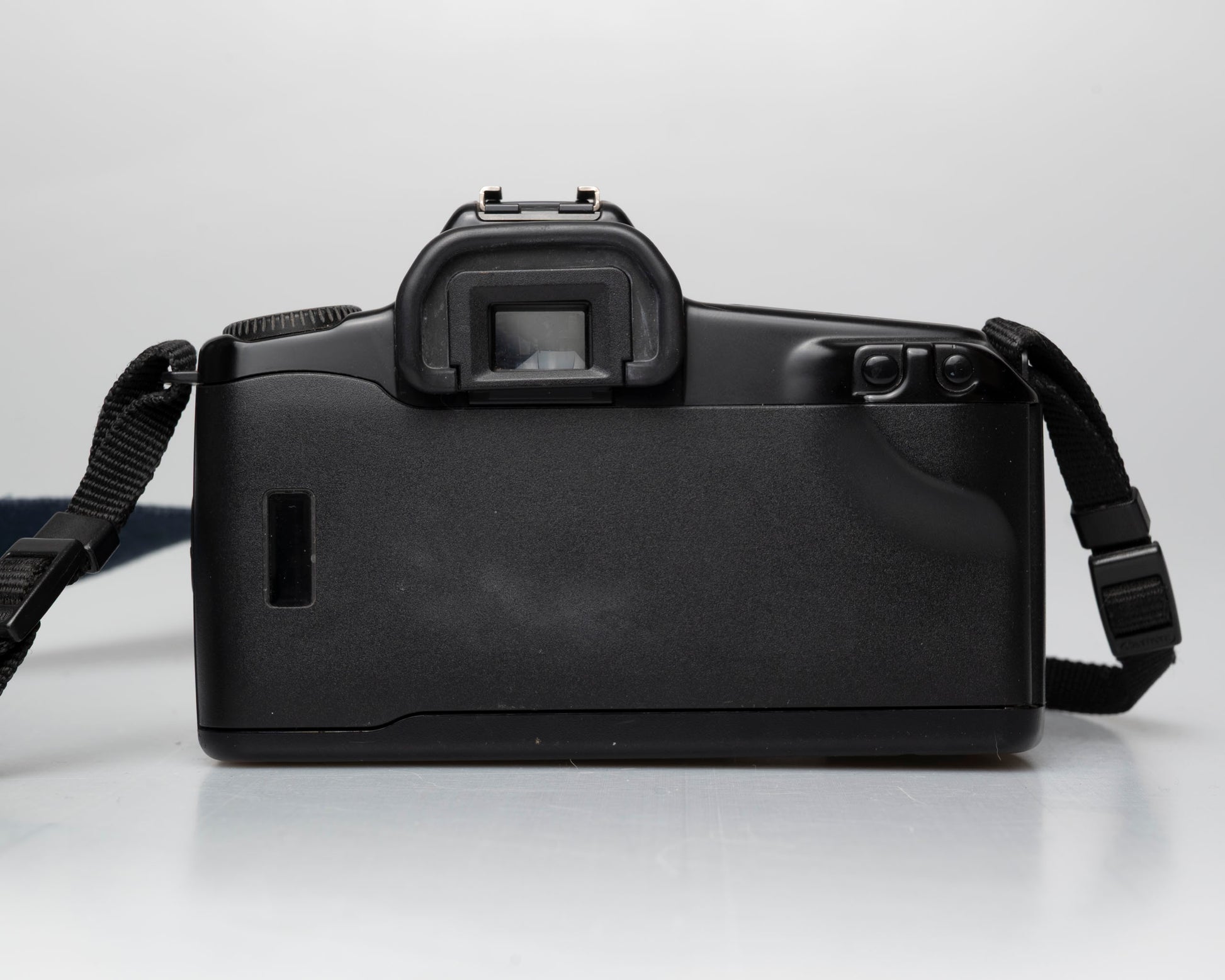 "Compact and light (500 g with battery). The camera features One-Shot AF and predictive AI Servo AF, shutter speed-priority AE (TTL), aperture-priority AE (TTL), Intelligent program AE, depth-of-field AE, and metered manual. The prewind system is used. Small, compact, affordable, and feature-laden, the camera was a hit product."