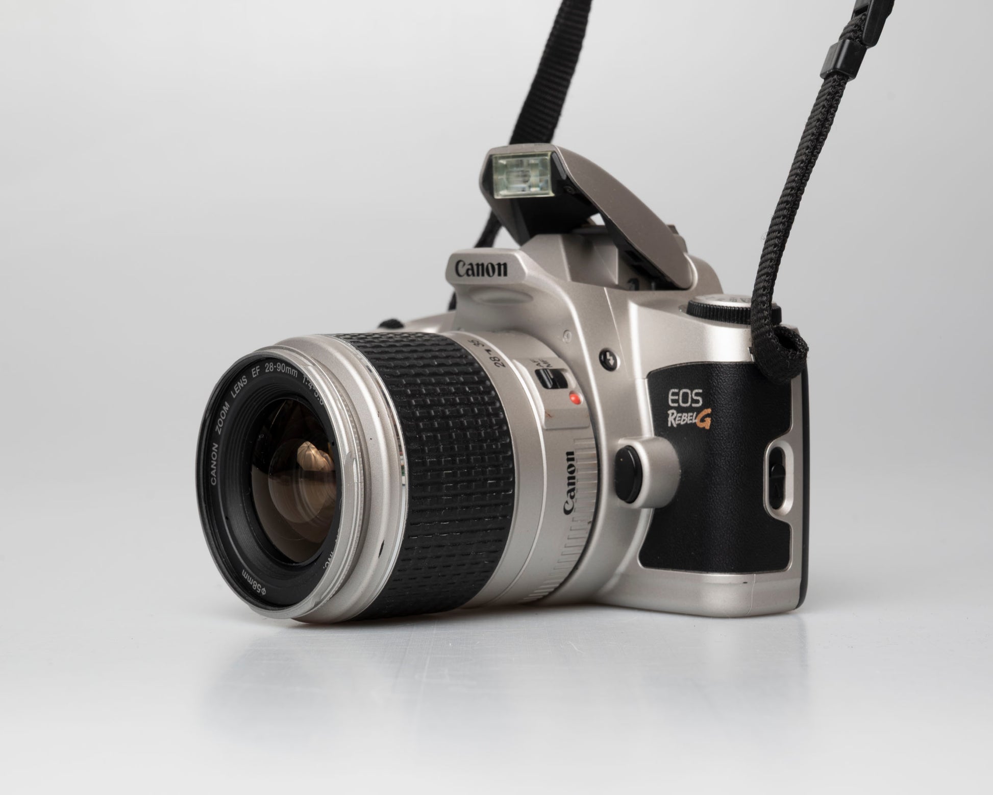 The Canon EOS Rebel G (or New EOS Kiss in Japan) is a compact, very lightweight, and easy-to-use autofocus 35mm film SLR camera from 1996. When using its 'auto' mode, the camera is as simple to use as a point-and-shoot but should you wish to go further, it offers a wide array of modes and manual controls. The included Canon EF 35-90mm f4-5.6 zoom (10 elements in 8 groups) is a compact, lightweight, general-purpose lens.