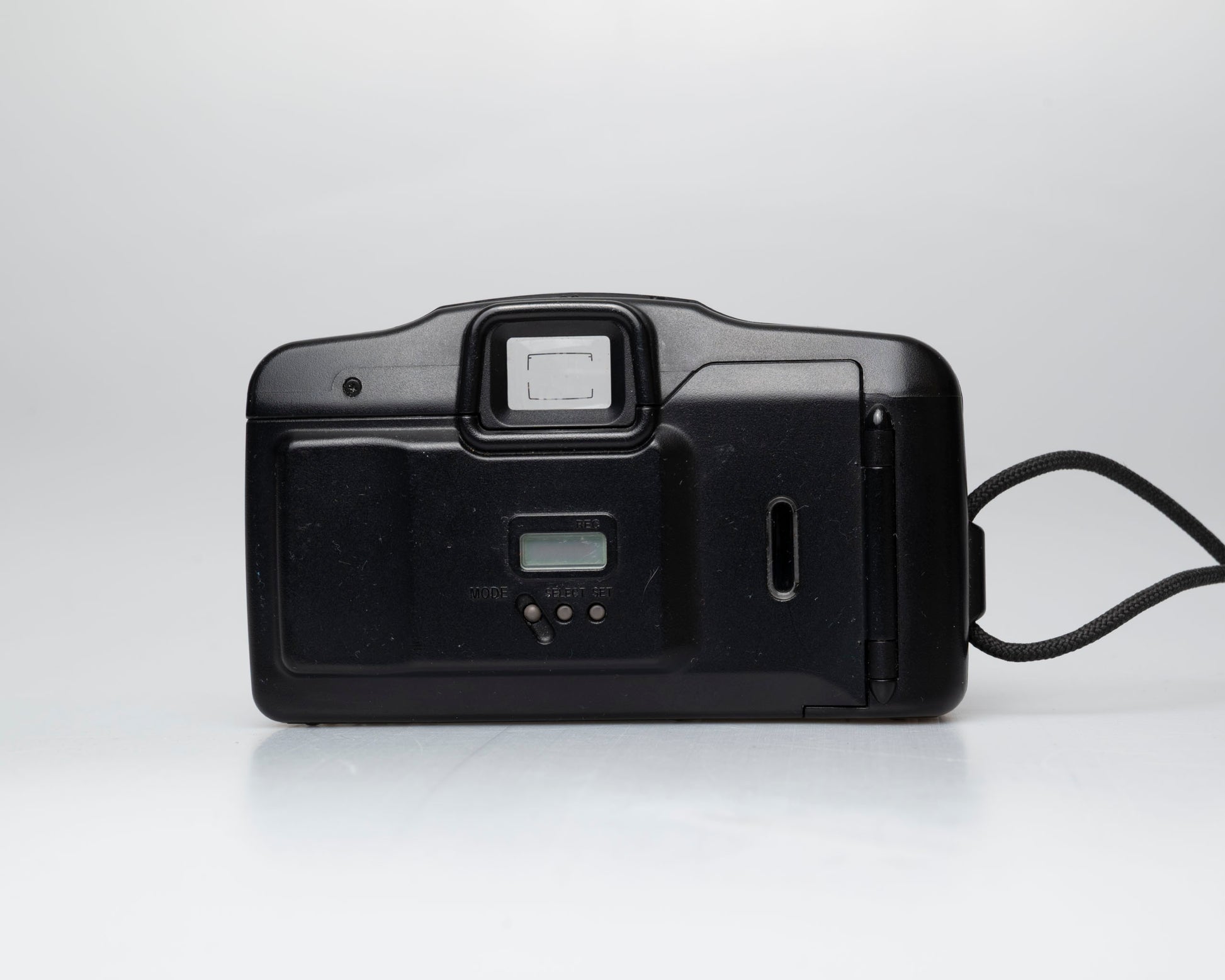 "A 35 mm single focal length compact camera featuring an extra-large, easy-to-see viewfinder. The model’s large viewfinder offers three times the viewing area found in conventional compact cameras, allowing subjects to be seen with greater ease and clarity. The feature even enables users to take pictures while wearing eyeglasses as the entire image area can be viewed up to a distance of two centimeters from the viewfinder. A Mode Dial, located on the face of the camera, consolidates all of the operation functions at the user’s fingertips. The camera has a stylishly designed sleek black body and features the Canon logo in raised silver letters."