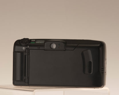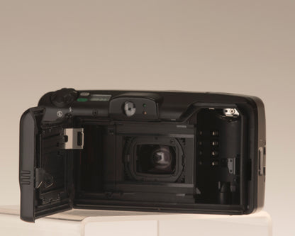 "A compact 35mm camera equipped with 38-85mm 2.2x zoom lens which includes an aspherical lens element to deliver high contrast and sharp images throughout the entire zoom range. An advanced 3-point AiAF autofocus system also ensures outstanding results, even when the main subject is not located in the center of the frame. Other features include an RT (Real Time) release mode, which enables users to capture the decisive moment in any shooting situation, as well as standard and panorama (Japanese model only, with date imprint) picture formats while shooting on the same roll of film. A Mode Dial located on the top of the camera puts all of the operation functions, including the OFF switch and six different shooting modes, at the user’s fingertips. The camera has a stylish thin, flat-body design."