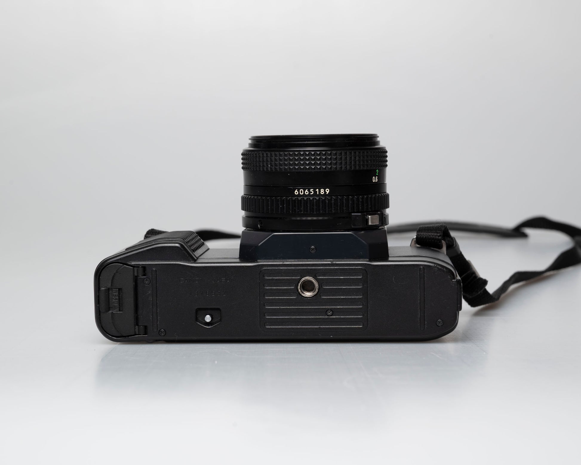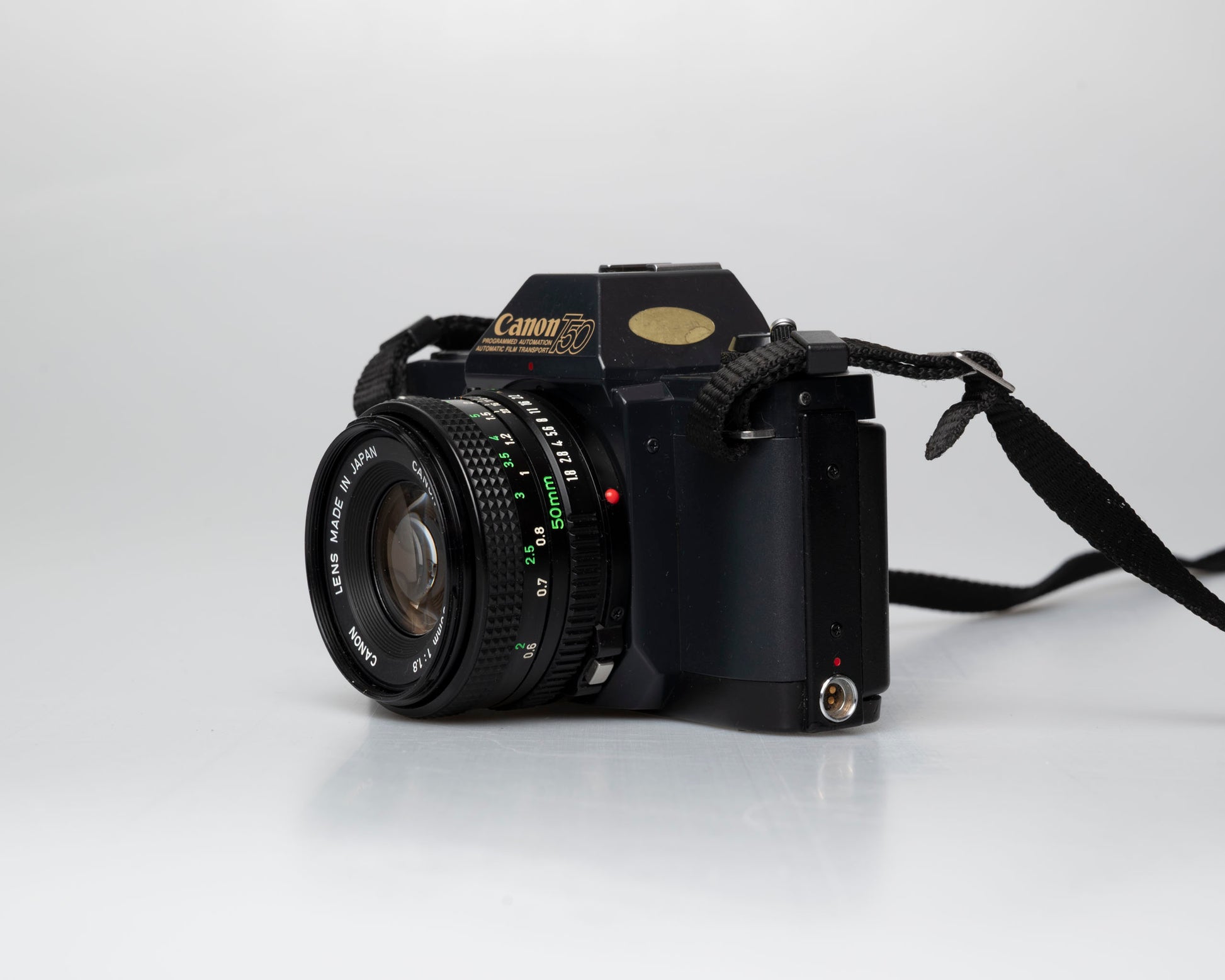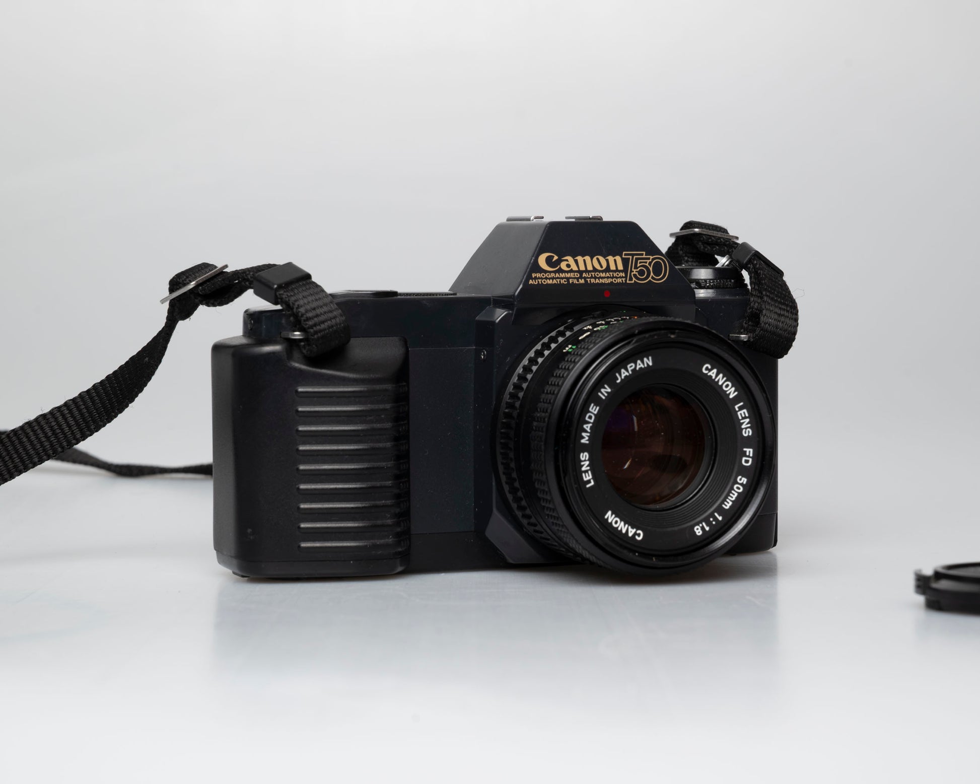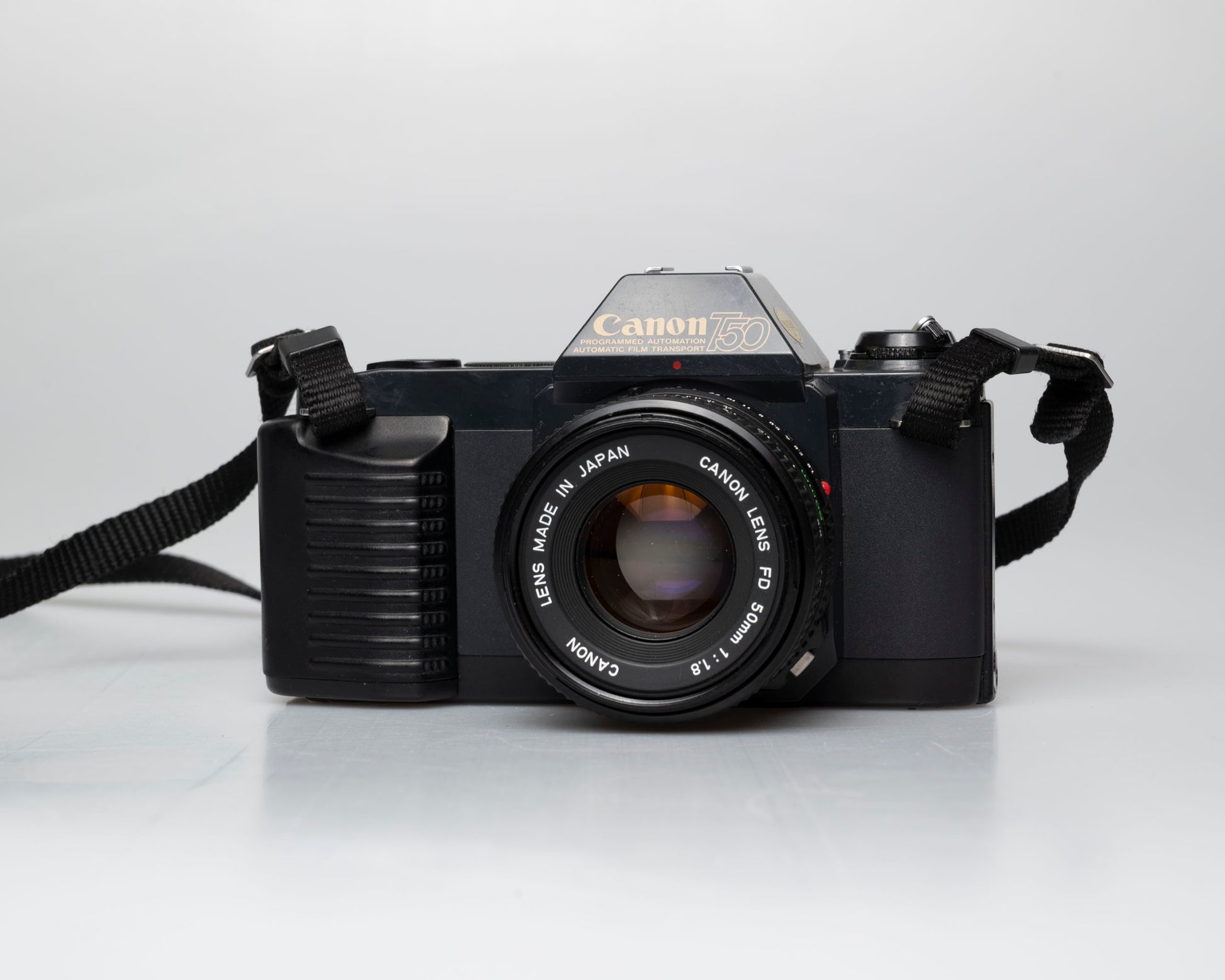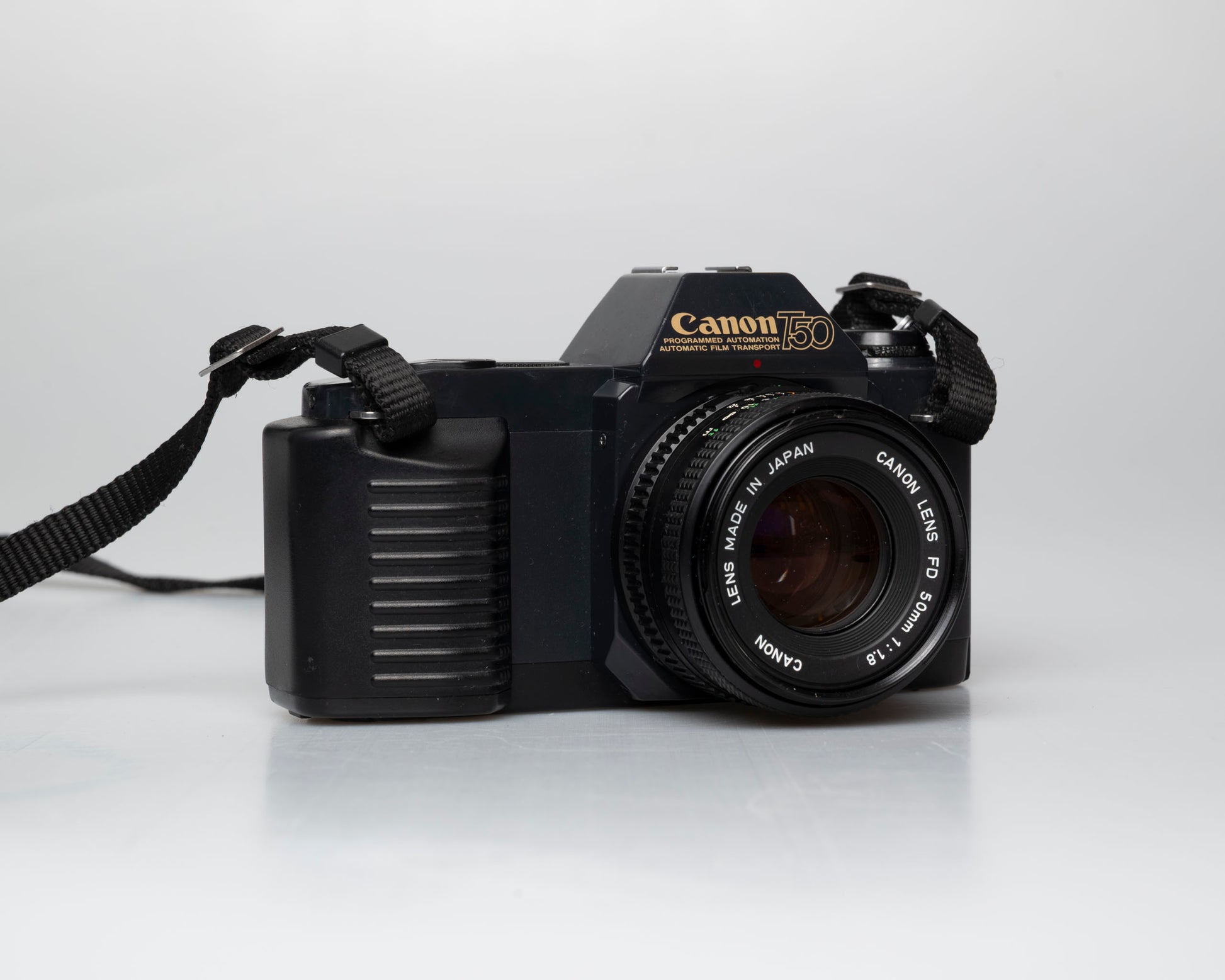 The Canon T50 is a minimalist FD mount SLR from the early 1980s. It comes with a sharp Canon 50mm F1.8 FD lens.