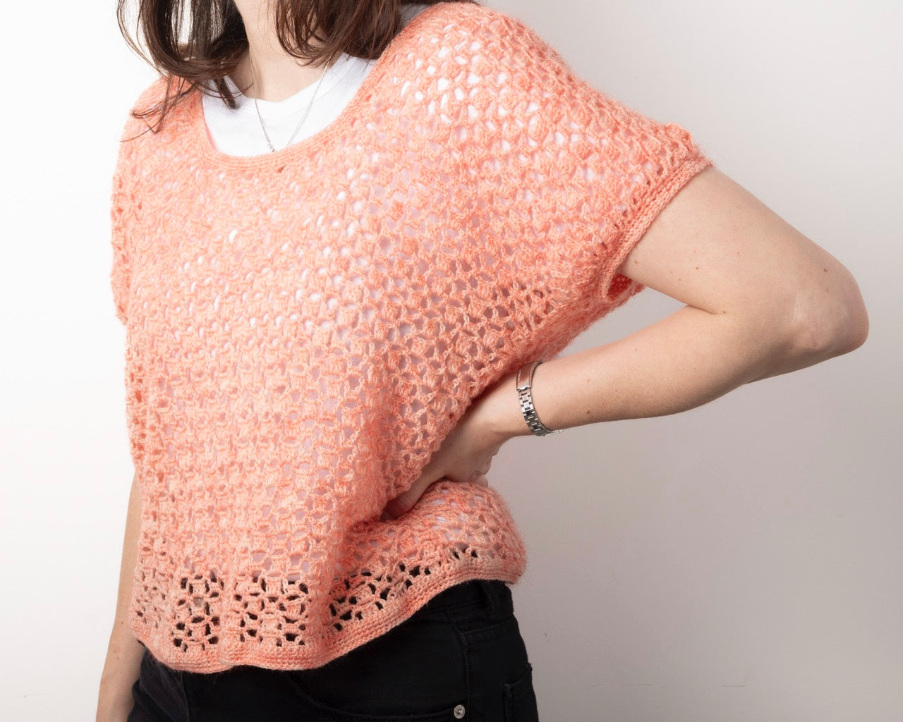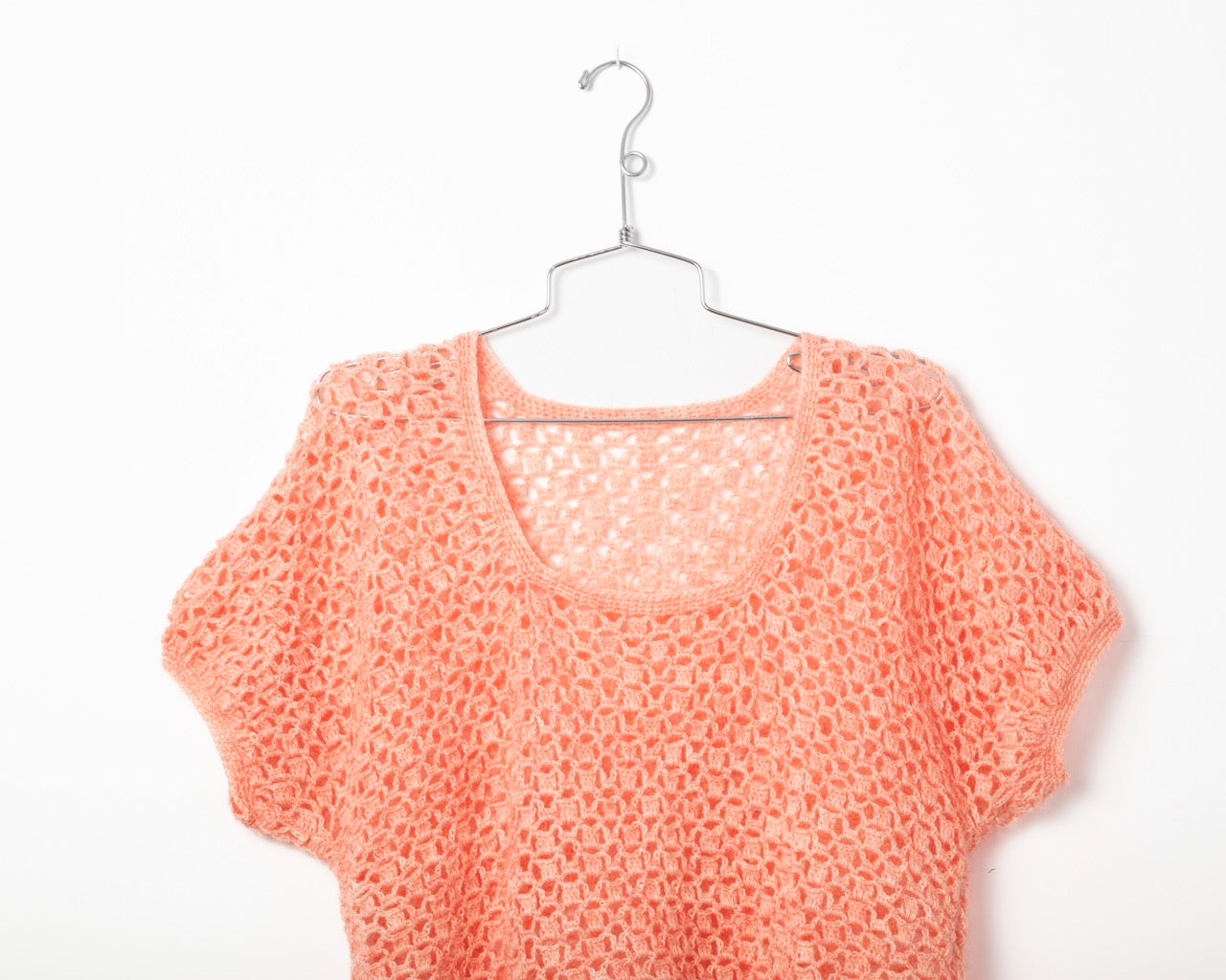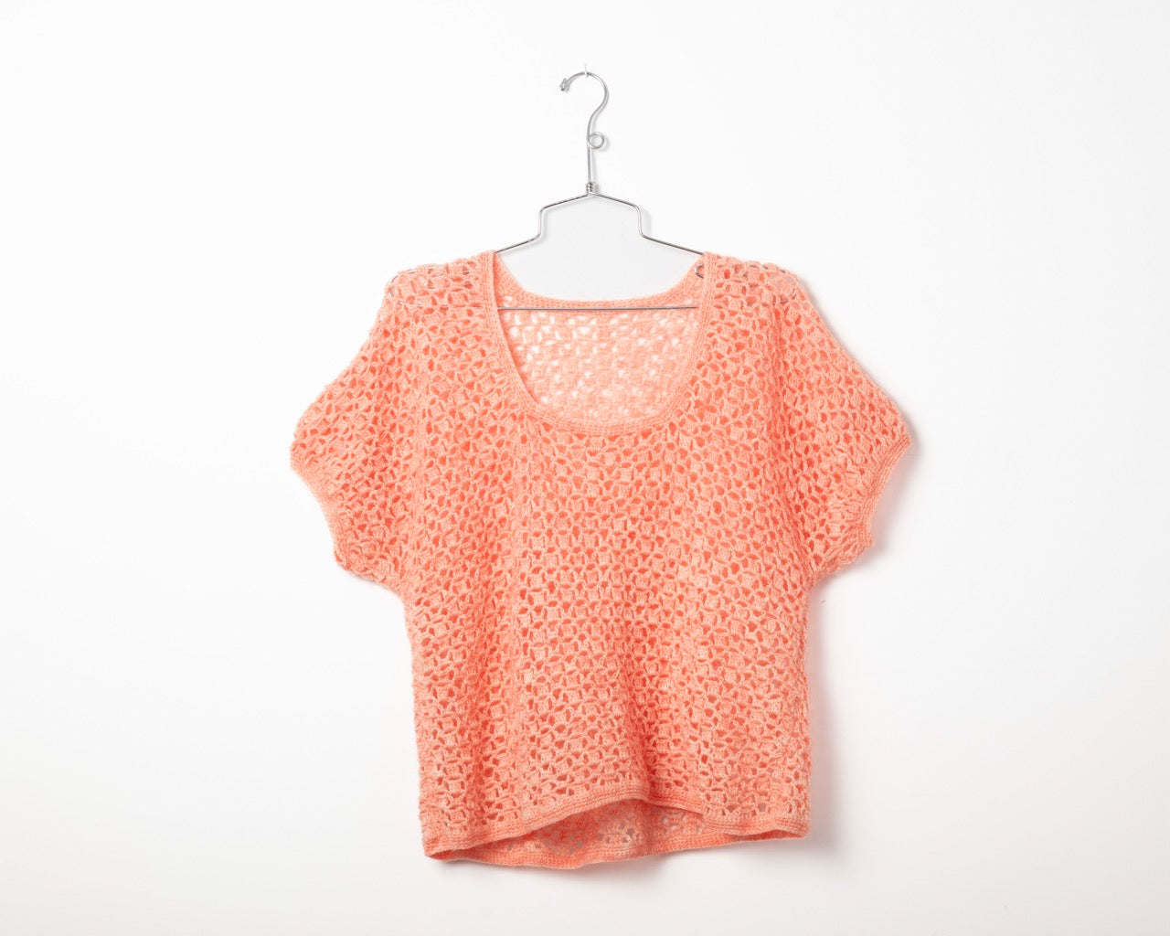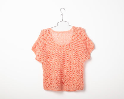 Coral crochet short-sleeved sweater. This item is handmade and has no tag, but the yarn appears to be wool or wool-blend. Scoop neck, boxy fit, and short dolman sleeves.