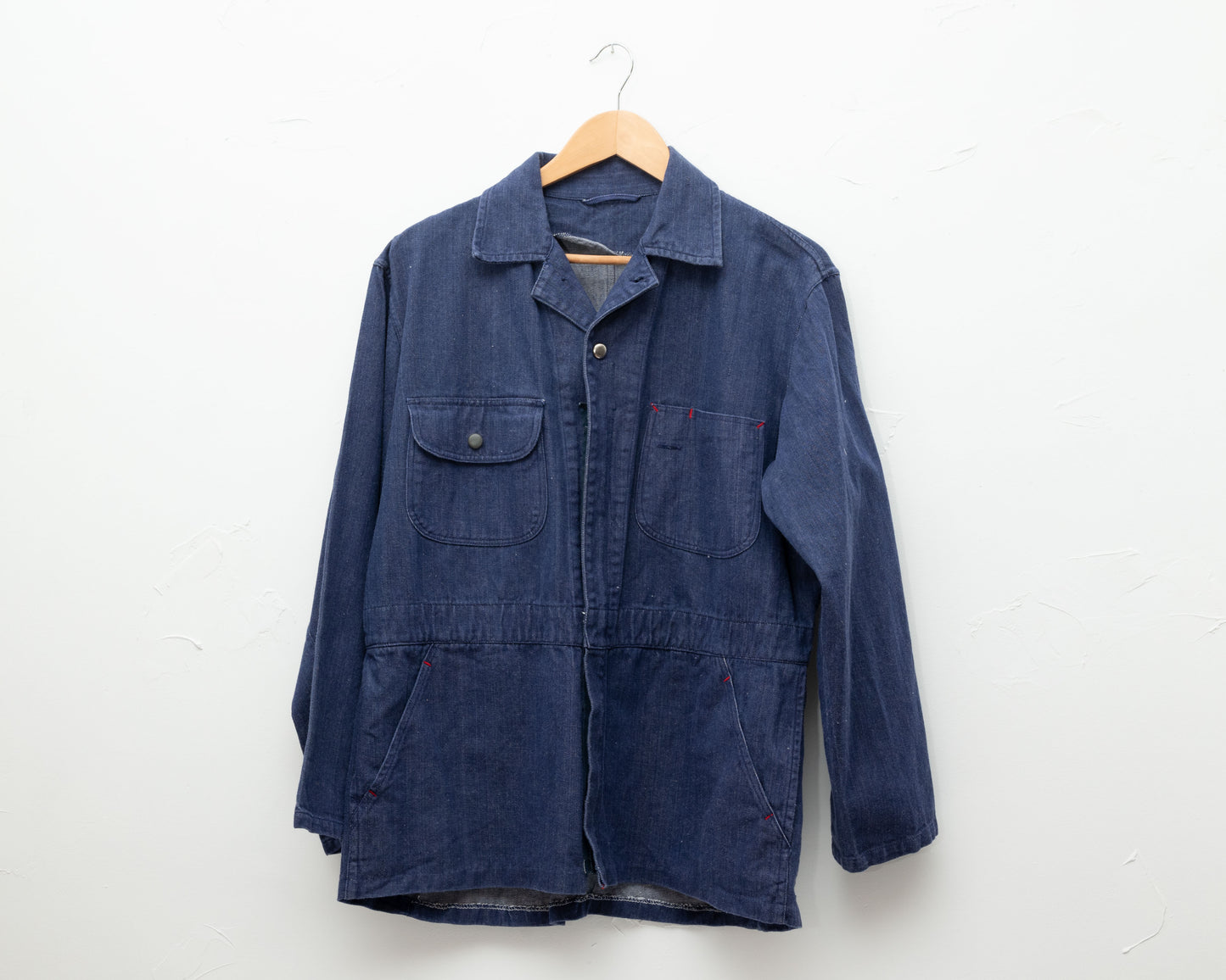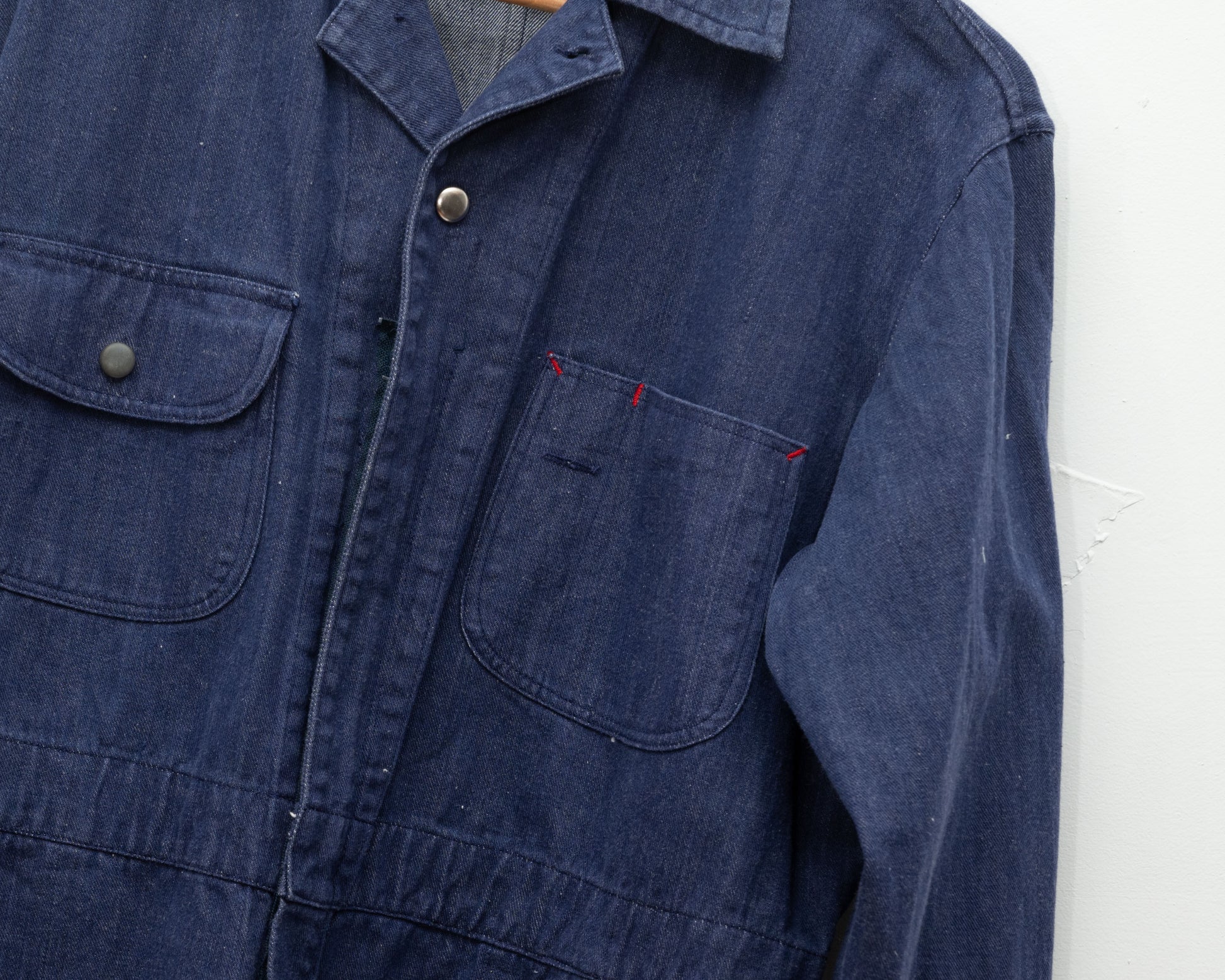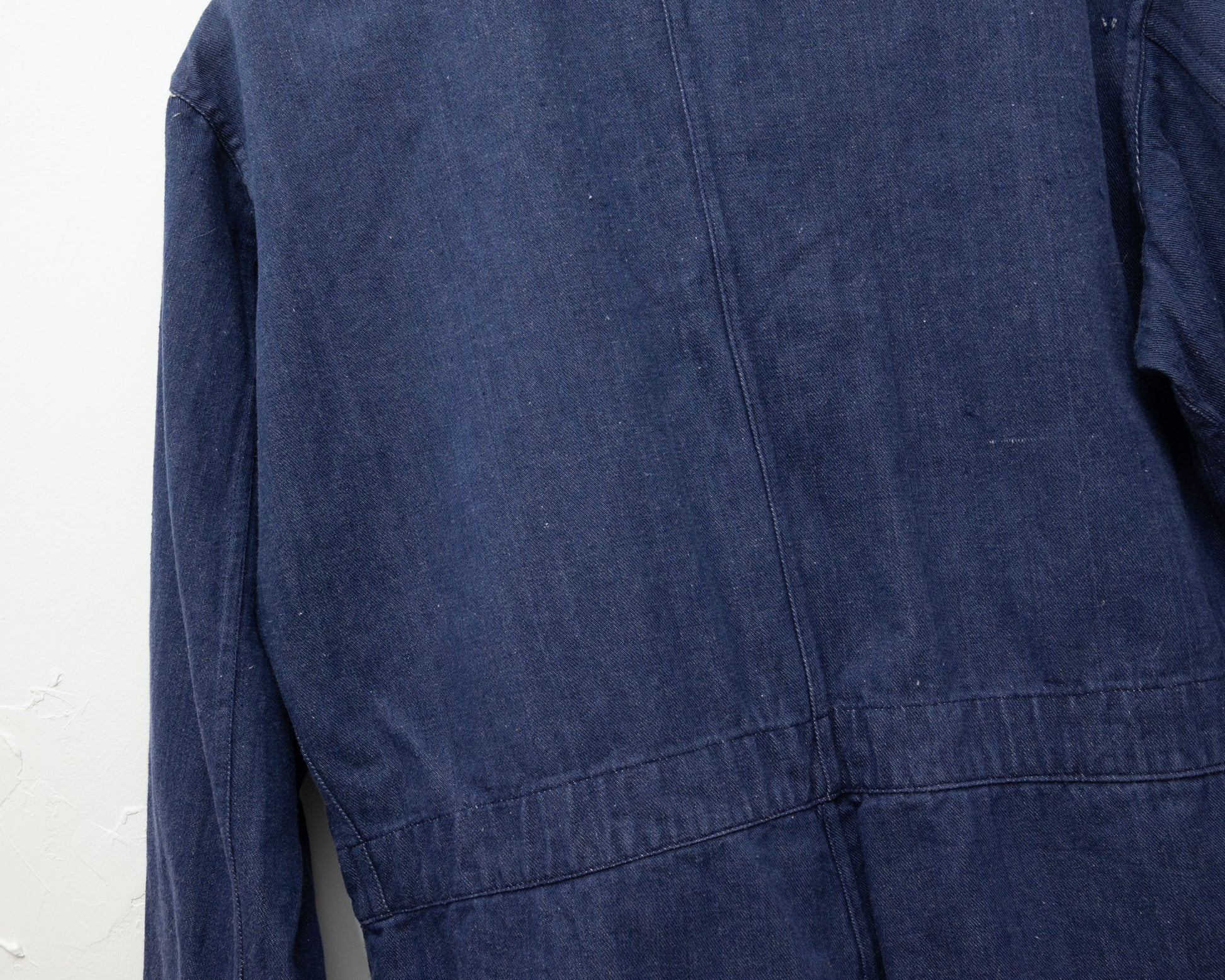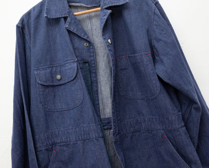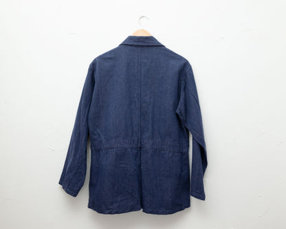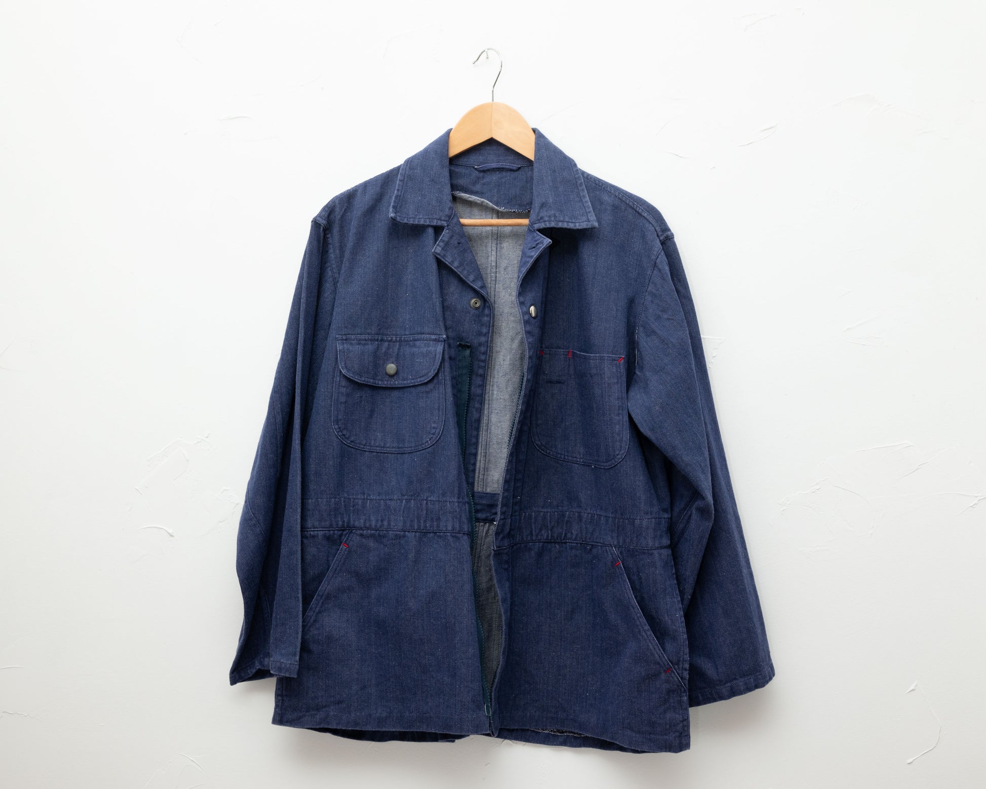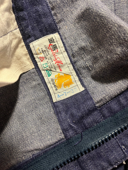 Deep indigo raw denim work jacket. 100% cotton. Vintage item made in China by Golden Horse. Originally tailored from coveralls (you can see a trace of the back pockets).