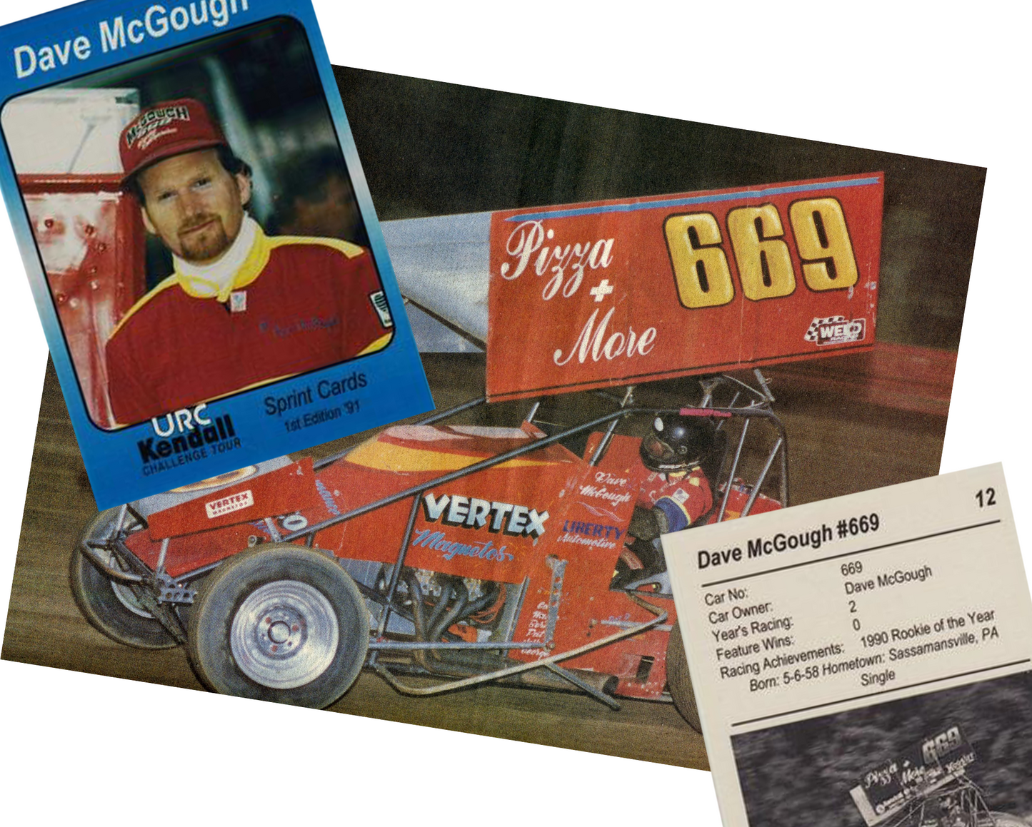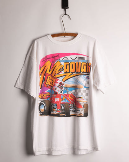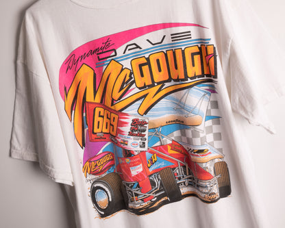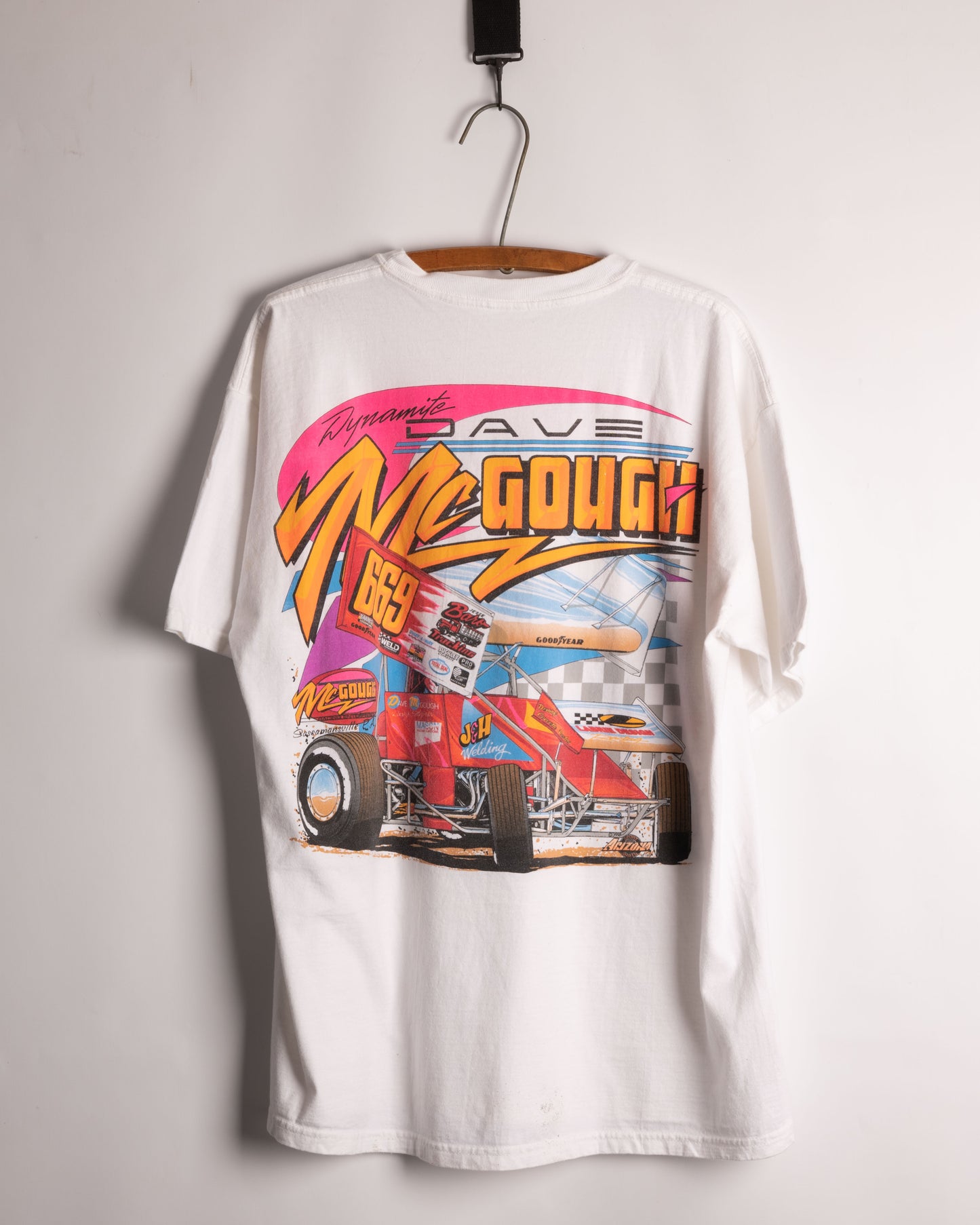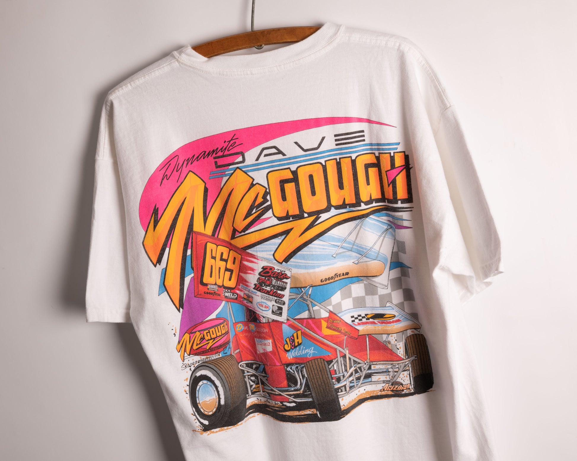A very hype t-shirt for sprintcar driver 'Dynamite' Dave McGough of Sassamansvile, PA. Same colourful print on front and back. Tag removed.