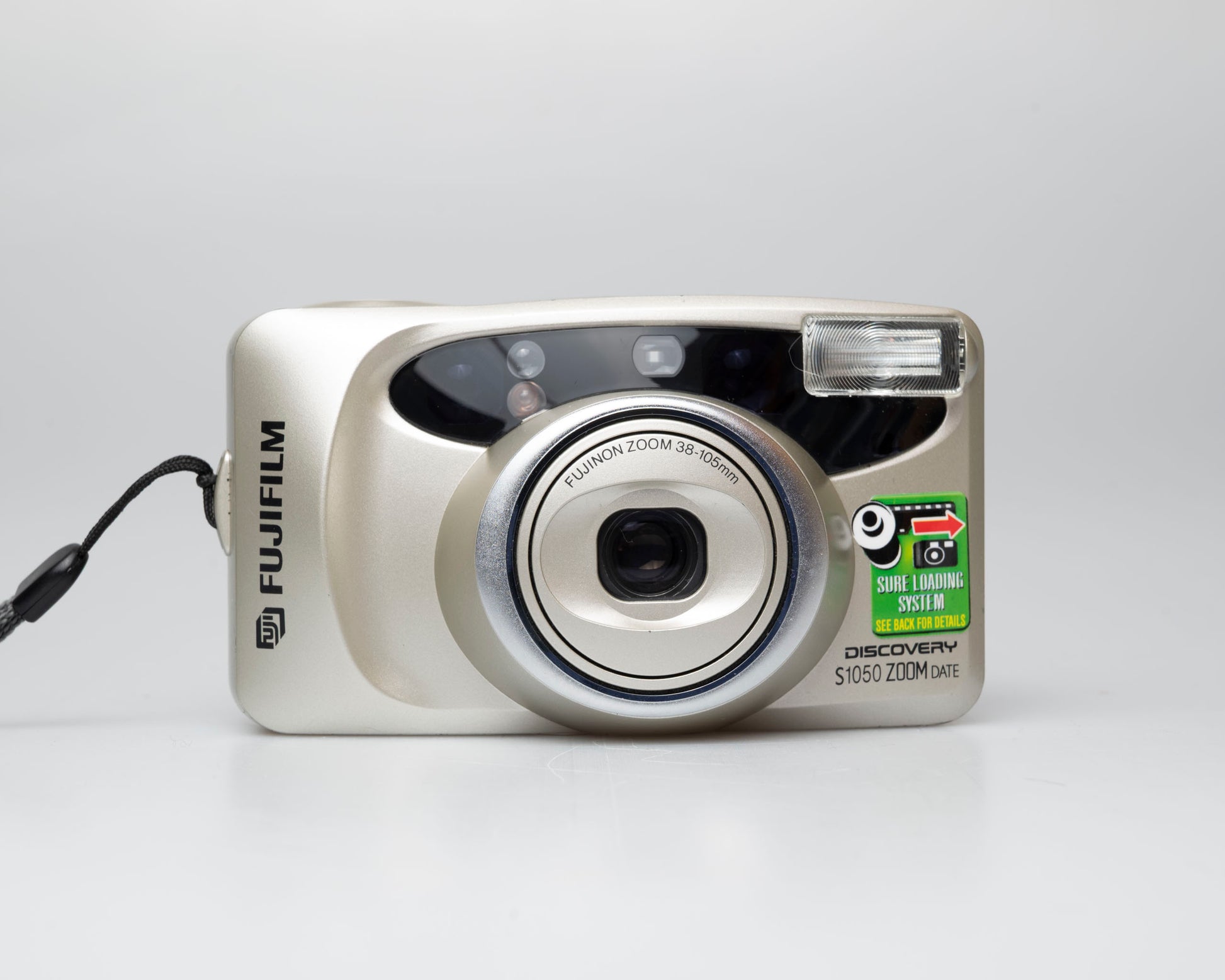 The Fujifilm Discovery S1050 Zoom Date is a versatile basic point-and-shoot 35mm film camera. It offers a versatile zoom range (38-105mm) and a very simple and foolproof 'sure-loading' system where you just drop the film in the camera.