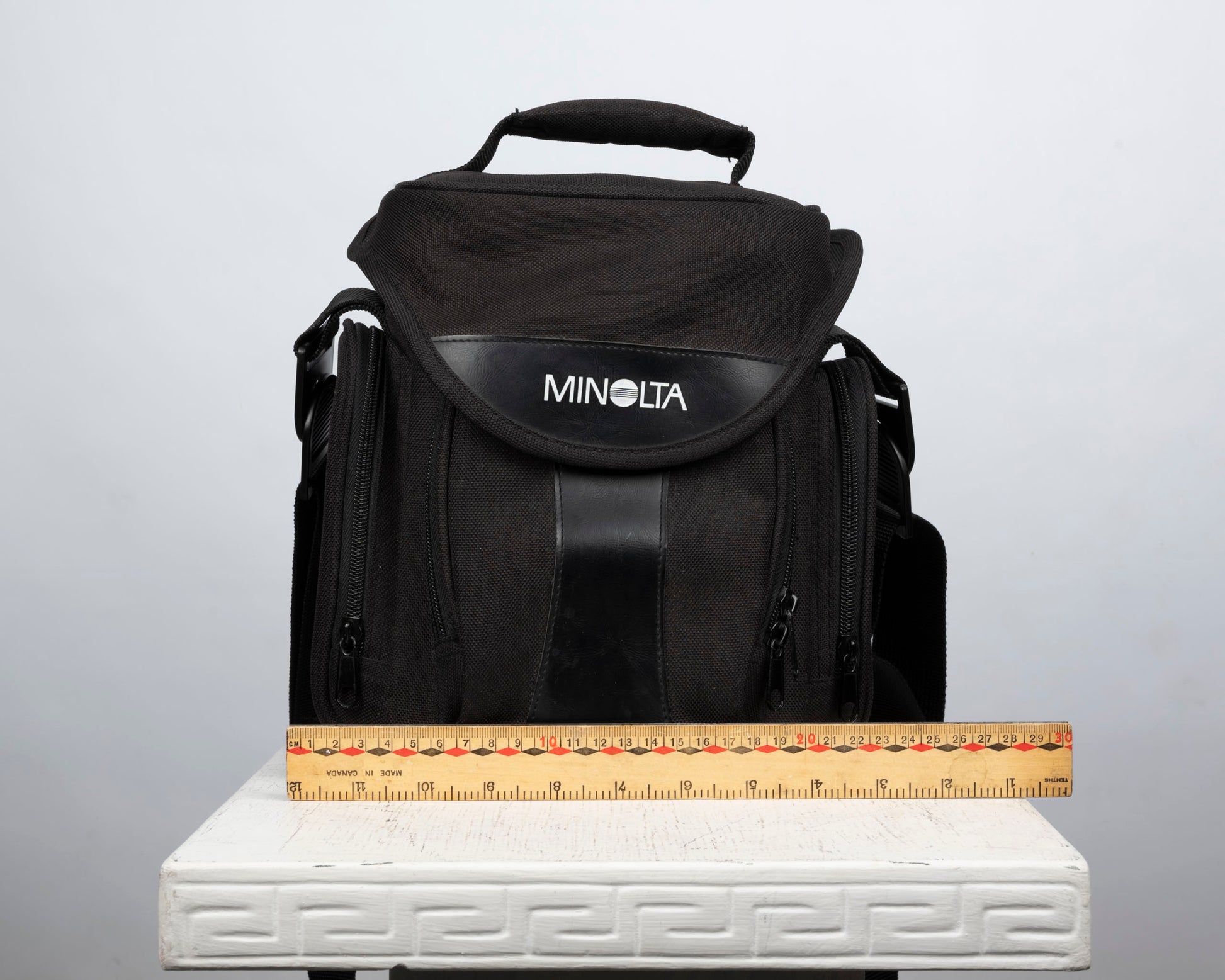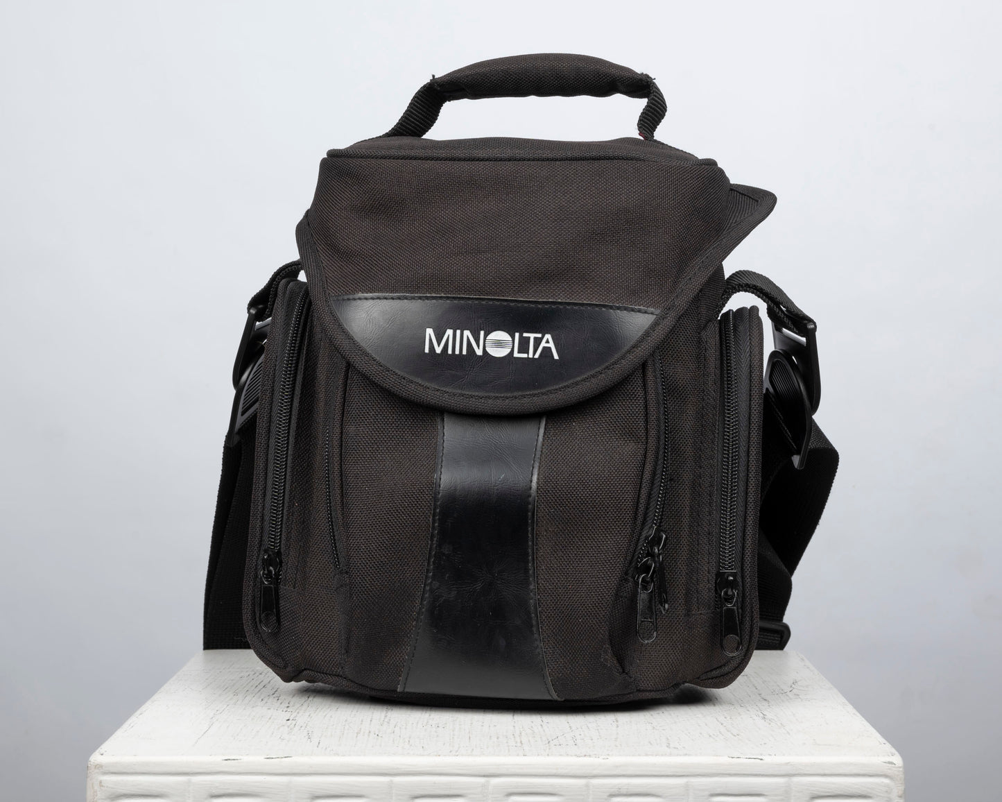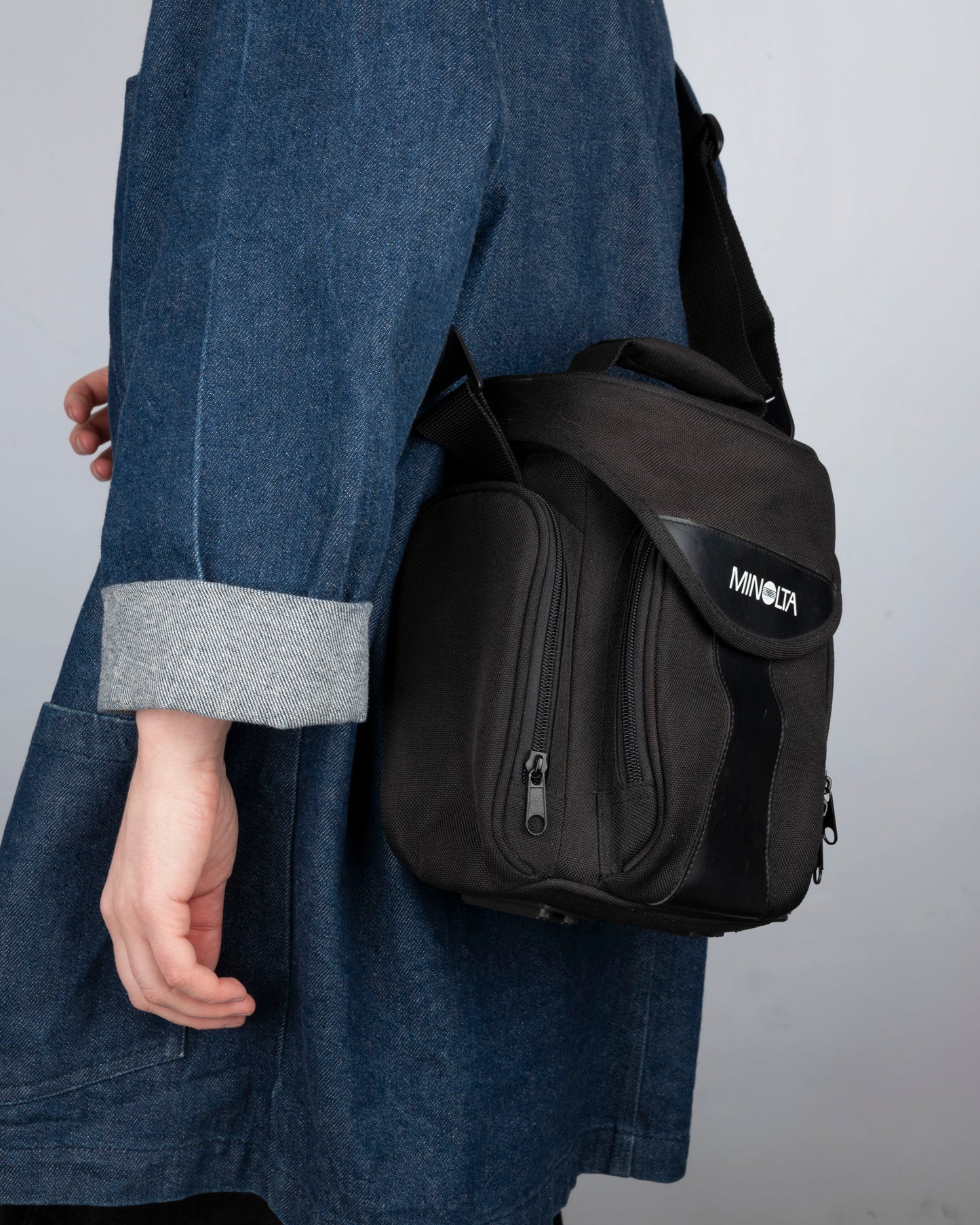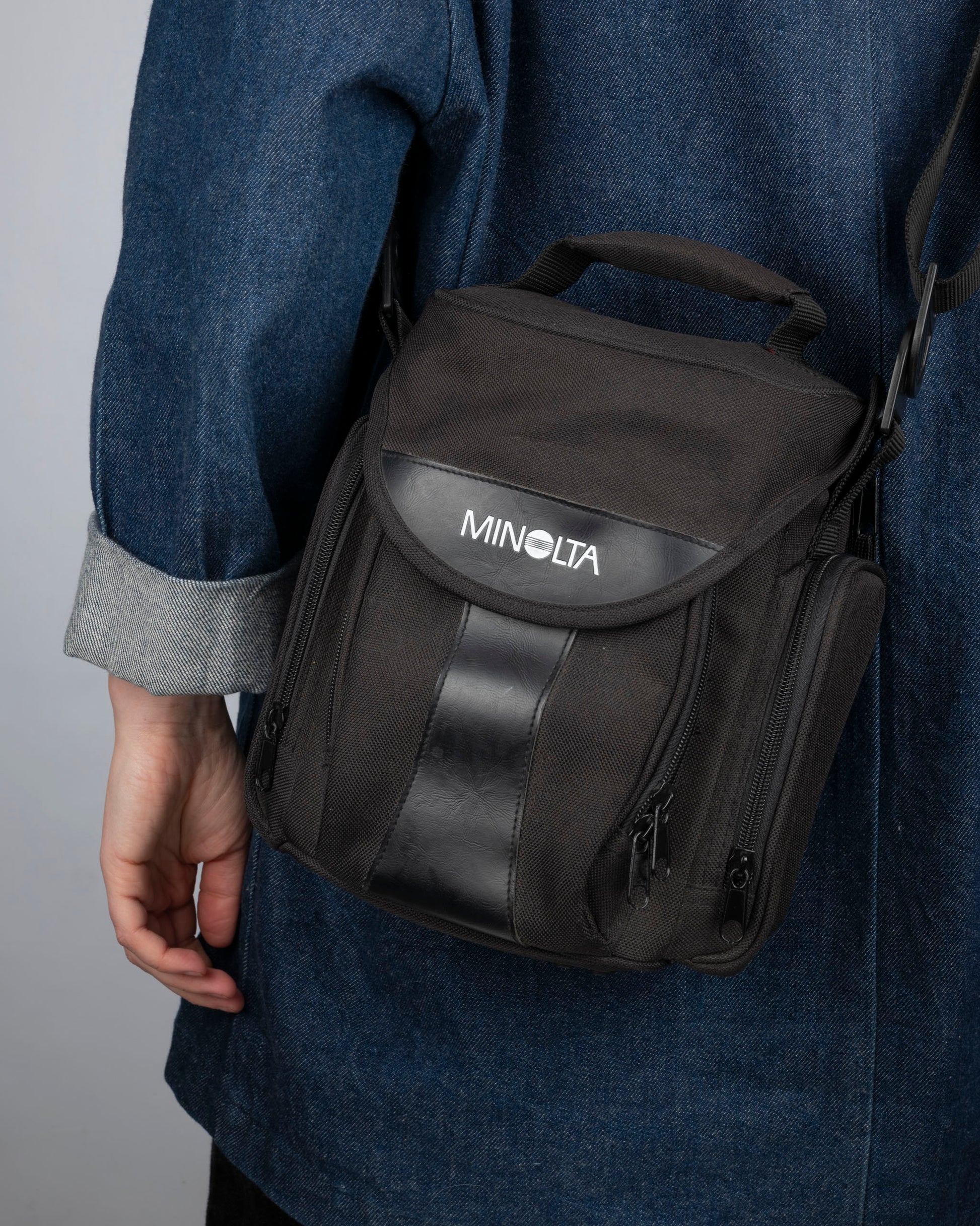 This is a vintage late 1990s compact Minolta camera shoulder bag. It was released around the same time as the company's later, lightweight SLRs (eg Maxxum 5, Maxxum QTsi). It features an adjustable main compartment as well as zippered front and side pockets.