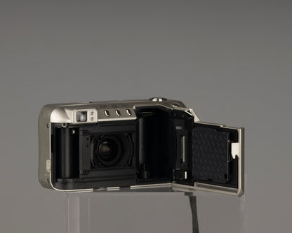 The camera's functions were tested with batteries and a roll of film (the film was not developed). All modes are working correctly. The camera is in good aesthetic condition (see photos) with some minor wear on the body. A case is included. As mentioned above, the built-in lens cover was removed.