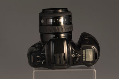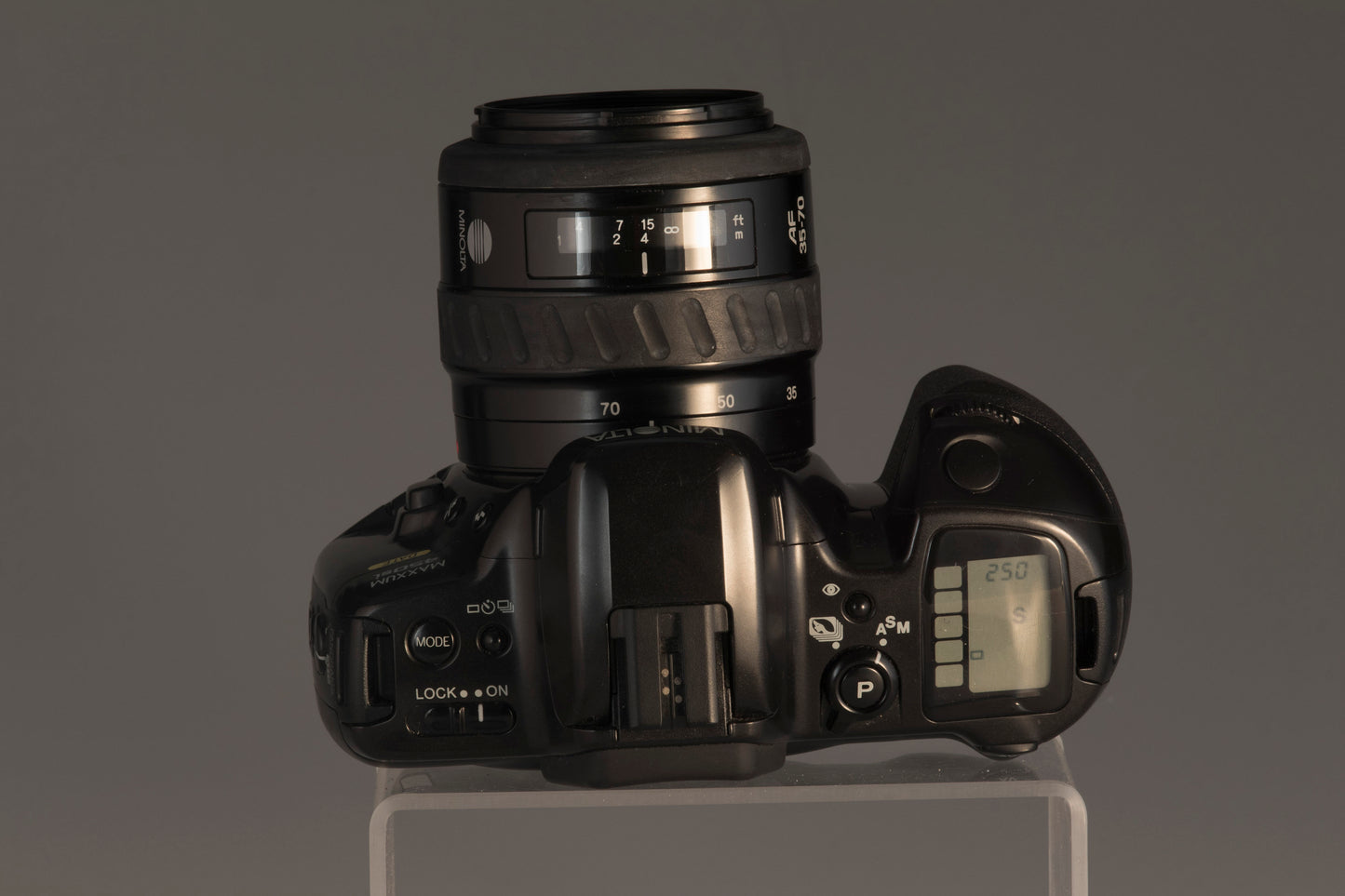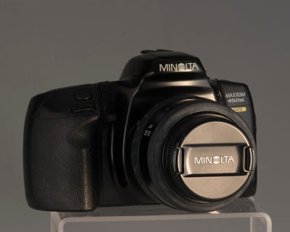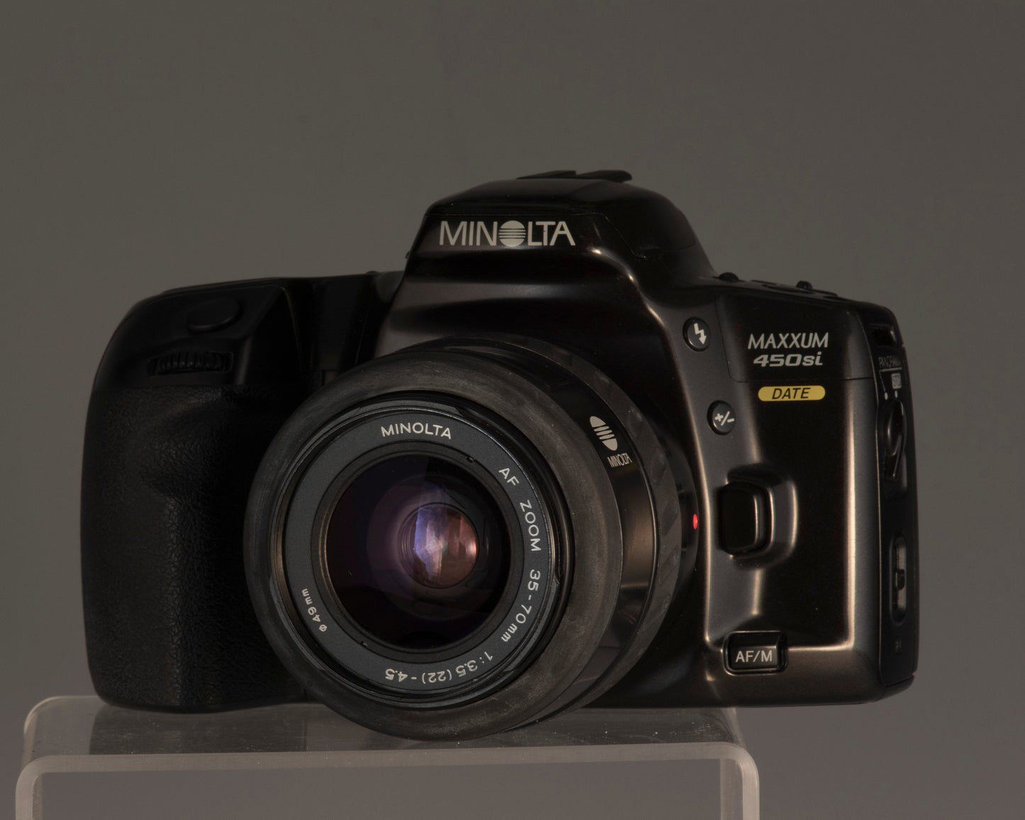 The Minolta Maxxum 450si is a sophisticated 35mm film SLR camera from the early 90s. It feature full manual, shutter priority, aperture priority, and program exposure modes. The included lens is a flexible 35-70mm f3.5-4.5 autofocus zoom. It also features a pop-up integrated flash.