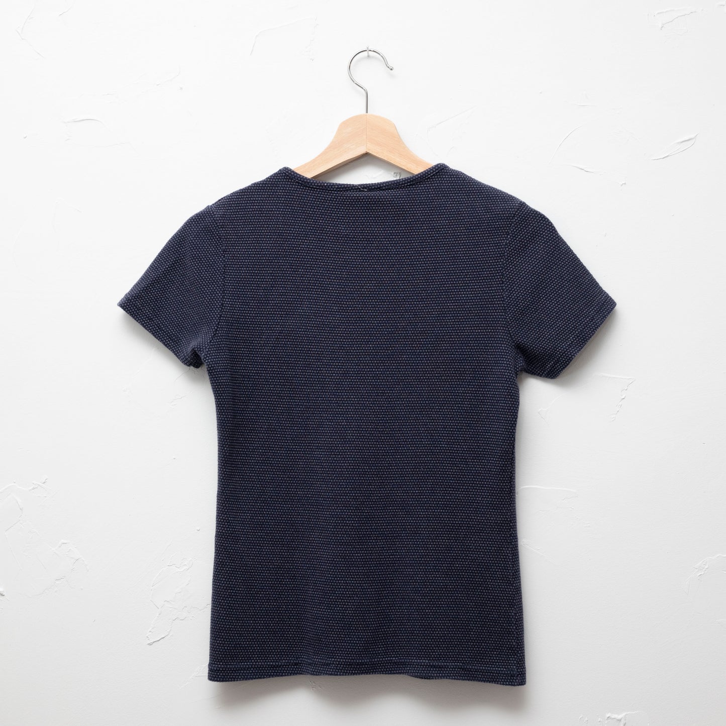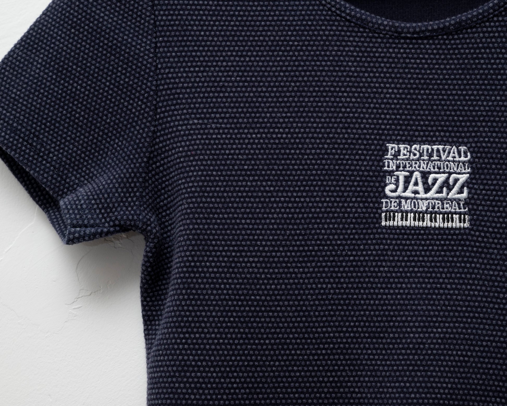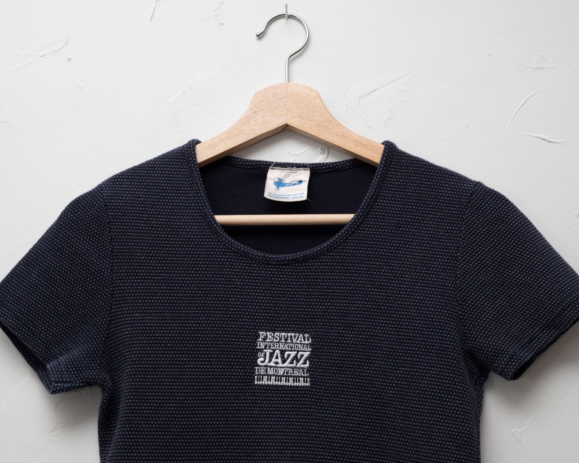 Fitted t-shirt with Montreal Jazz Festival embroidered logo. Dark grey/purple/navy textured cotton knit fabric. Made in Canada by Azur.