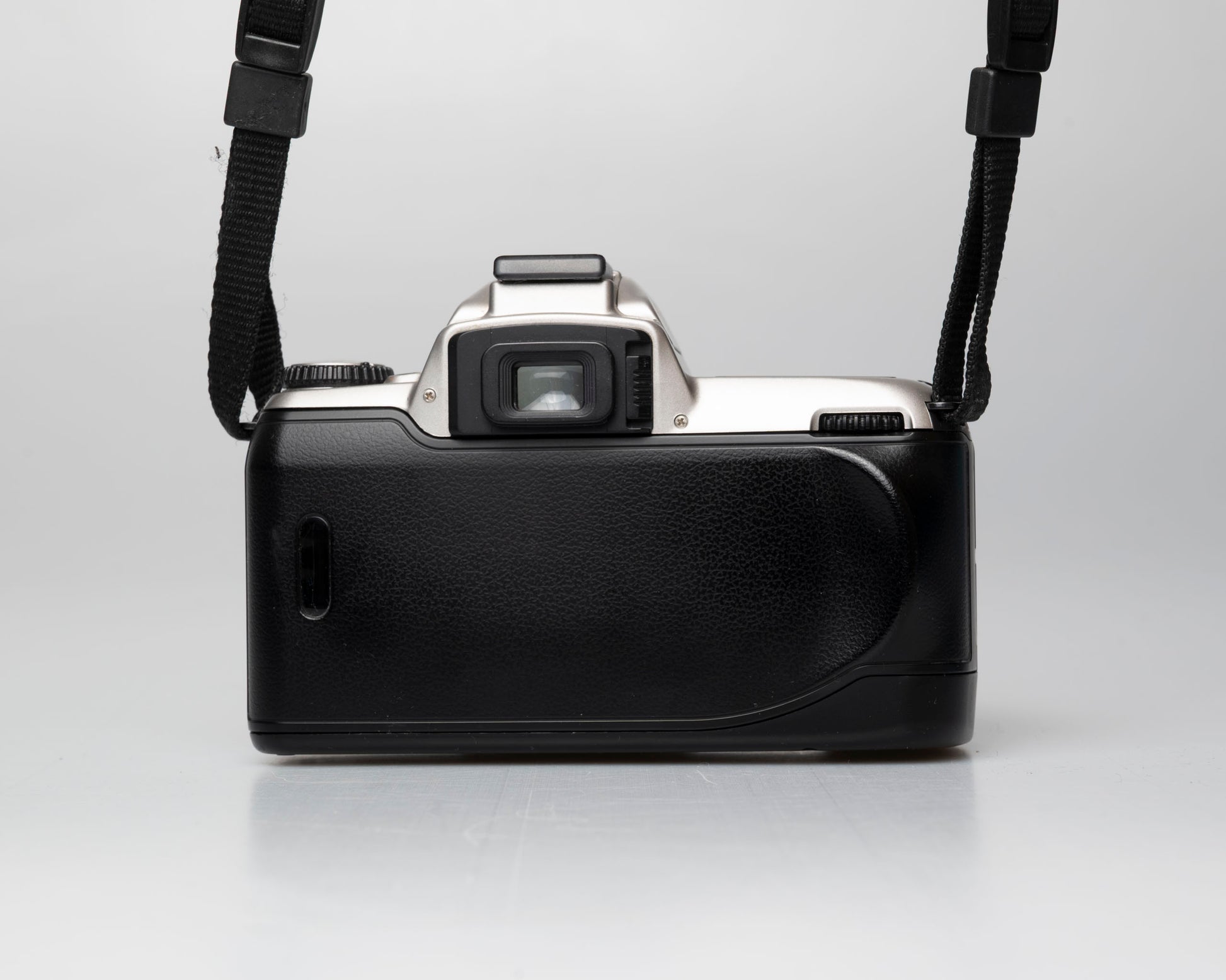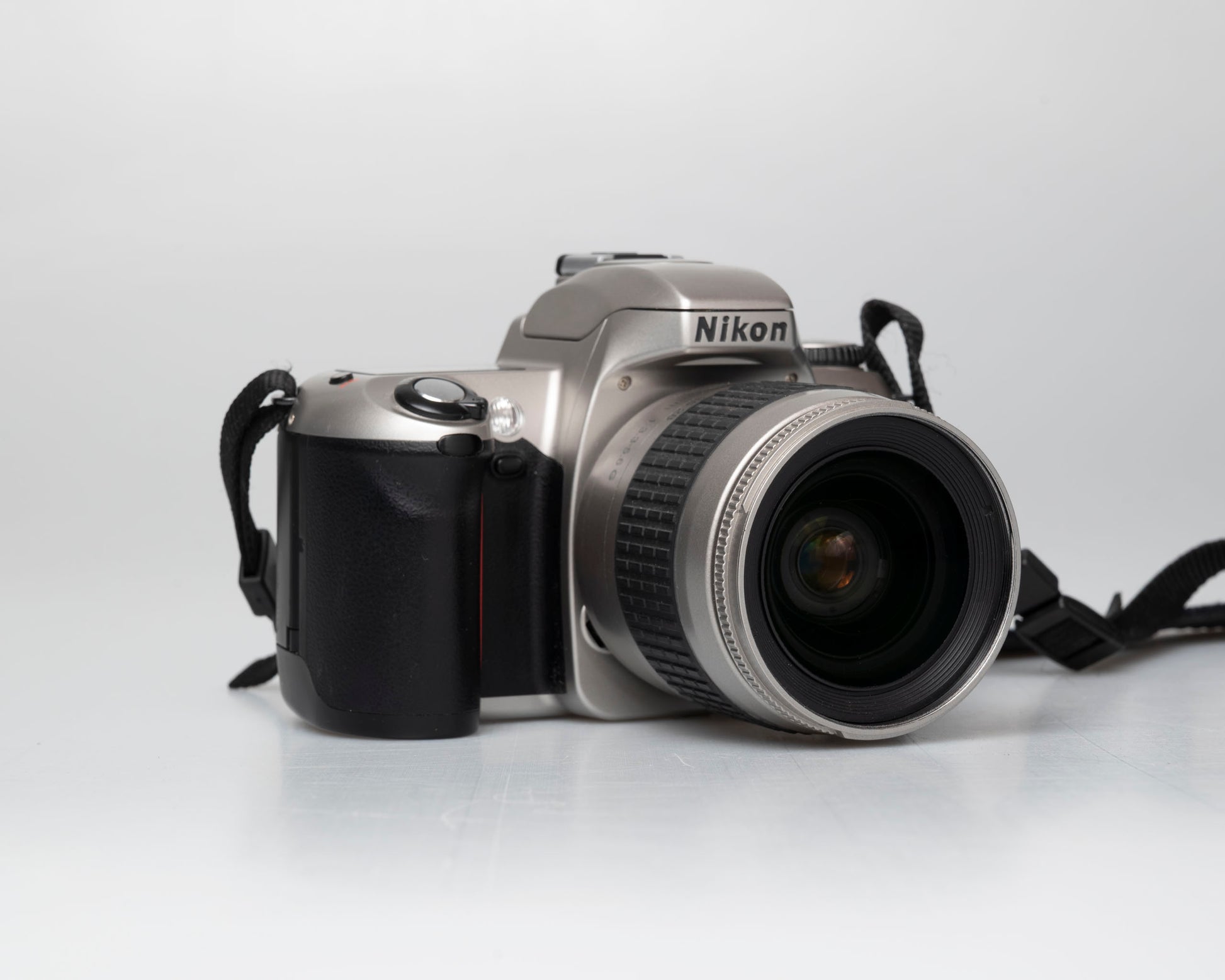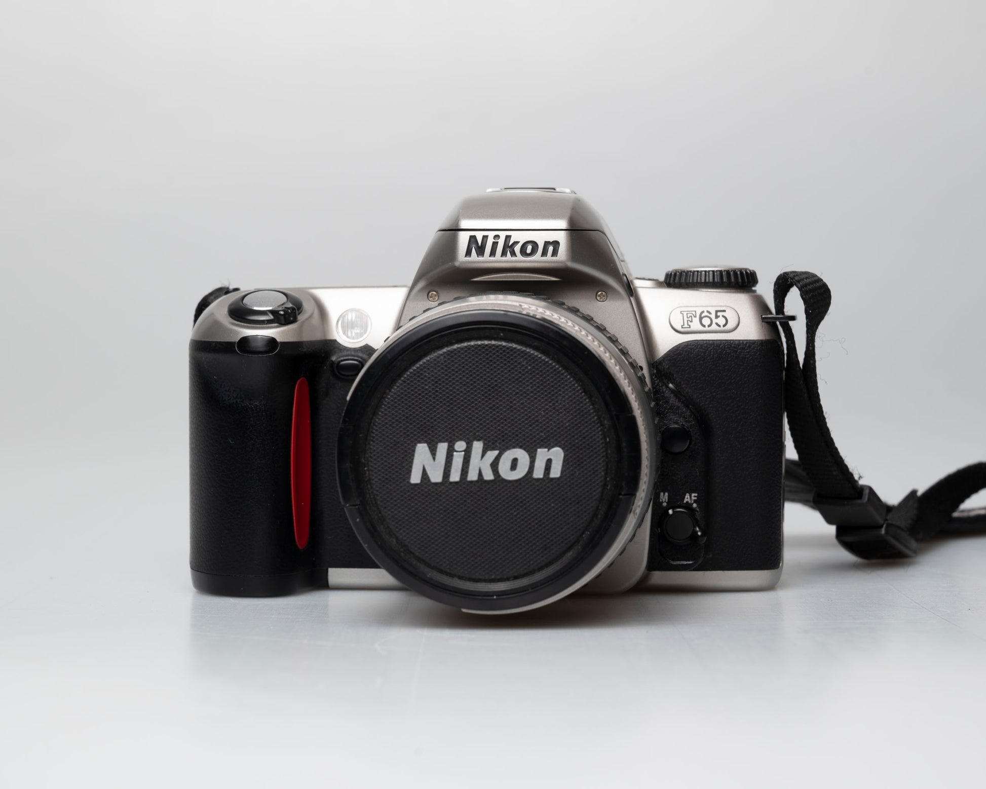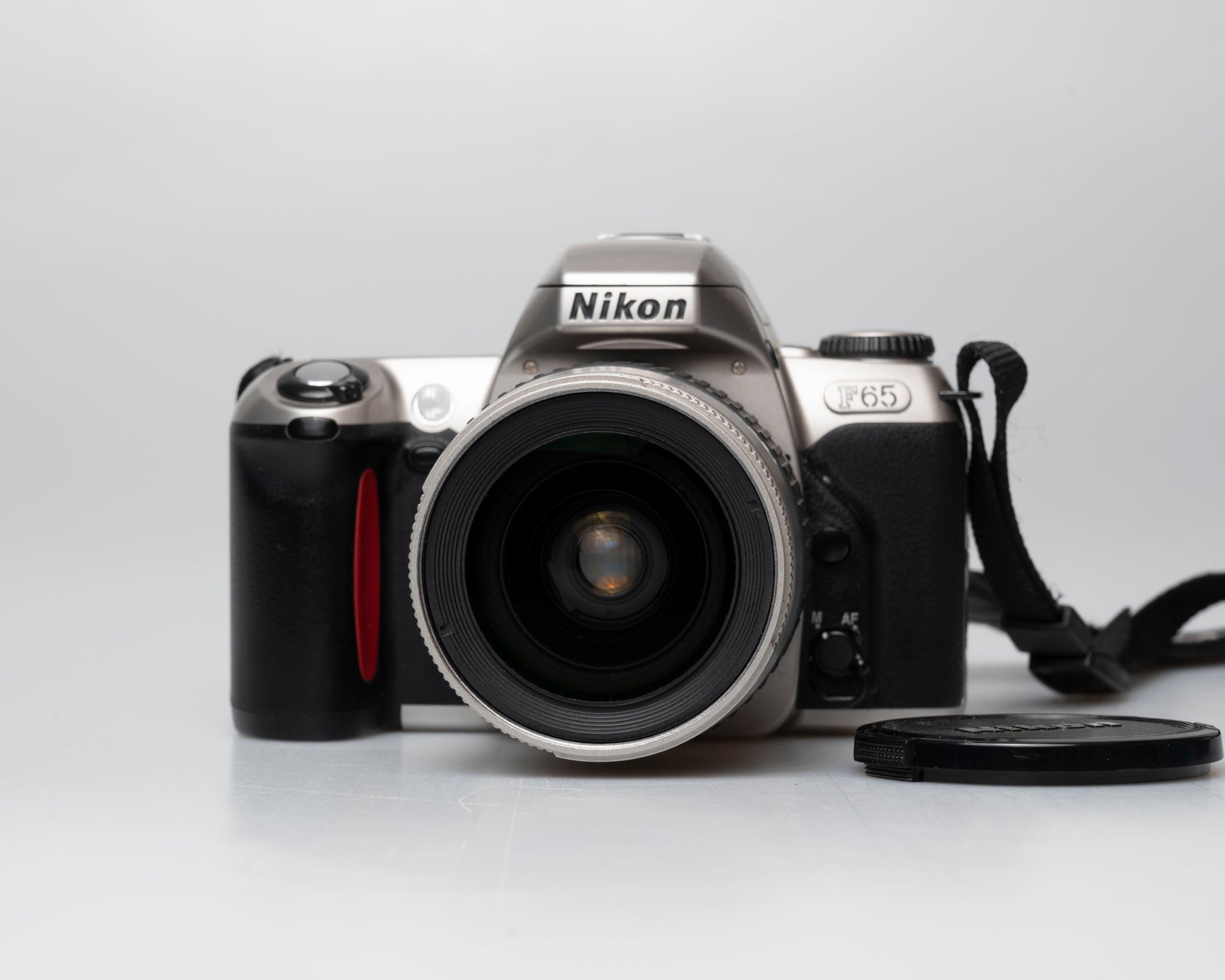 The Nikon F65 is a sophisticated 35mm film SLR from the early aughts. The included lens is a versatile and lightweight AF Nikkor 28-80mm zoom.