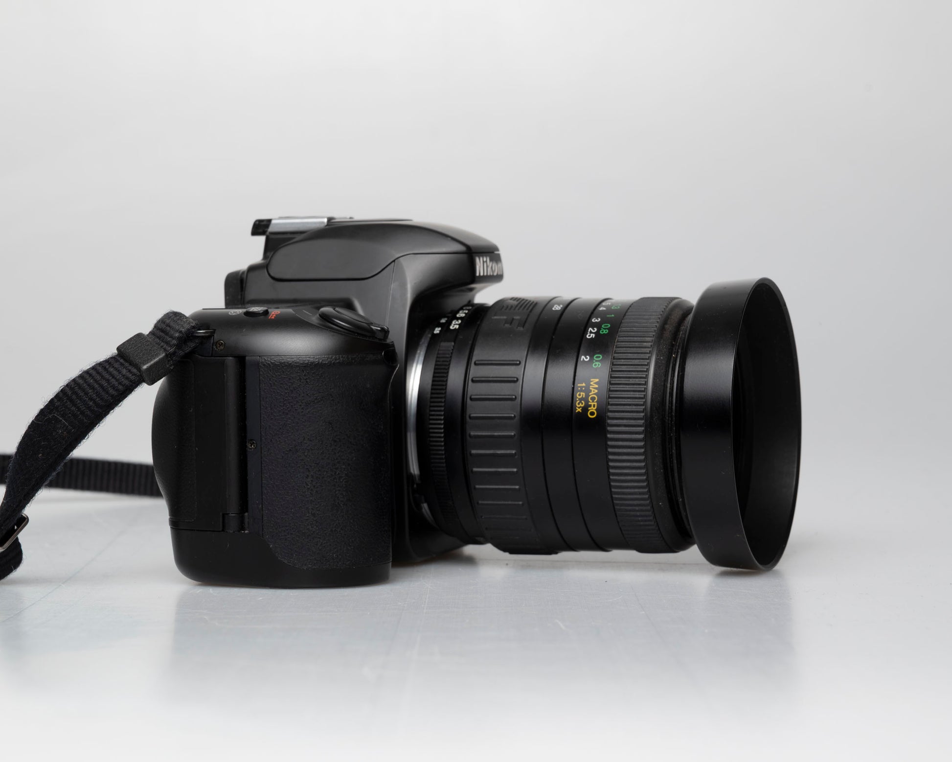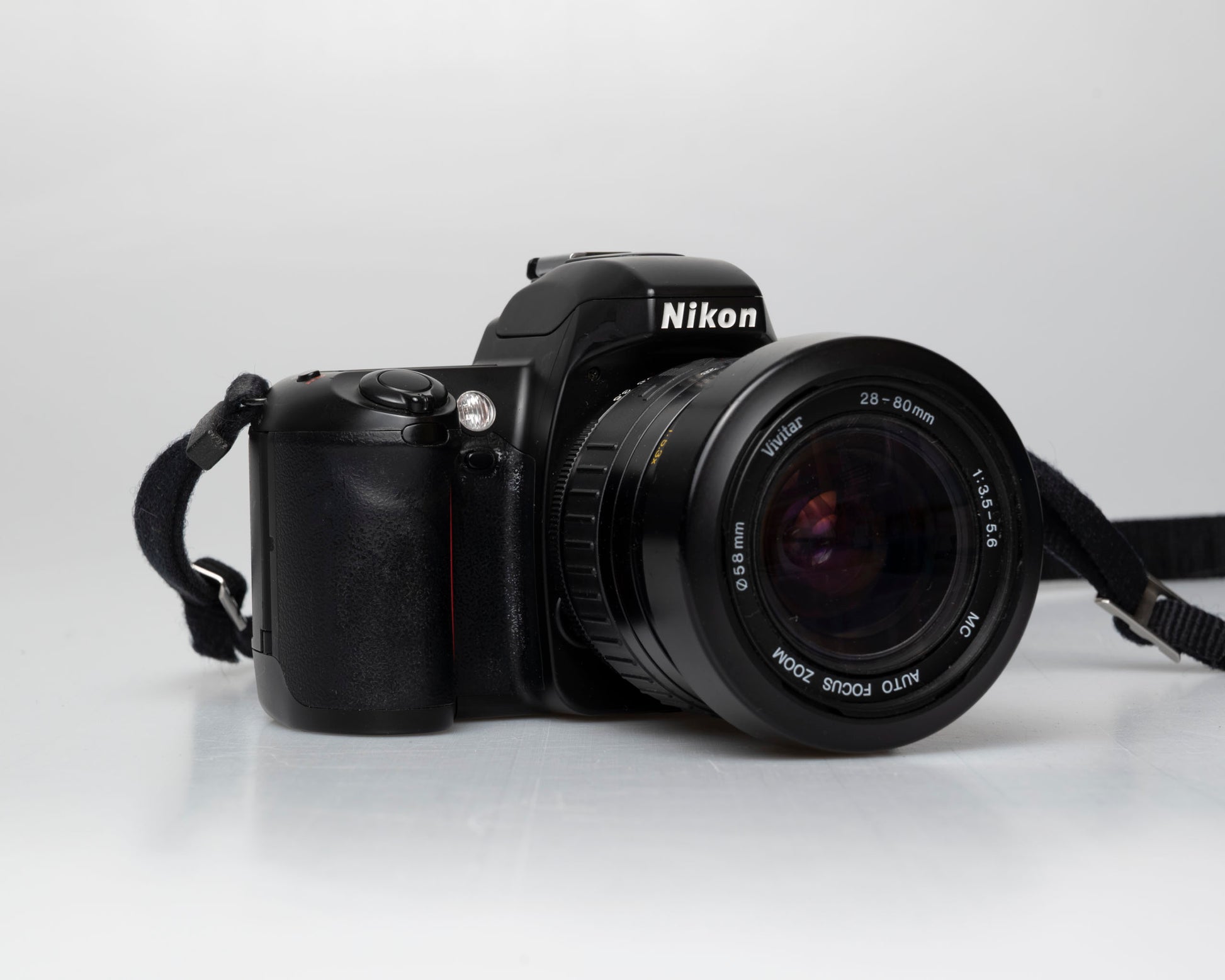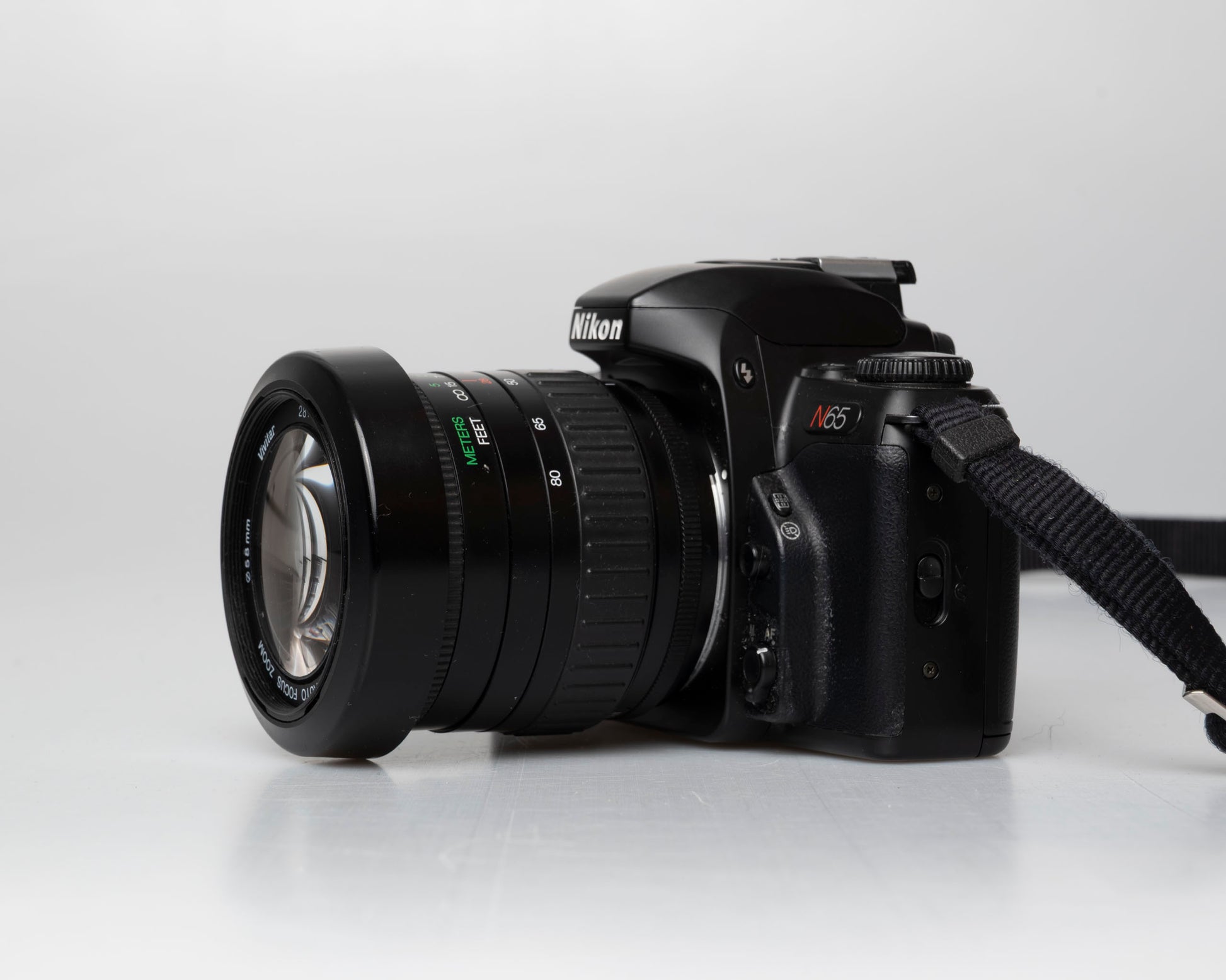 The Nikon N65 (called the F65 in some countries) is a sophisticated 35mm film SLR from the early aughts. The included lens is an autofocus Vivitar 28-80mm 3.5-5.6 zoom with a detachable hood.