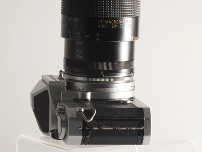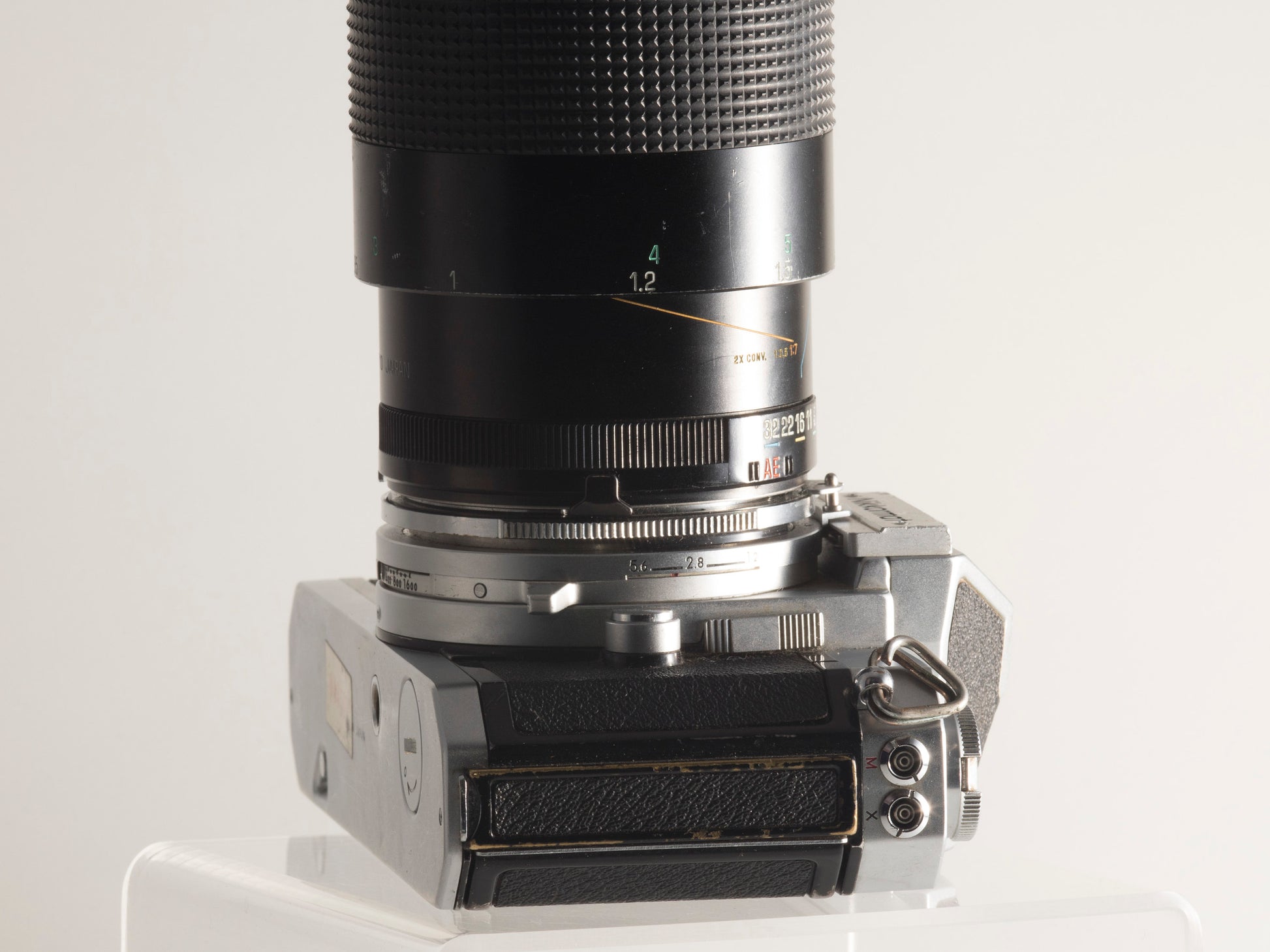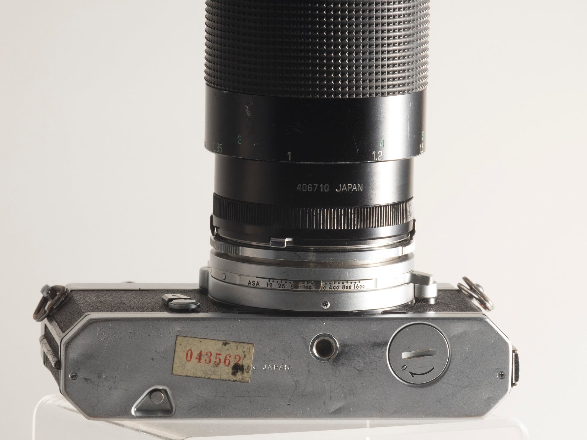 The camera (serial 4577527) and lens are in good aesthetic condition (see photos) and in excellent working condition. There is some minor dust in the viewfinder (does not affect photos). All shutter speeds were tested and verified to be accurate* and free of capping or any other issues. The camera and lens were tested with film and delivered excellent results.