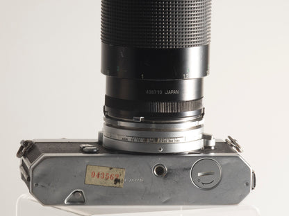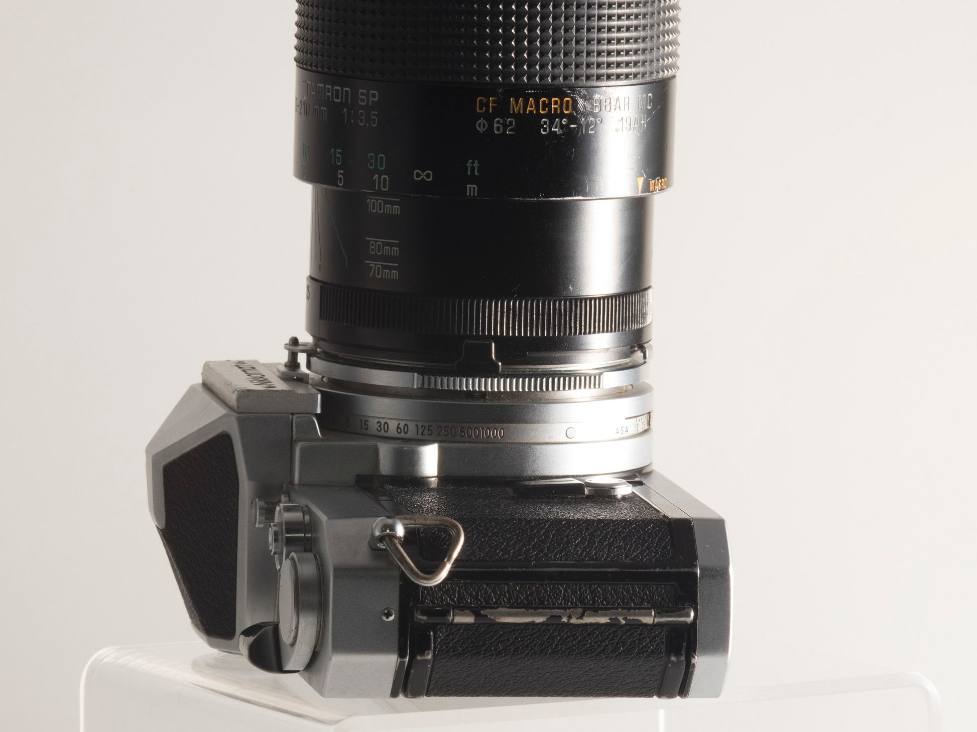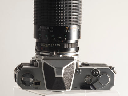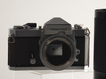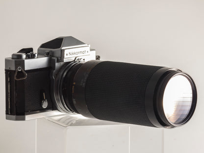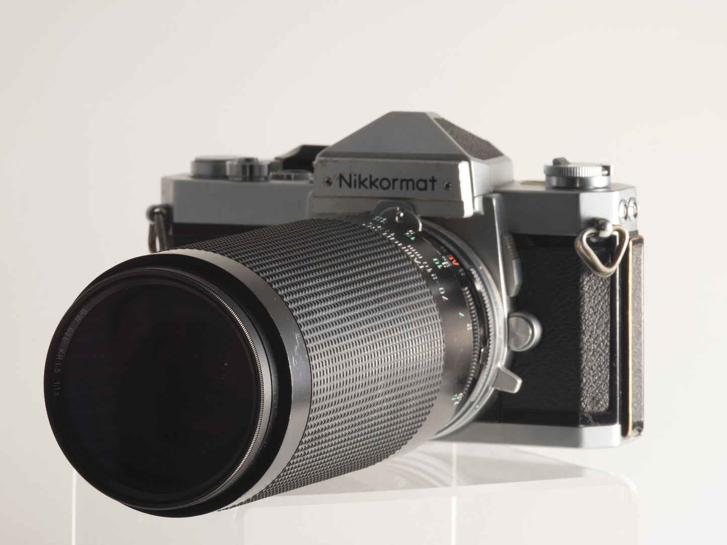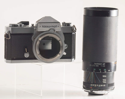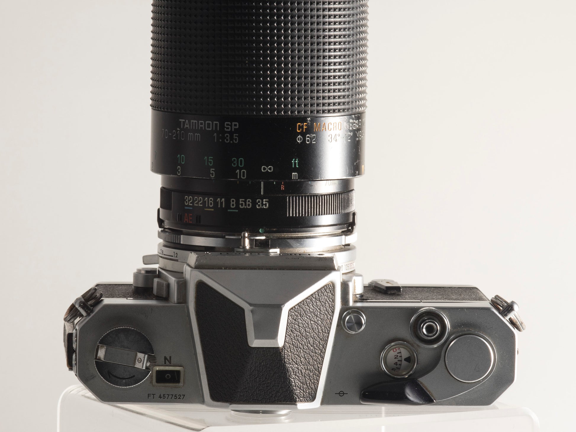 The Nikkormat FTn is a classic Nikon F-mount manual focus, mechanical 35mm film SLR from the 1970s and the included lens is a Tamron SP 70-210mm f3.5 lens. This is a very versatile and reliable camera and lens combination. The FTn is a very elegant design with a number of features to appeal to advanced users like: a depth of field preview button beside the shutter release; a mirror lockup switch; light meter readable both through the viewfinder and in a window on top of the camera.