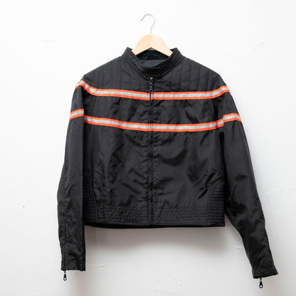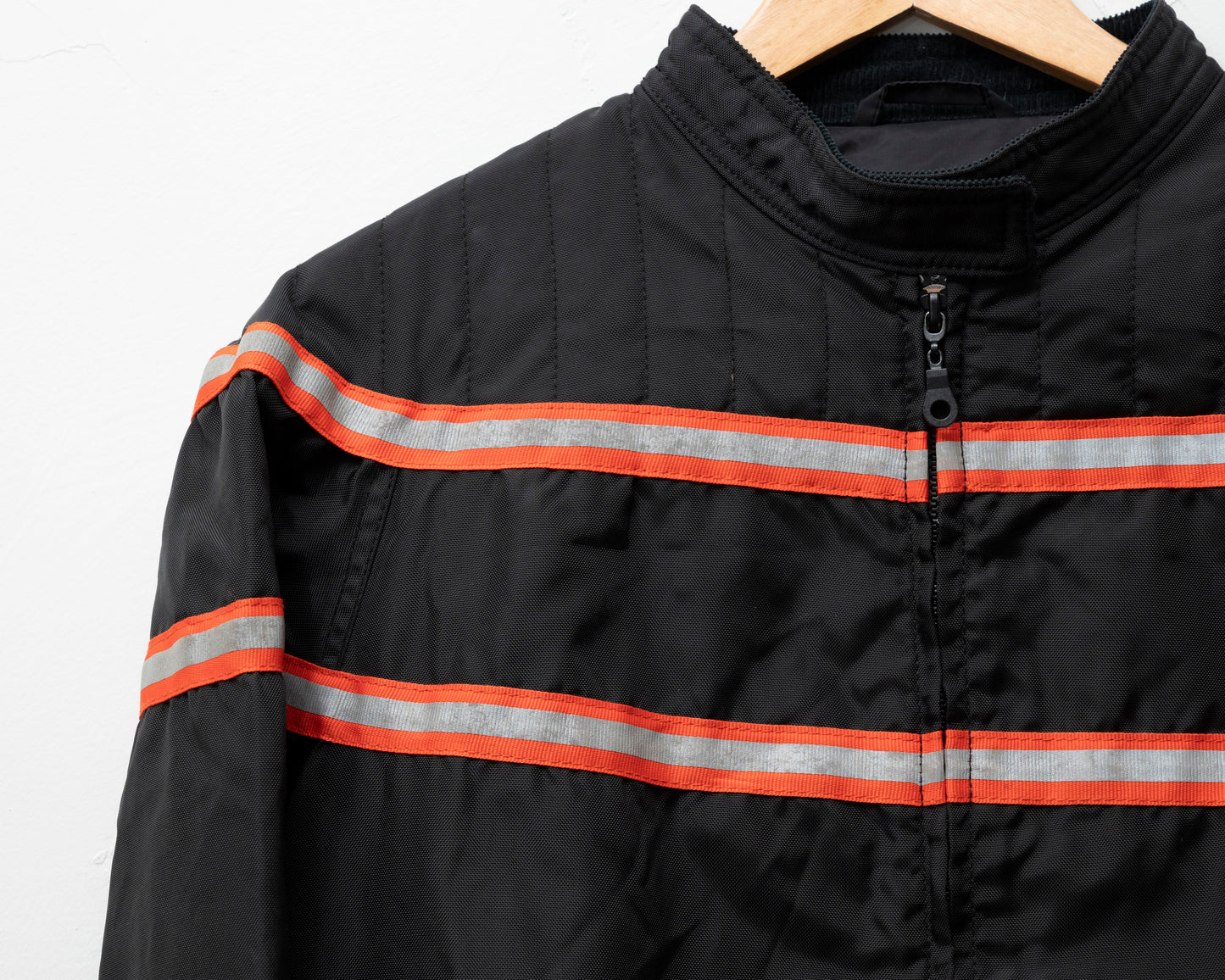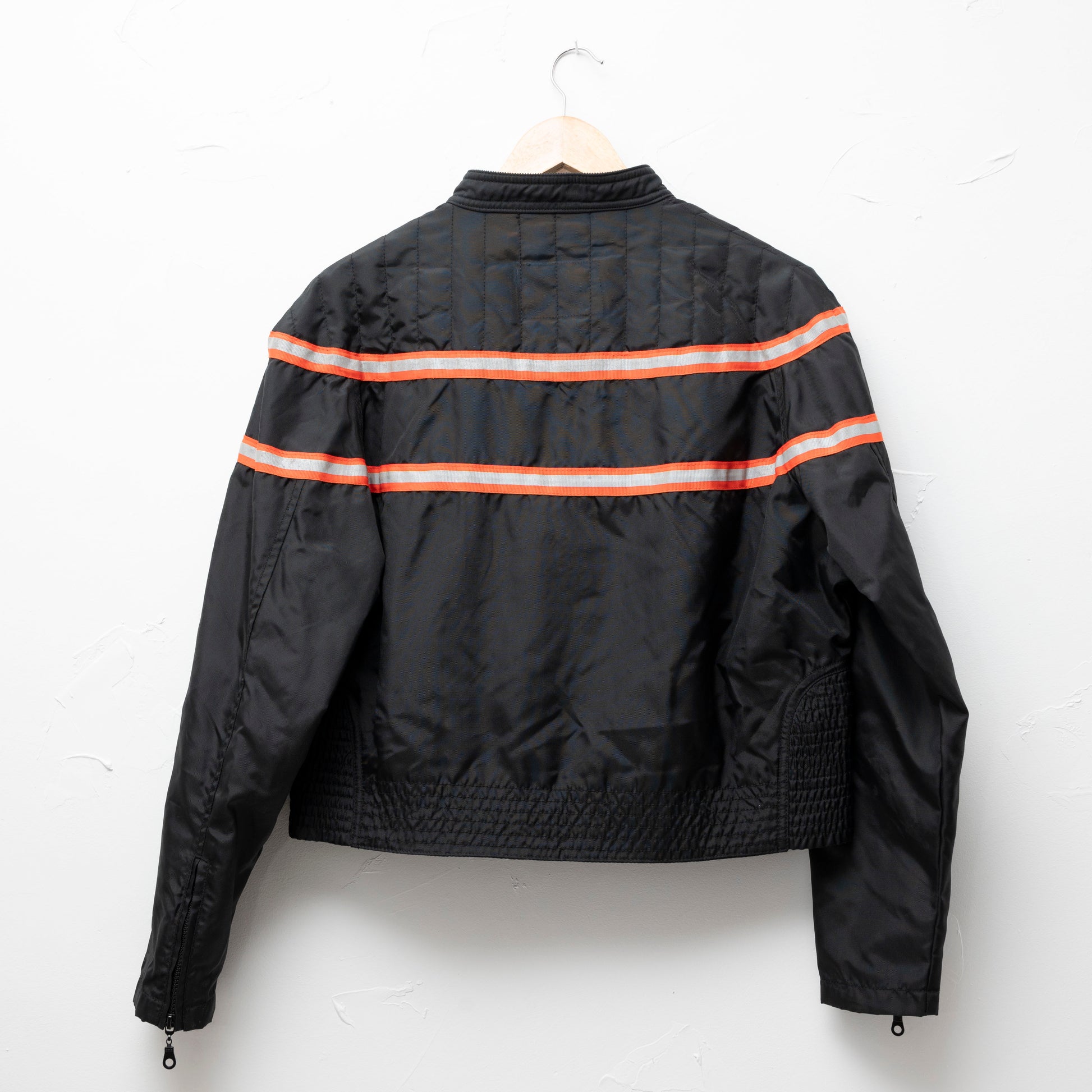 Black nylon biker jacket with orange and silver reflective safety detail. Racer collar with velcro attachment. Cropped, boxy fit. Made by USA Biker Design.