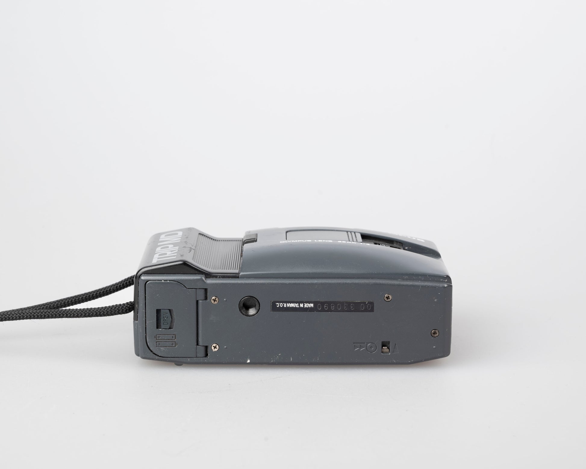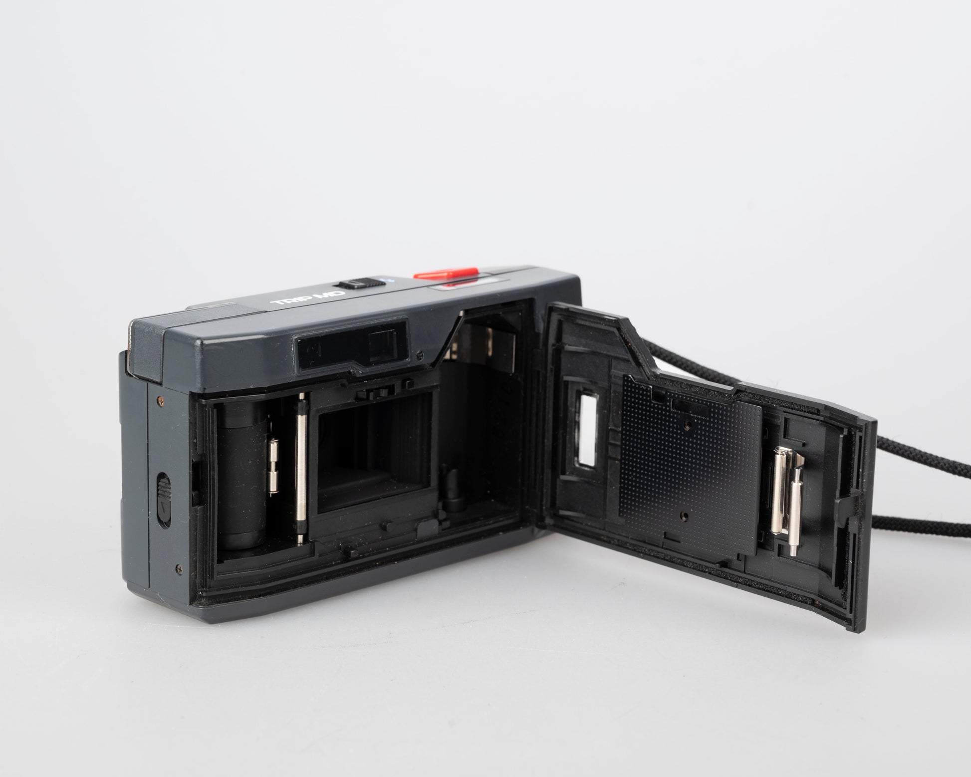 The Olympus Trip MD is a very easy-to-use focus-free 35mm camera from the mid-1980s. A red light in the viewfinder tells you the light is too low and you should use the pop-up flash.