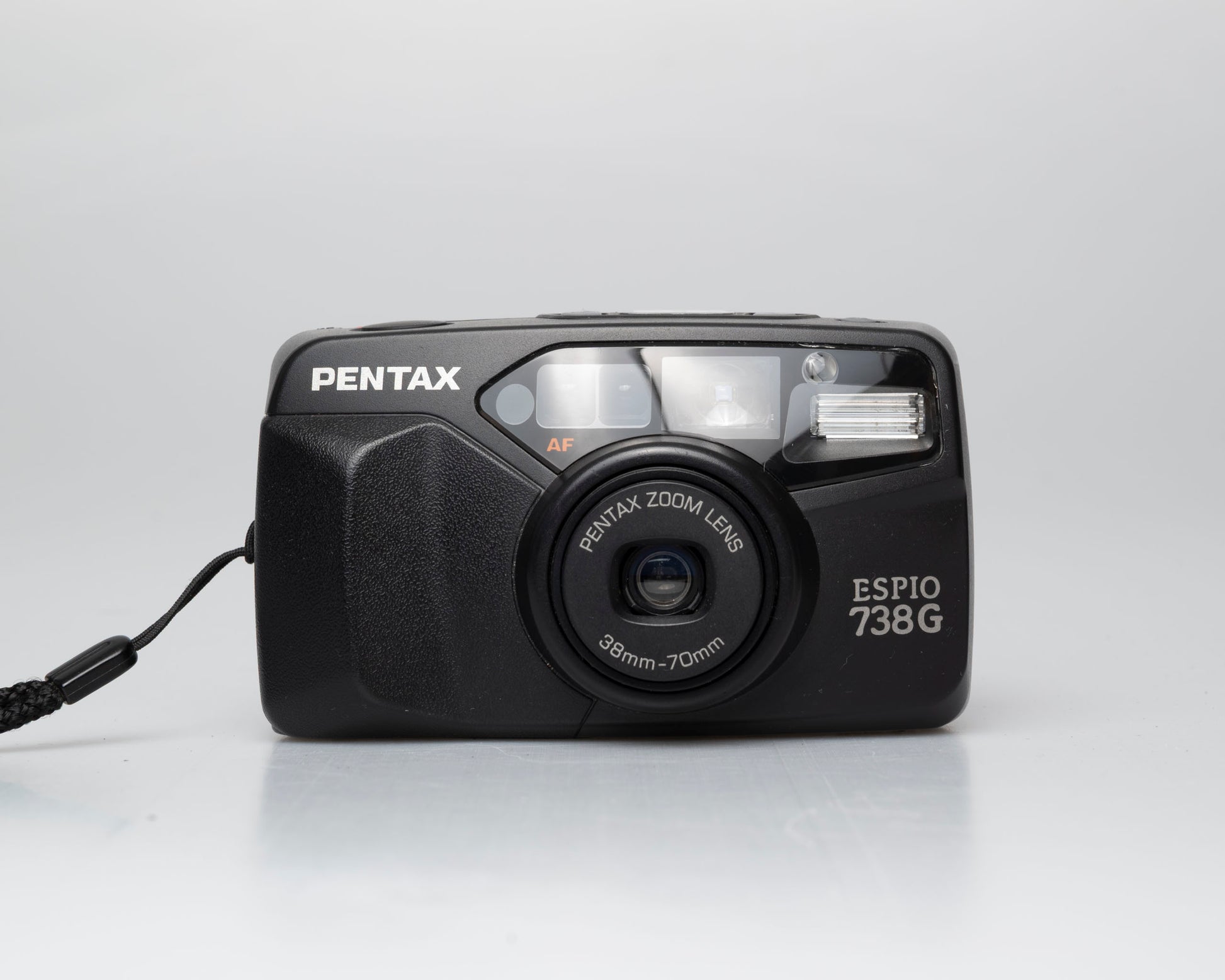 The Pentax Espio 738G is a compact 35mm point-and-shoot camera with a high quality 38-70mm zoom lens.
