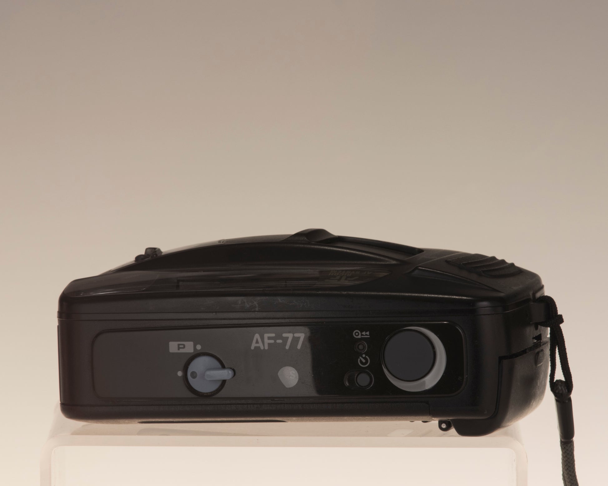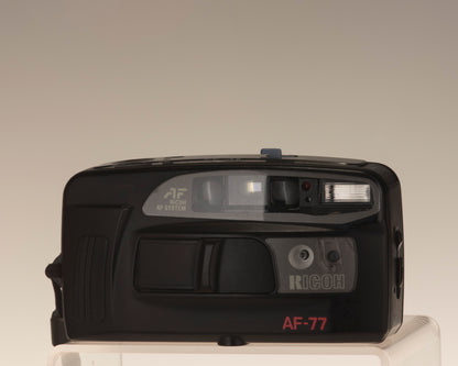 The Ricoh AF-77 is a simple 35mm autofocus point and shoot camera with fixed 35mm wide angle lens. It requires two AA batteries (not included).
