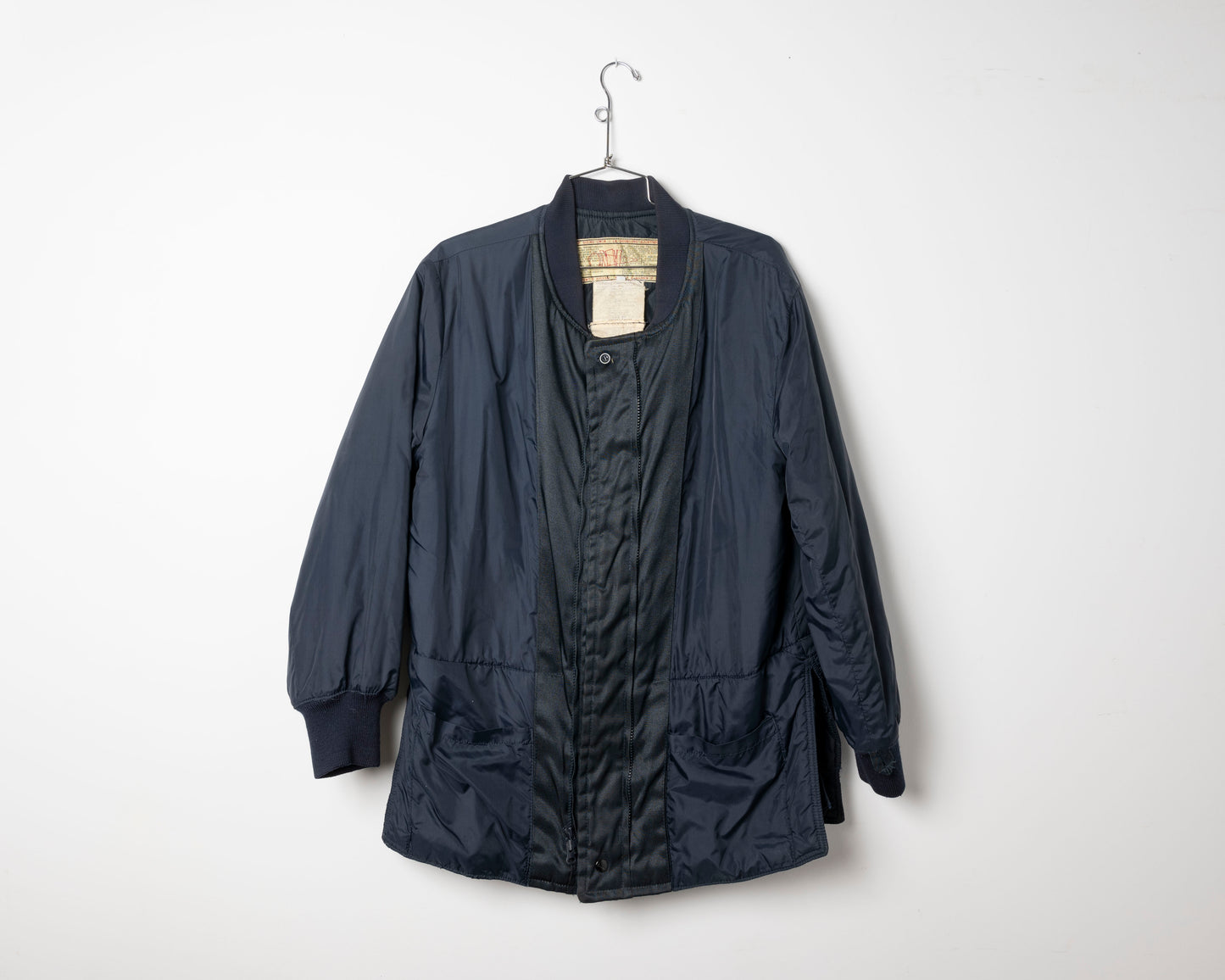 This is an interesting "self-sizing" jacket liner made by Montreal company Evin in 1980. The very wordy, bilingual tag notes that the liner can be worn as a separate jacket. They also "invite comments and shall reward original ideas". On the inside breast pocket, it reads, "It is a funny thing about life-if you refuse to accept anything but the best you very often get it." The jacket has robust zippers, interior wind blocking belt, satin placket, and pockets. An unique variation of a utilitarian classic. Marked a size 38.