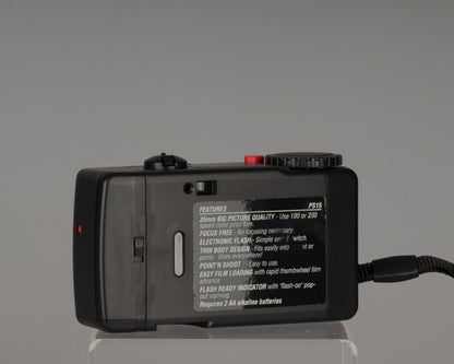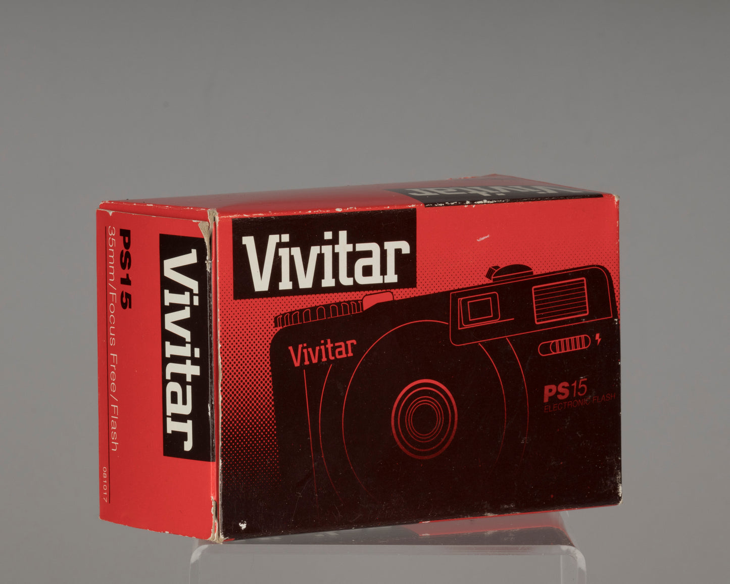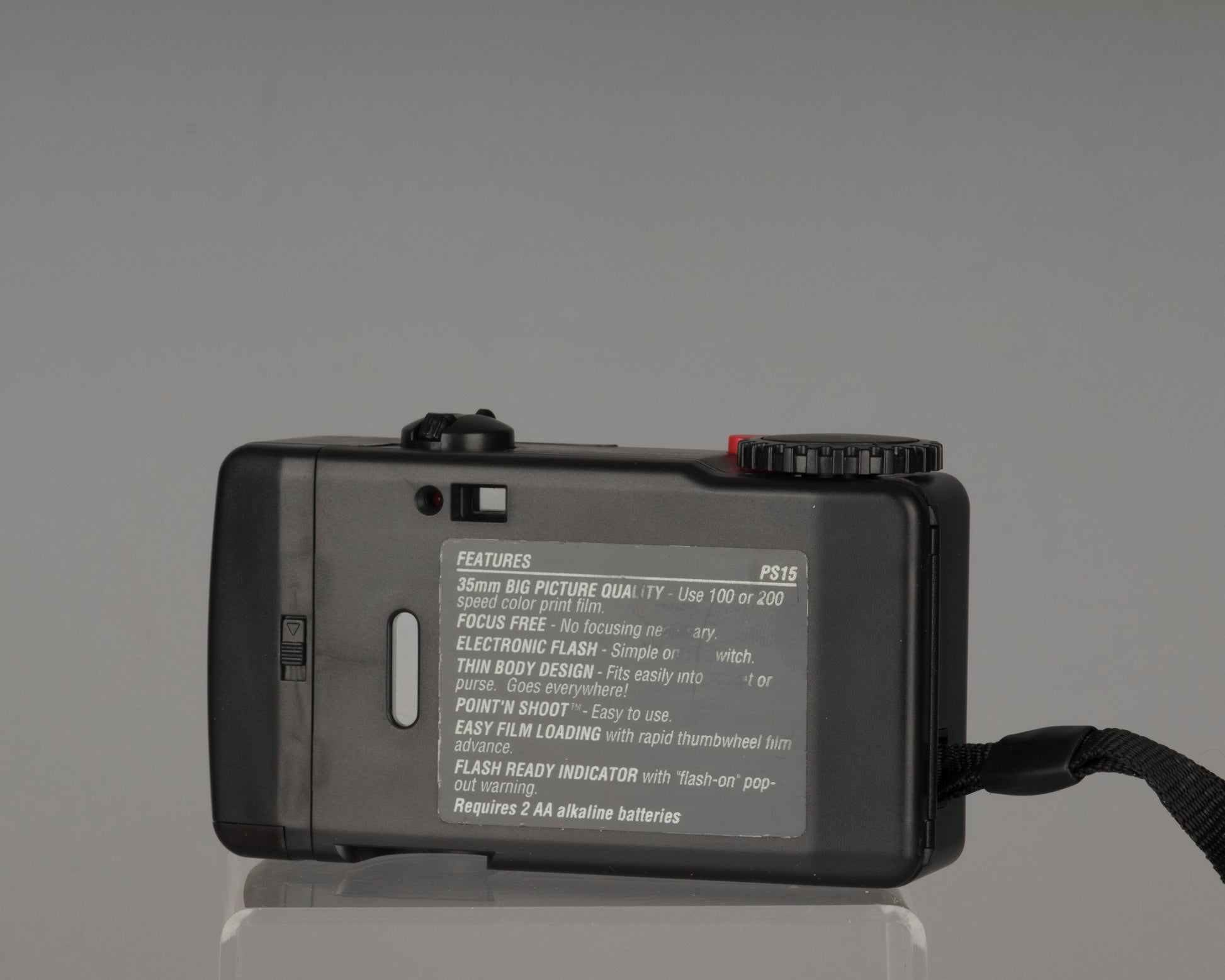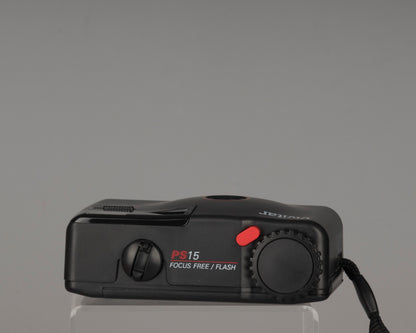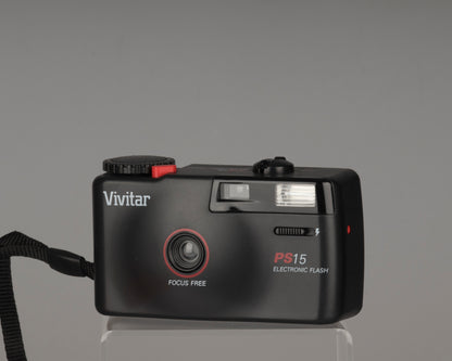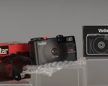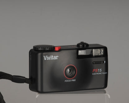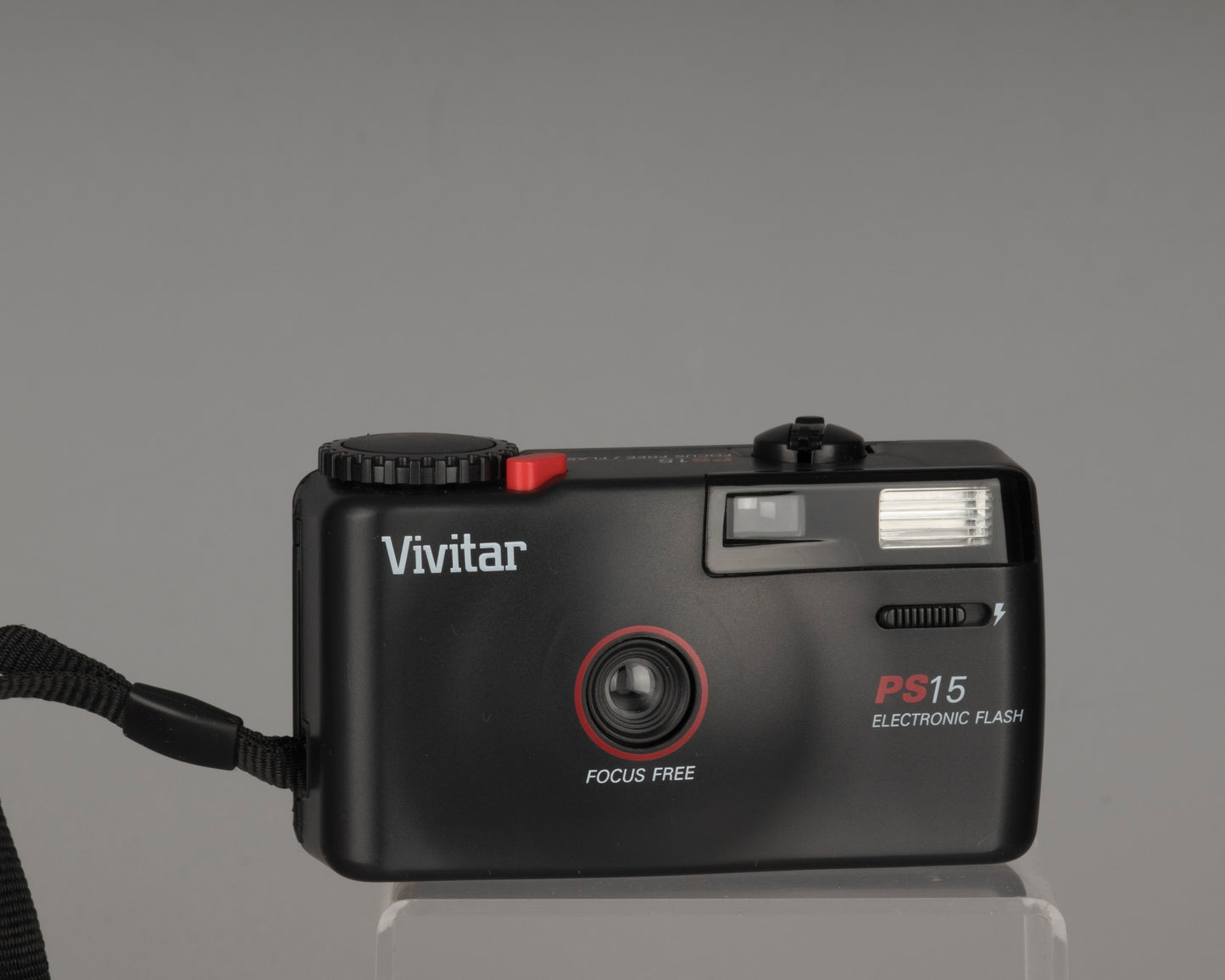 The Vivitar PS 15 is a simple mechanical 35mm film camera with electronic flash. It's designed for use with color negative film (ideally ISO 100 or 200). This example is new old stock condition.