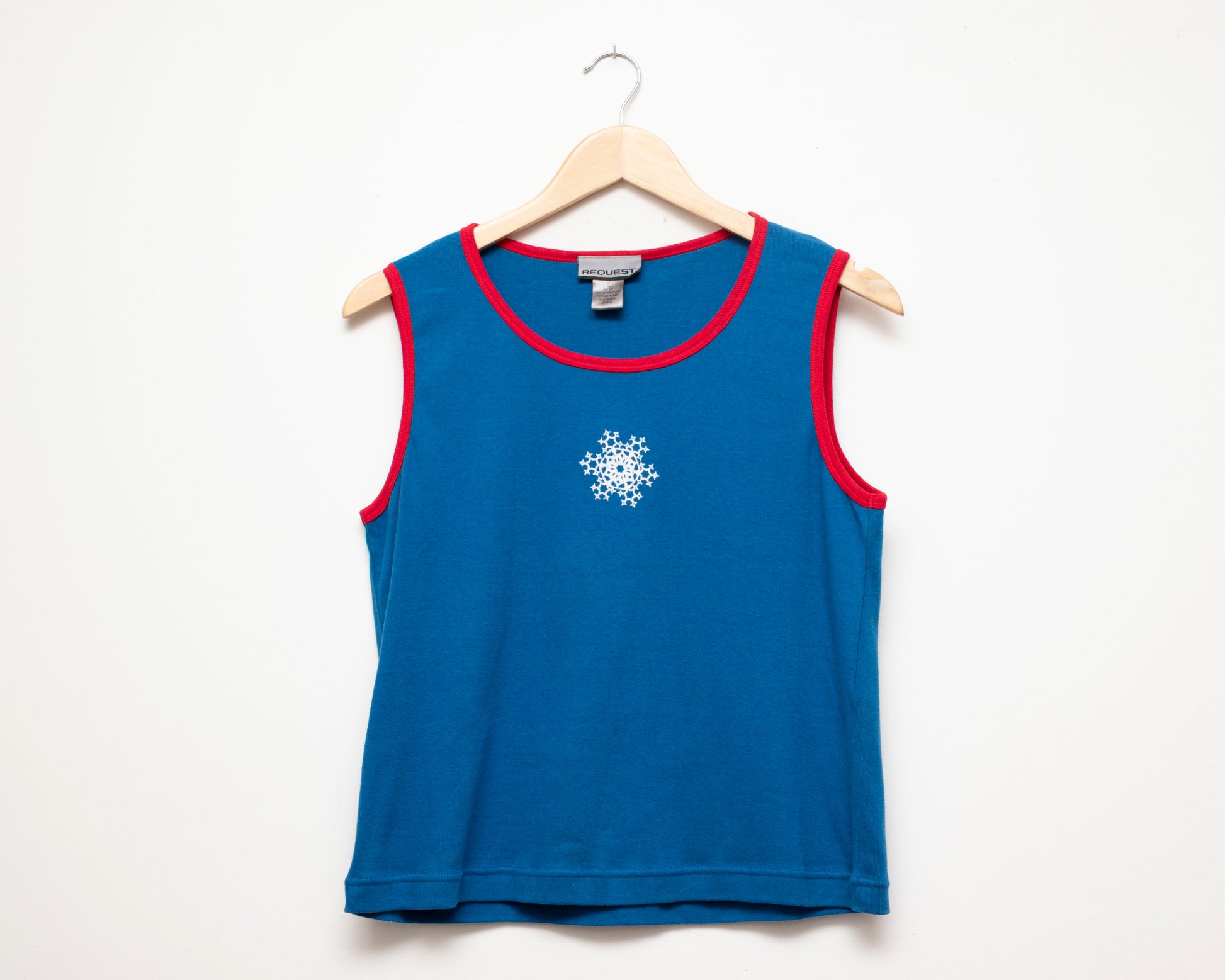 Request Jeans royal blue sleeveless t-shirt with red mounted collar and centred snowflake/star graphic.
